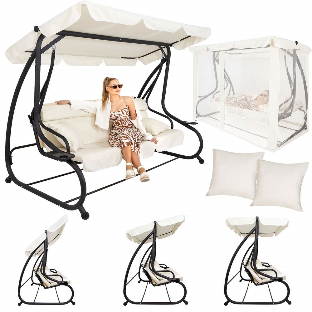 Luxusná záhradná hojdačka pre 4 osoby s odnímateľnou moskytiérou, prepychovo polstrovaným sedákom, podhlavníkom po celej dĺžke operadla a 2 vankúšmi. Masívna kovová konštrukcia, fukcia lôžka, nastaviteľný sklon striešky, držiaky nápojov, nosnosť 320 kg.
