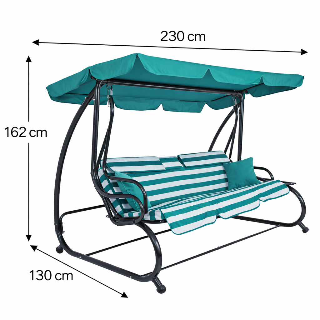 Stabilná konštrukcia zaisťuje vysokú nosnosť až 350 kg a dlhú životnosť . Vodeodolný materiál a ochrana proti korózii umožňujú bezproblémové vonkajšie použitie. Nastaviteľná strieška chráni pred slnkom a pružinové uchytenie zaisťuje plynulé a bezpečné hojdanie .