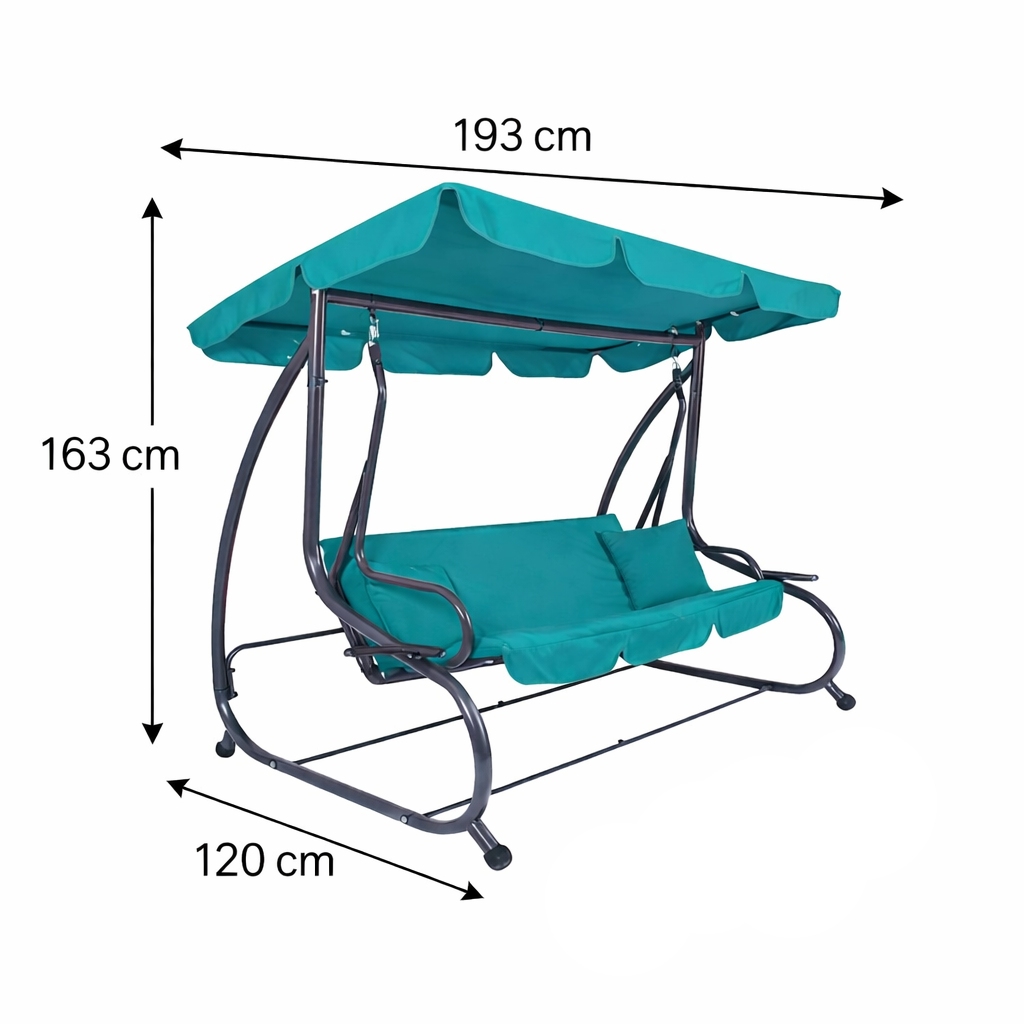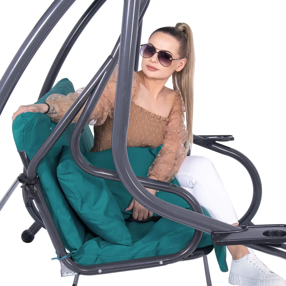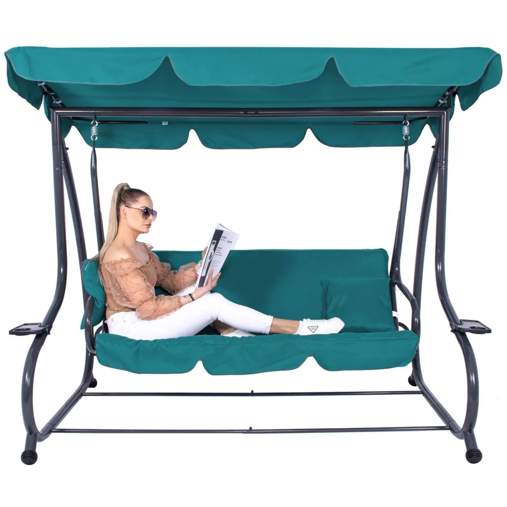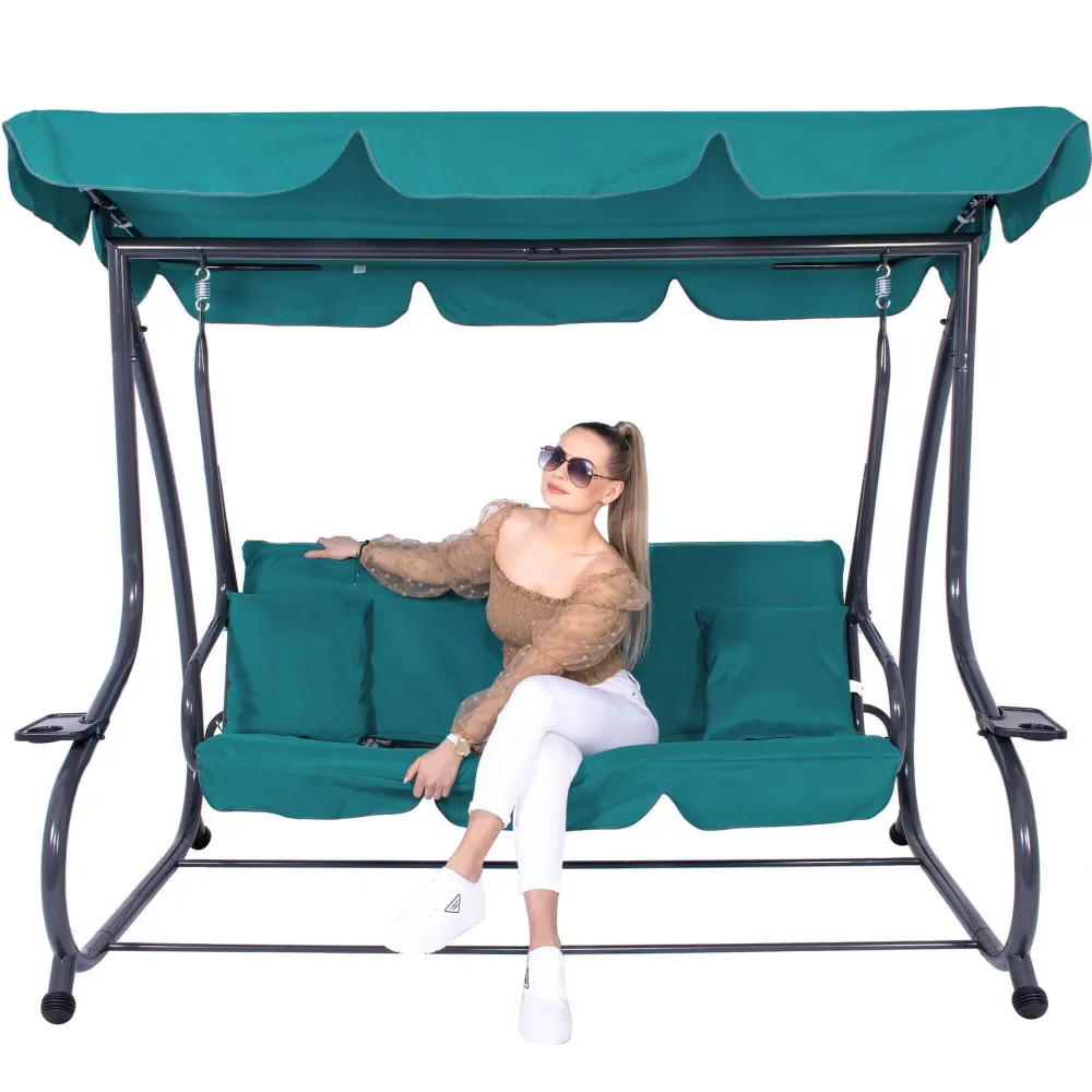 Záhradná hojdačka 3-miestna, tyrkysová SPRINGOS VENEZIA poskytuje veľkorysý priestor pre odpočinok aj spoločné chvíle . Vďaka funkcii lôžka, pohodlnému podsedáku a dvom vankúšom si užijete relaxáciu na maximum. Praktické držiaky nápojov zvyšujú pohodlie pri každom posedení.