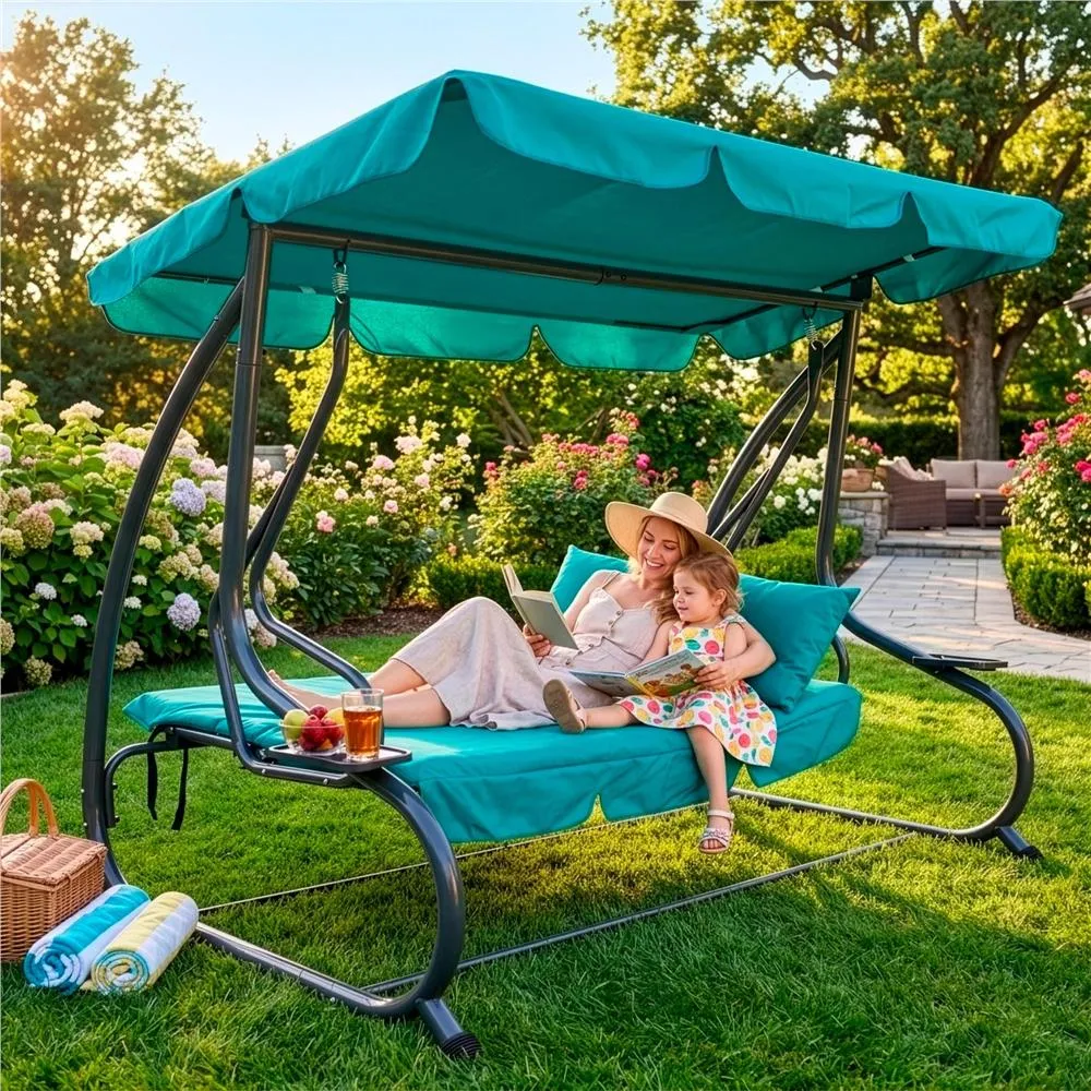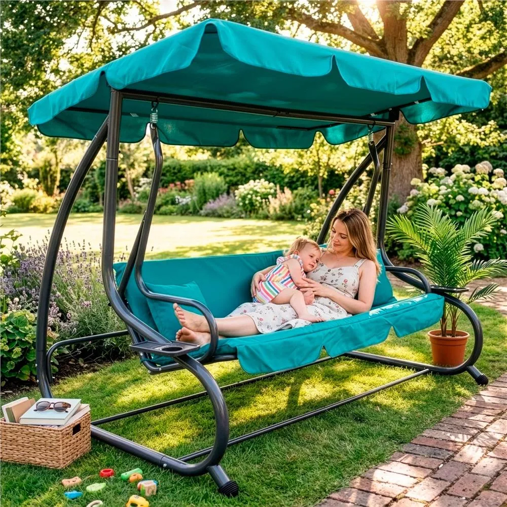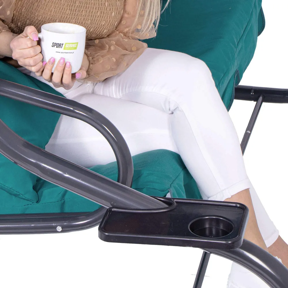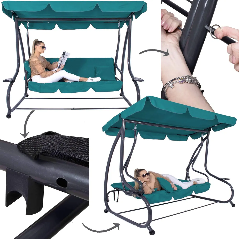 Záhradná hojdačka 3-miestna, tyrkysová SPRINGOS VENEZIA poskytuje veľkorysý priestor pre odpočinok aj spoločné chvíle . Vďaka funkcii lôžka, pohodlnému podsedáku a dvom vankúšom si užijete relaxáciu na maximum. Praktické držiaky nápojov zvyšujú pohodlie pri každom posedení.