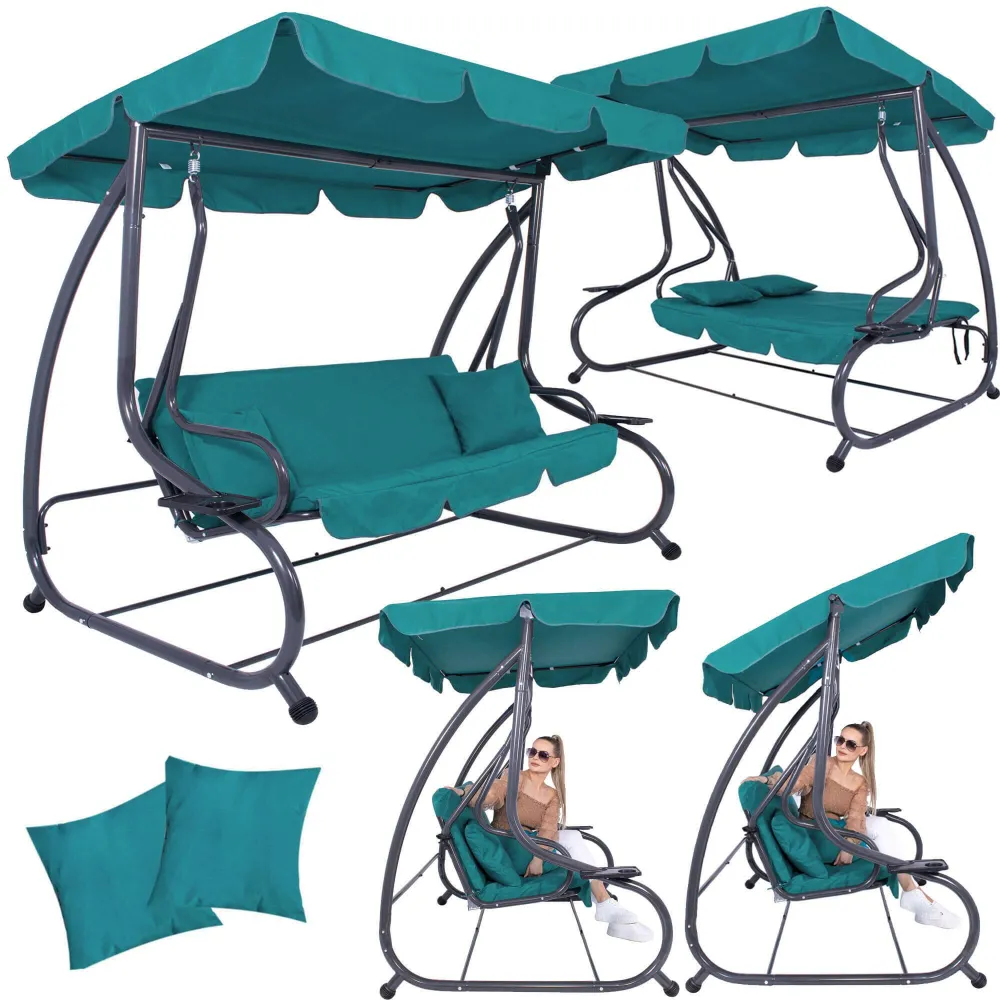 Záhradná hojdačka Springos pre tri osoby vám umožní relaxovať na čerstvom vzduchu po náročnom dni. Pohovka má tyrkysovú farbu, ktorá je túto sezónu módna, a pohodlný sedák s vankúšikmi. Jeho stabilná konštrukcia zaisťuje bezpečnosť používania a nastaviteľný šilt dokonale chráni pred slnkom. Rám hojdačky je vyrobený zo silných odolných trubiek. Na konci nožičiek sú protišmykové prvky, ktoré dodatočne stabilizujú nábytok. Špeciálna bezpečnostná poistka chráni hojdačku proti samovoľnej montáži. Hojdačku môžu používať až 3 osoby súčasne, pretože jej maximálna nosnosť je až 280 kg.