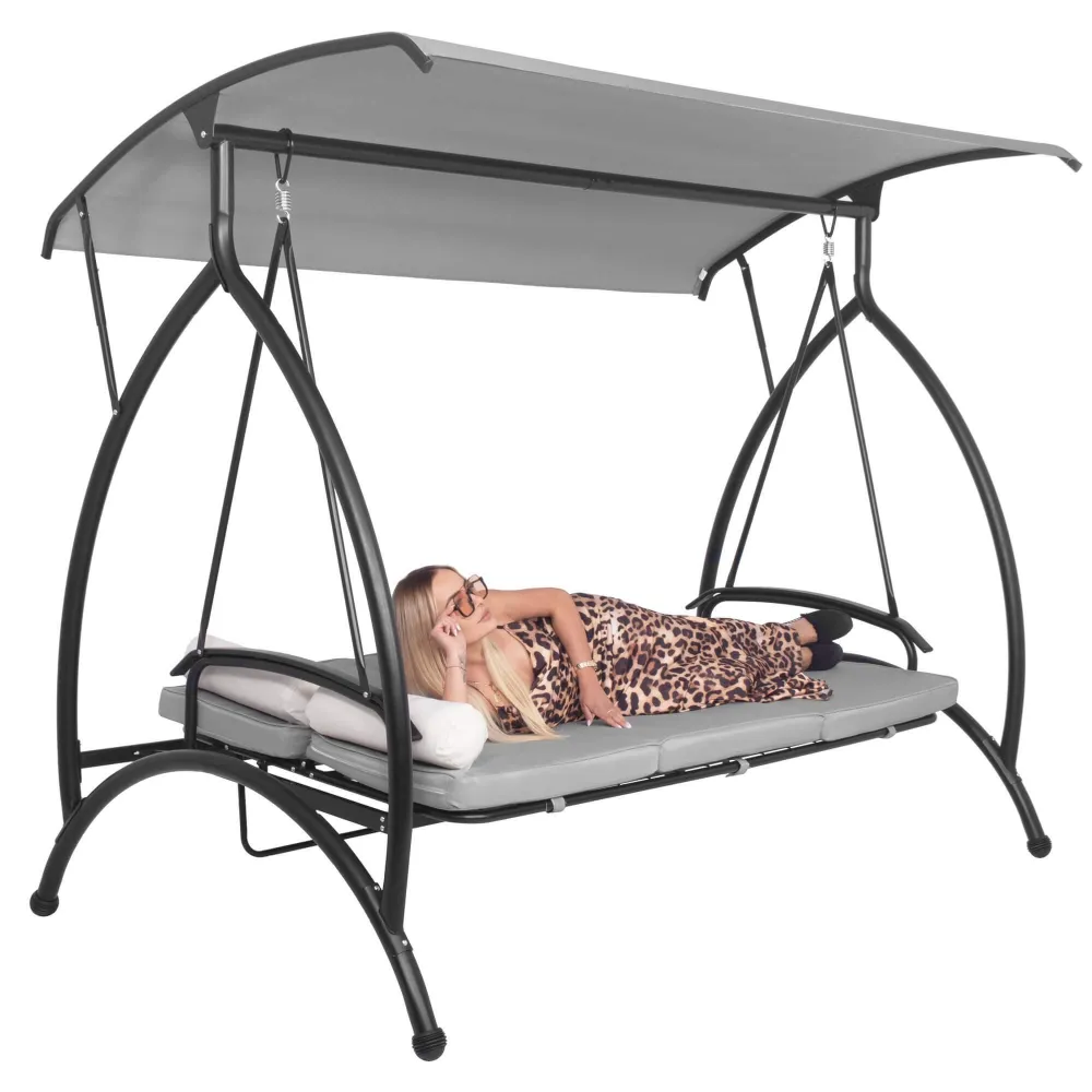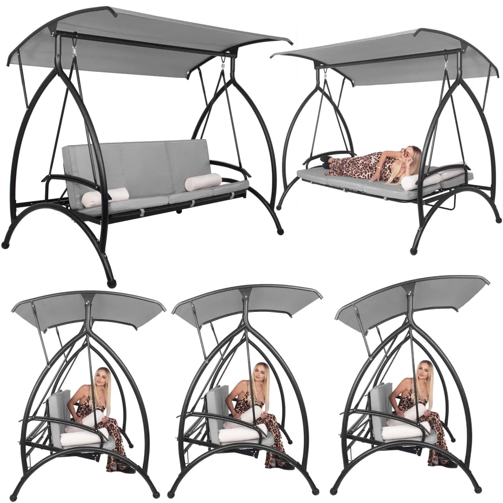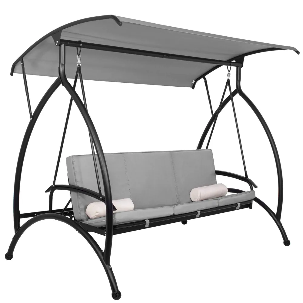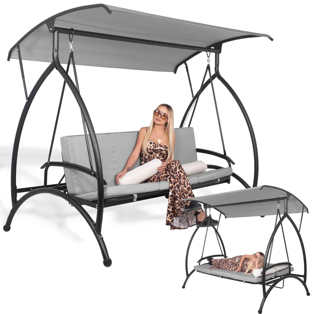 Komfortná záhradná hojdačka pre 3 osoby s pohodlným polstrovaním, vankúšmi a funkciou lôžka. Šedá farba, nosnosť 330 kg. Stabilný rám odolný proti poškodeniu. Vodeodolný materiál. Ochrana proti korózii. Nastaviteľná strieška. Pružinové uchytenie. Protišmykové konce nôh.