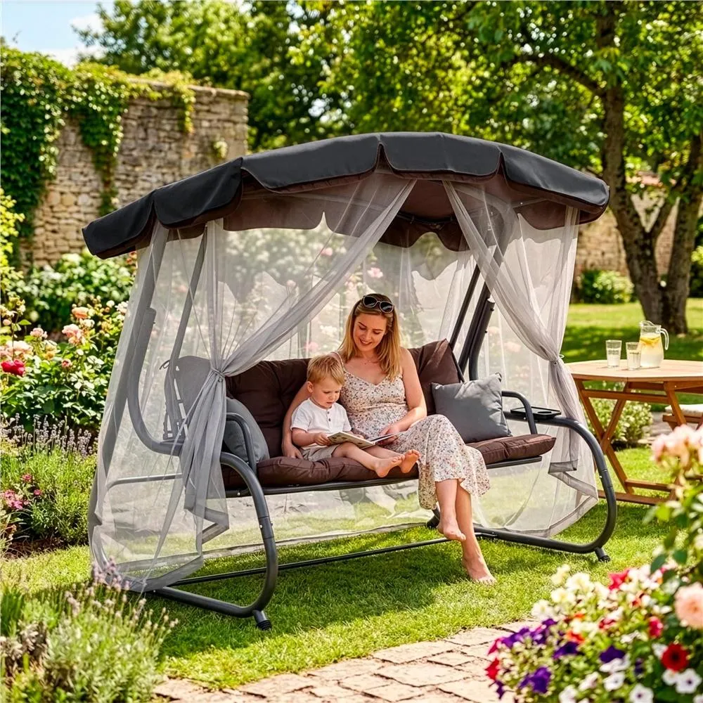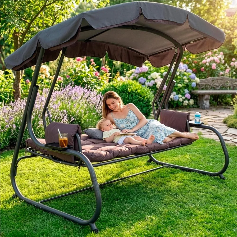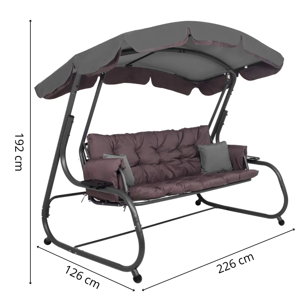 Záhradná hojdačka 3-4 miestna, hnedá SPRINGOS DIANA poskytuje veľkorysý priestor pre odpočinok aj spoločné chvíle . Vďaka funkcii lôžka, pohodlnému podsedáku a dvom vankúšom si užijete relaxáciu na maximum. Praktické držiaky nápojov zvyšujú pohodlie pri každom posedení.