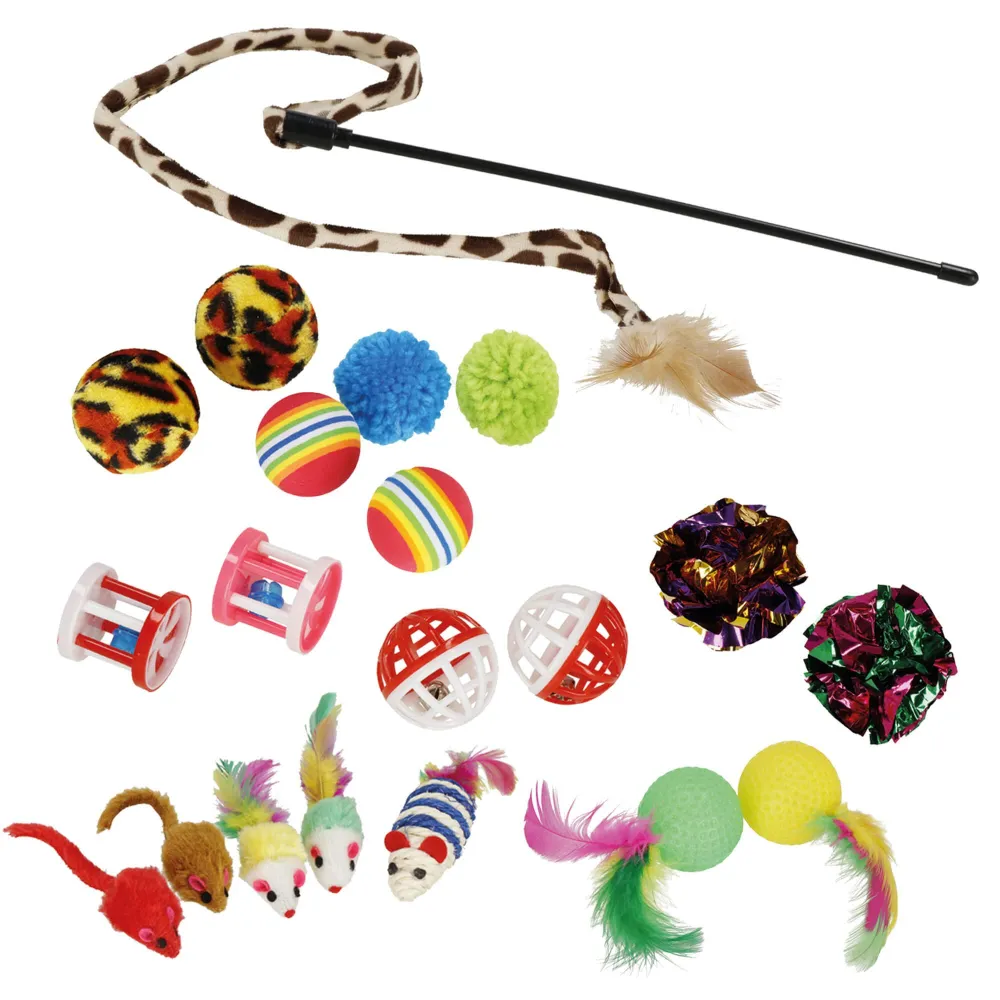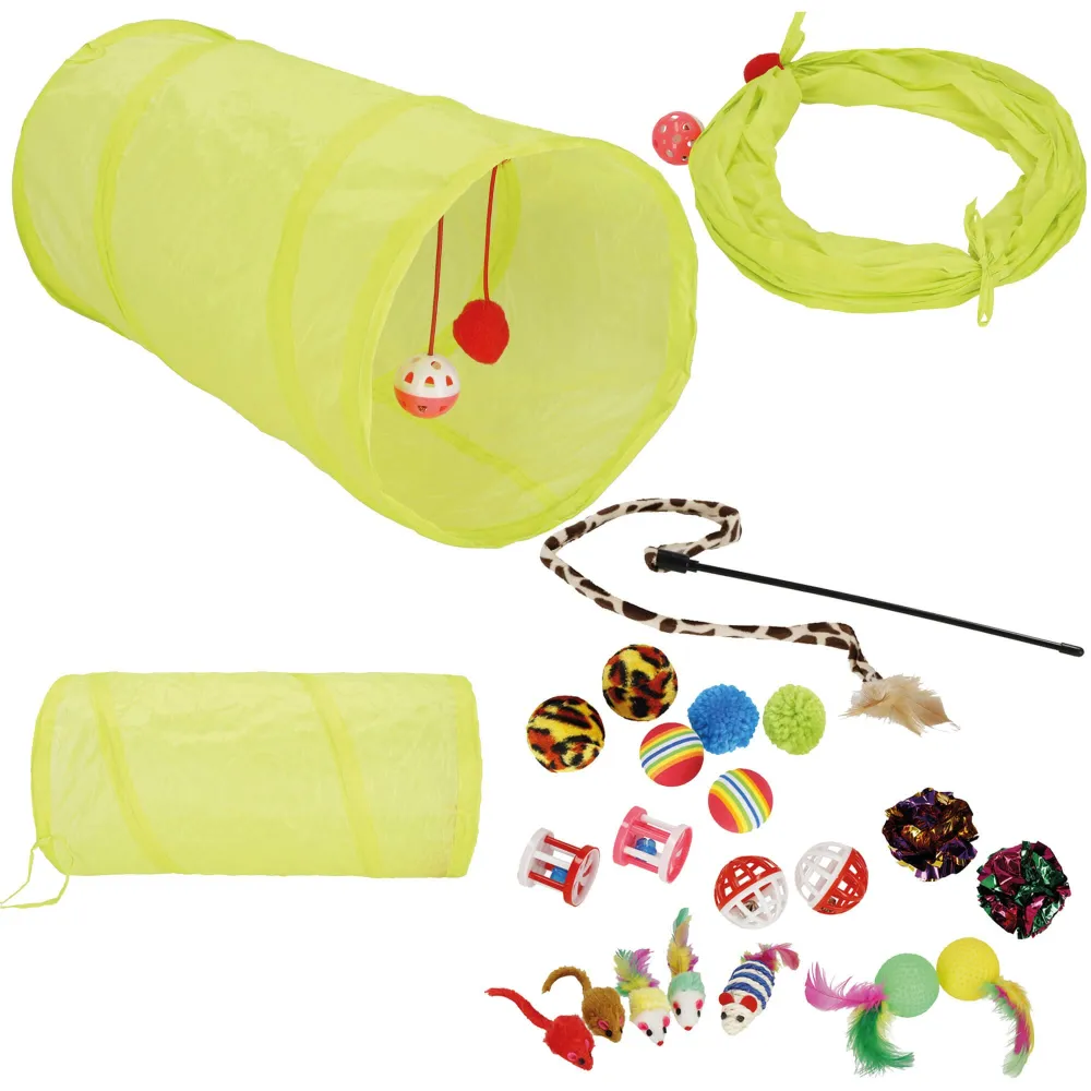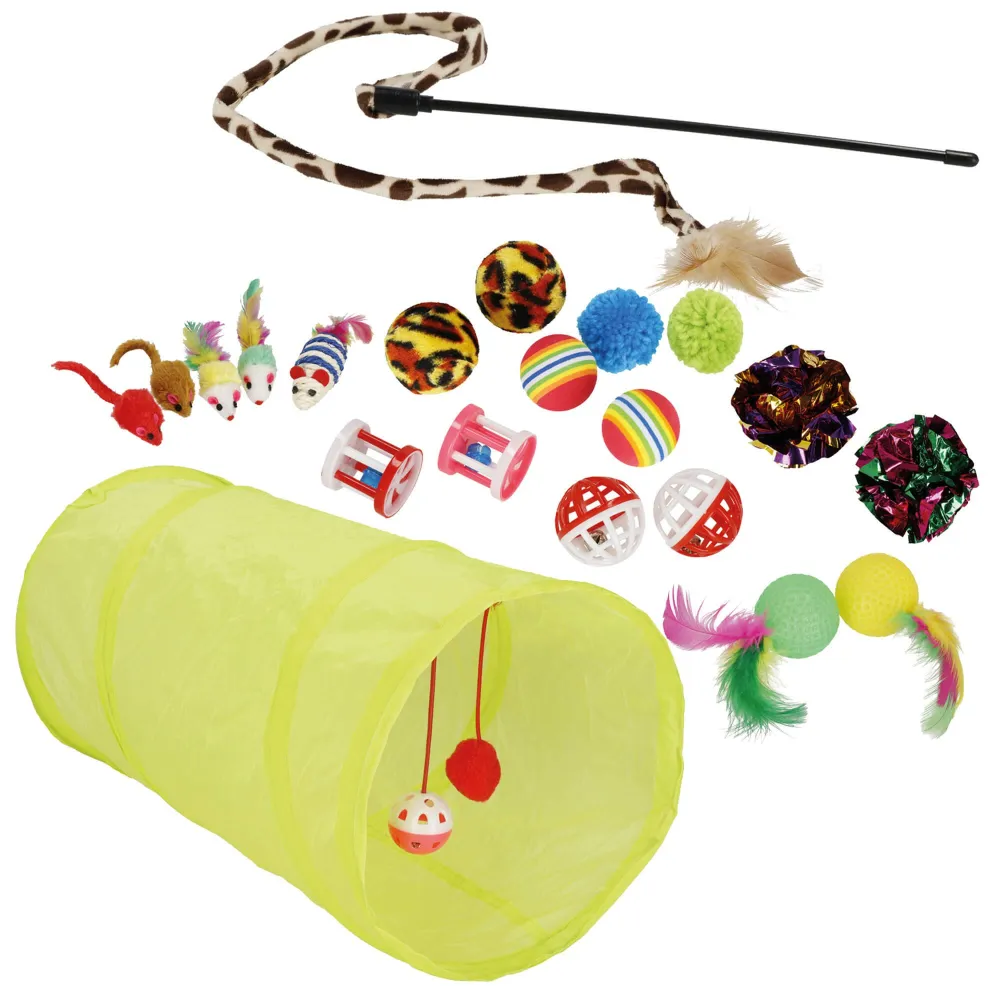 Sada obsahuje 21 prvkov , medzi ktorými nechýba veľký mačací tunel, cumlík s perím a ďalšie hračky , ktoré sú navrhnuté tak, aby mačkám poskytovali nielen fyzickú aktivitu, ale aj mentálnu stimuláciu. Tunel podporuje behanie, skákanie a šplhanie , čo pomáha udržiavať mačku v kondícii a zároveň jej poskytuje priestor na skrývanie a lovenie. Udice s perím a drobné hračky umožňujú spoločné hranie, čo posilňuje vzťah medzi majiteľom a maznáčikom, zatiaľ čo samostatné prvky podporujú mačku v objavovaní nových spôsobov zábavy.