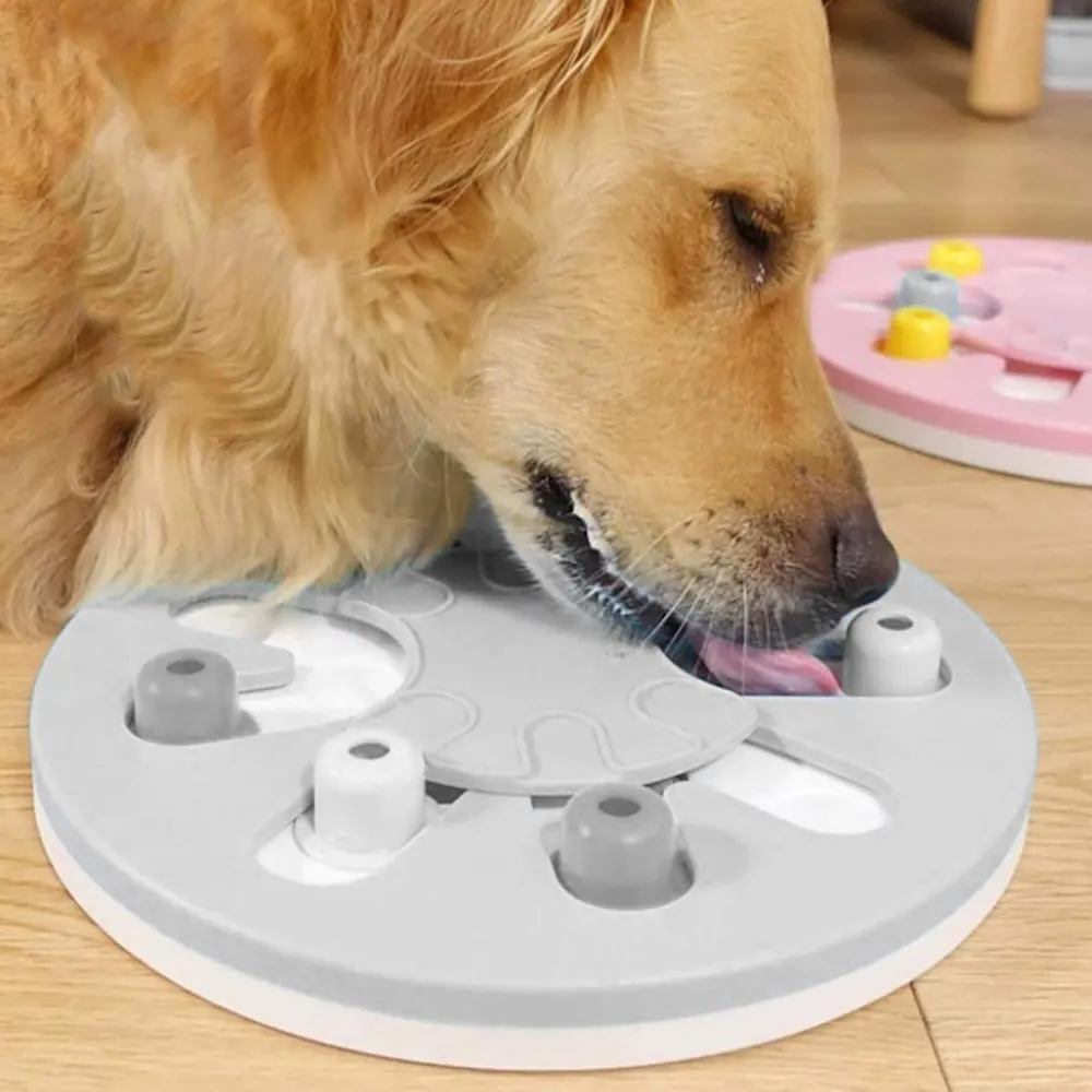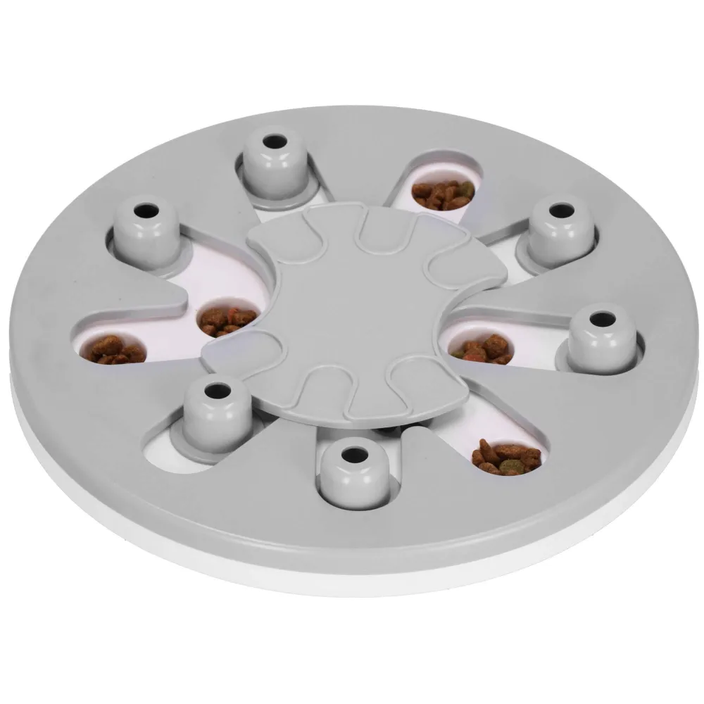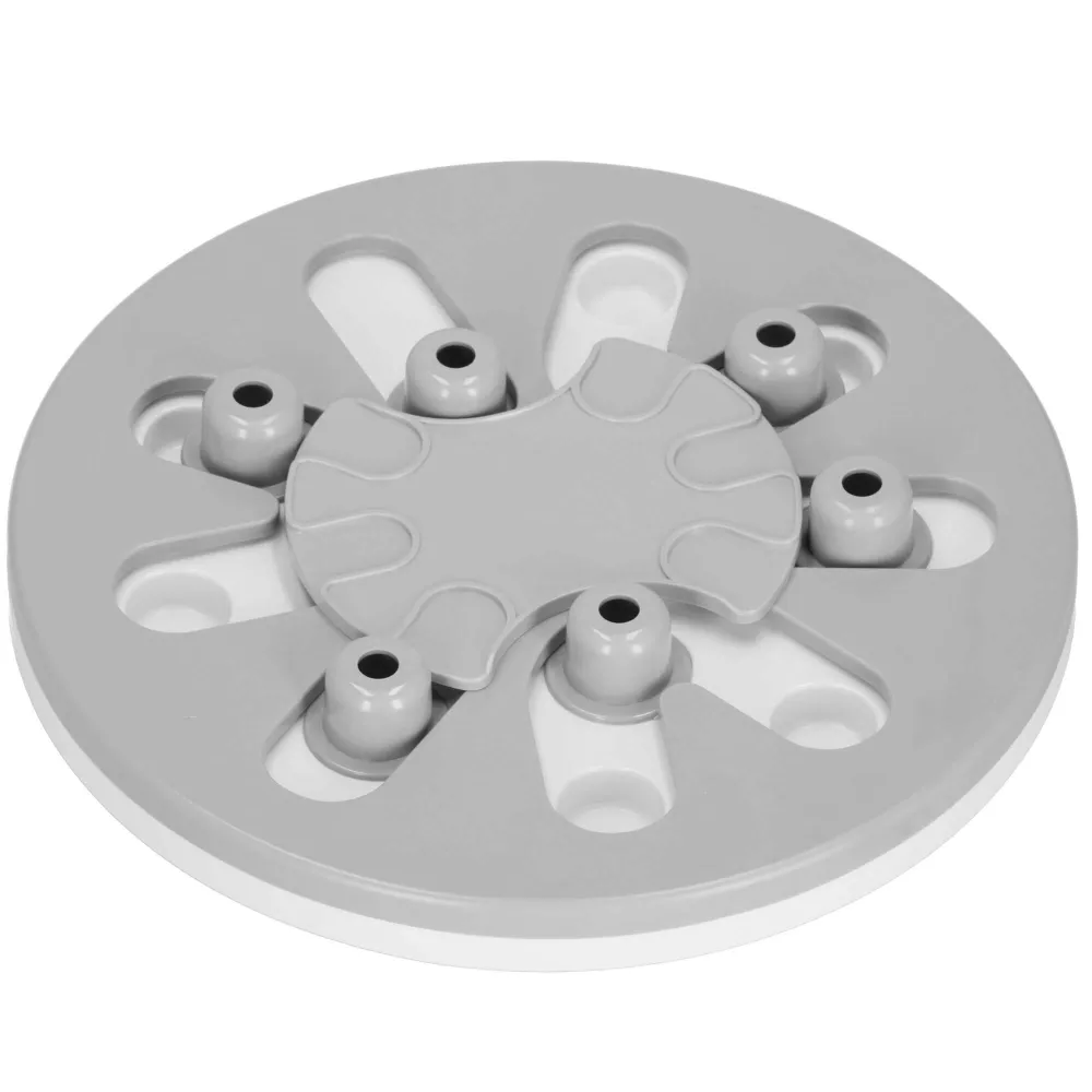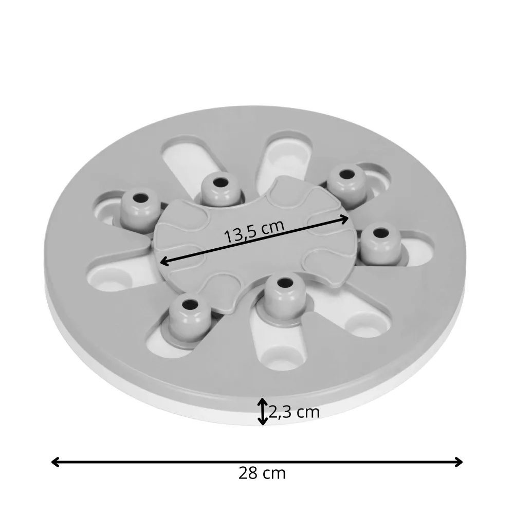 Skvelou interaktívnou hračkou pre psov je maškrtný hlavolam, ktorý poskytuje dlhotrvajúcu zábavu. Vďaka otočnému stredovému kolesu (360°) a pohyblivým častiam pes musí posúvať alebo otáčať prvky, aby získal maškrty. Protišmyková základňa zaisťuje stabilitu pri hre. Hračka stimuluje prirodzené čuchové inštinkty, pomáha znižovať stres a odvádza pozornosť psa od deštruktívneho správania. Ľahko sa čistí a je vyrobená z bezpečných a odolných materiálov.