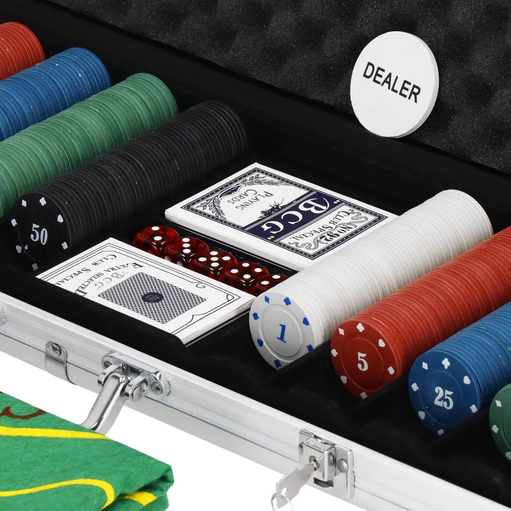 Kompletný pokerový set na Texas Hold´em s 500 žetónmi bude skvelou zábavou, nech už budete chcieť hrať kdekoľvek . Pokerová sada obsahuje všetko, čo potrebujete na začatie hry. Žetóny rôznych nominálnych hodnôt, karty s vysokou kvalitou tlače a žetóny špeciálnych funkcií. Hracia podložka a kocky sú navyše prvok, vďaka ktorým bude váš herný stôl profesionálny .