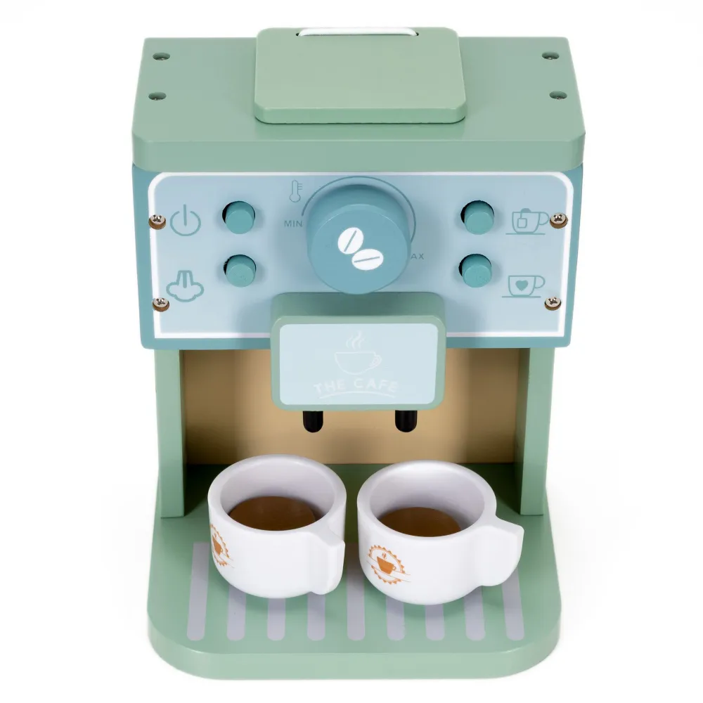 Drevený kávovar s realistickými cvakacími gombíkmi a odklopným vekom umožní deťom pripravovať vlastné „espresso“ ako v naozajstnej kaviarni. Súčasťou sú 2 šálky a žetóny na prípravu kávy. Podporuje kreativitu, jemnú motoriku aj sociálne zručnosti pri hre s ostatnými. Odolná drevená konštrukcia, ideálna pre malých baristov od 3 rokov.