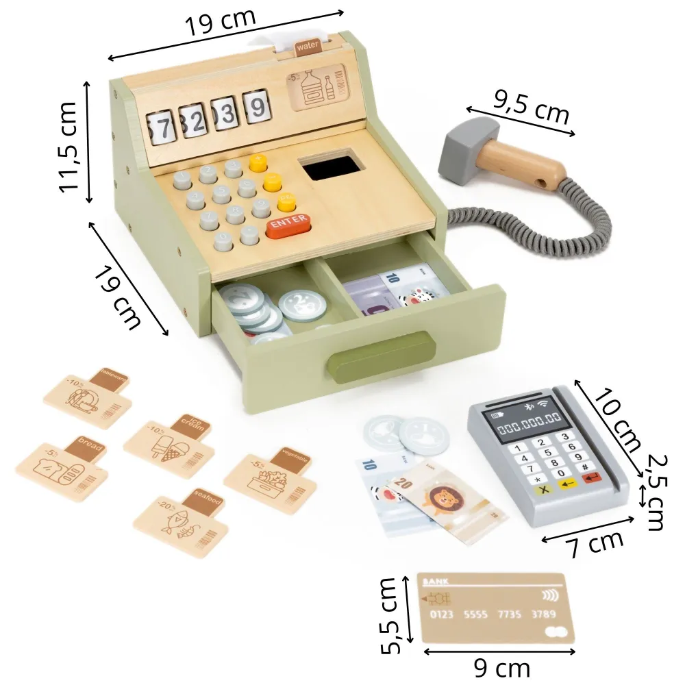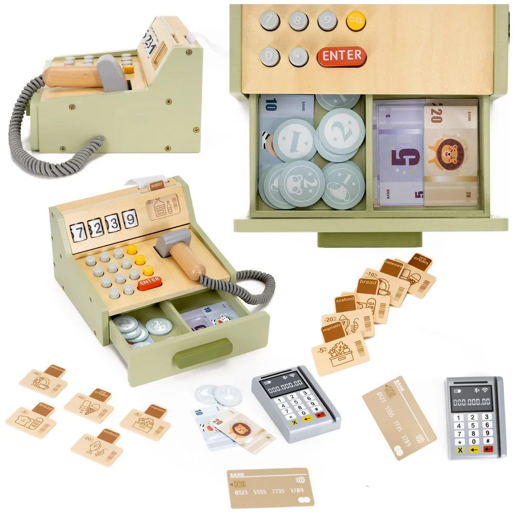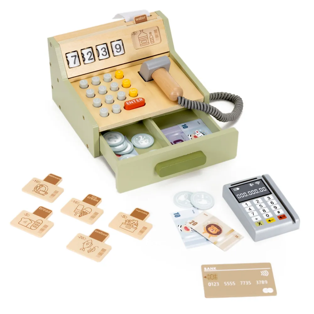 Drevená pokladňa s platobným terminálom prinesie deťom realistický svet nakupovania. Súčasťou je čítačka čiarových kódov, pokladničná tlačiareň, bankovky, mince, platobná karta aj zľavové cedule. Farebná 34 dielna súprava podporuje kreativitu, rozvoj predstavivosti a ponúka nekonečnú zábavu pre deti od 3 rokov.