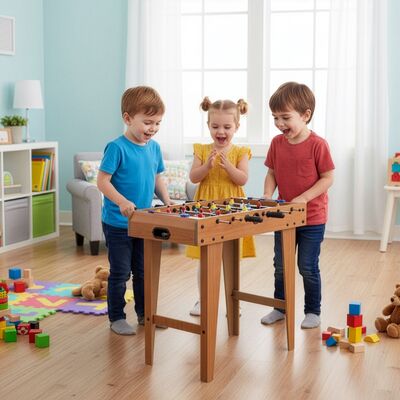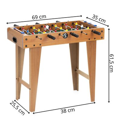 Zábavná spoločenská hra pre dve a viac detí. Stabilná konštrukcia z MDF zaisťuje pevnosť a dlhú životnosť, odolné figúrky z ABS plastu zvládnu aj intenzívnu hru. Kovové tyče s protišmykovými rukoväťami umožňujú pohodlné a presné ovládanie. Prehľadné hracie pole, počítadlo skóre a otvory na loptičku po oboch stranách prispievajú k plynulej, dynamickej a zábavnej hre. Rozmery: 69x35x61,5 cm.