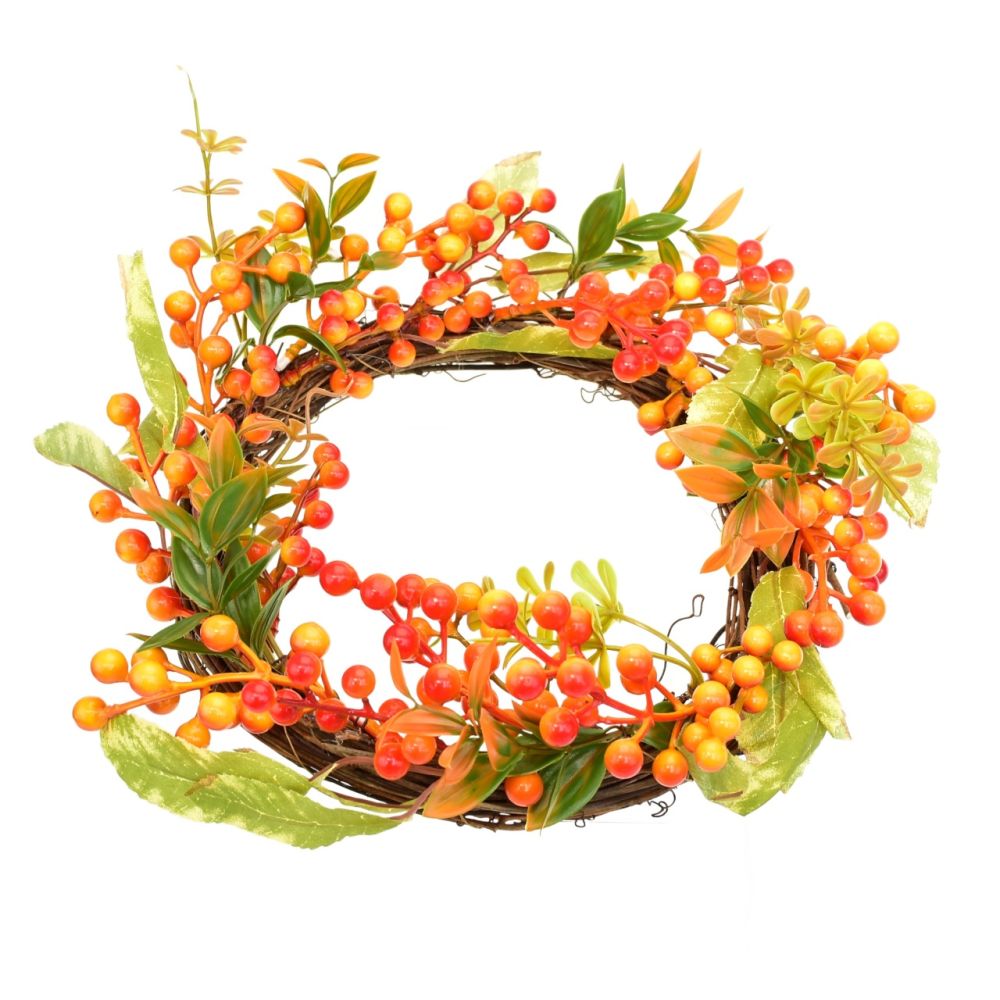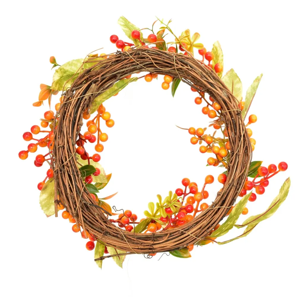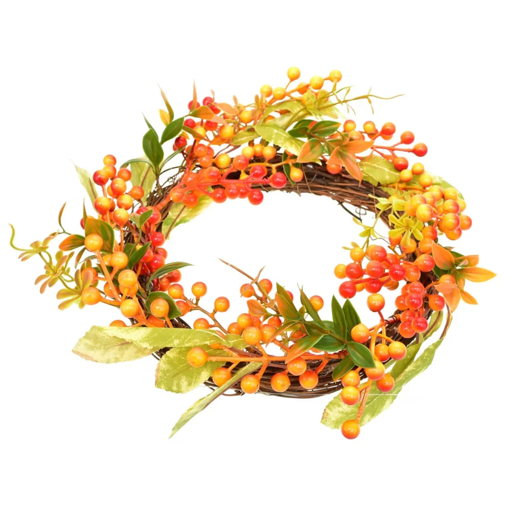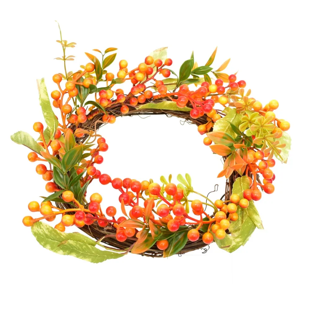 Jesenná dekorácia z prútia s drobnými oranžovo-červenými jarabinami vnesie do vášho domova príjemnú atmosféru jesene. Vyrobená z prírodného suchého prútia a kvalitného plastu, pôsobí realisticky a elegantne. Skvele sa hodí ako výzdoba na dvere, stôl či stenu, a vďaka odolnému spracovaniu je vhodná na vnútorné i vonkajšie použitie. Priemer dekorácie je 33 cm.
