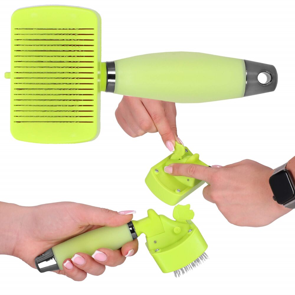 Praktická samočistiaca kefa pre ľahkú starostlivosť o srsť vášho maznáčika. Jemné kovové ihličky z nerezovej ocele účinne rozčesávajú uzly, odstraňujú nečistoty a uvoľnené chlpy, zároveň poskytujú príjemnú masáž. Ergonomická silikónová rukoväť zaisťuje pohodlné držanie pri vyčesávaní. Vďaka šikovnému samočistiacemu mechanizmu stačí stlačiť tlačidlo, vysunúť páčku a chlpy jednoducho odstránite. Ideálna pomôcka na pravidelnú údržbu srsti psov i mačiek.