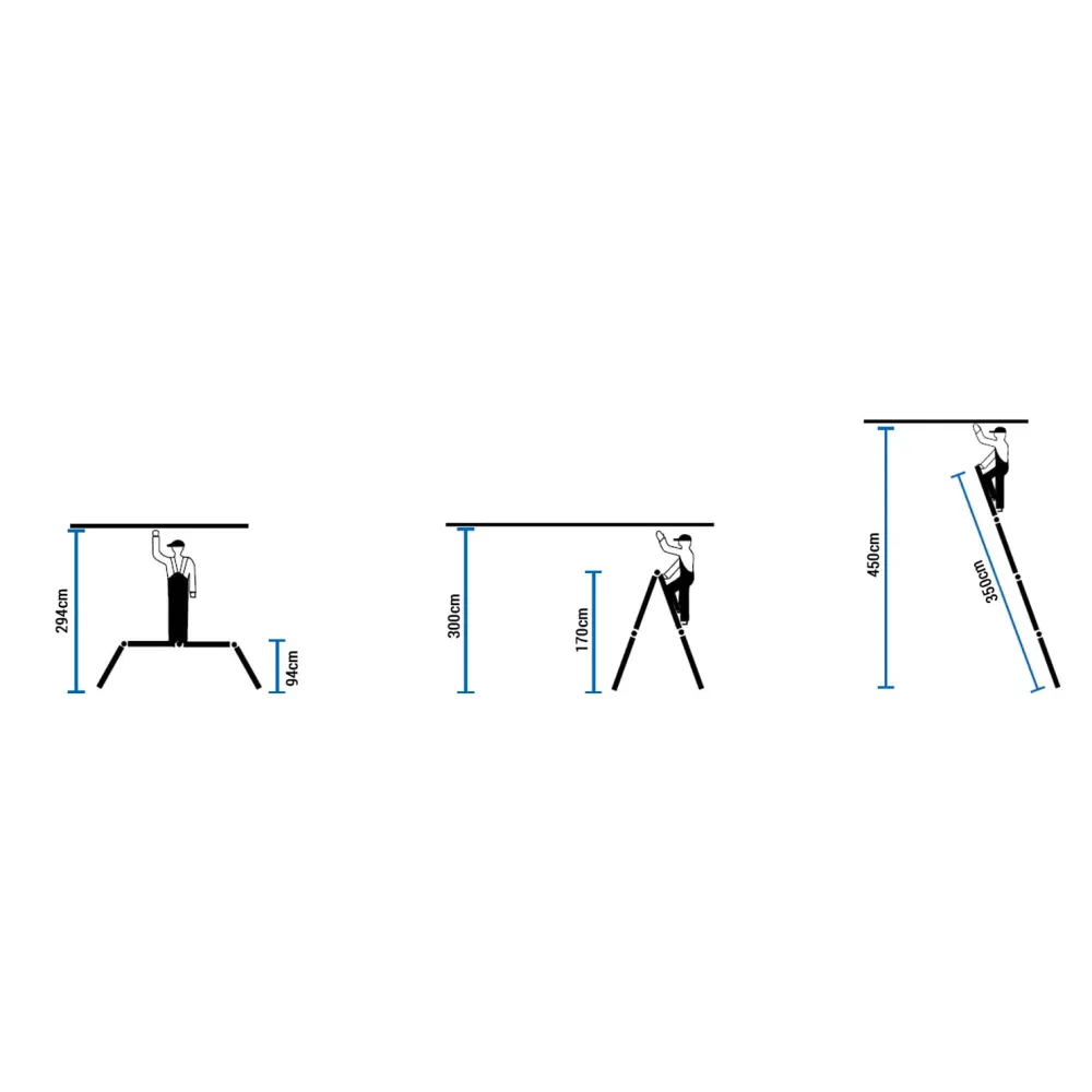 Profesionálny kĺbový rebrík s možnosťou nastavenia do 7 rôznych pozícií. Kompaktný, pevný a univerzálny model s dvoma stabilizátormi a certifikáciou. 4x3 priečky, výška plošiny 0,94 m, dĺžka 3,50 m, max. pracovná výška 4,50 m, nosnosť 150 kg. Ľahko prenosný a úplne multifunkčný rebrík na prácu vo výškach. Vhodný na každodenné intenzívne používanie na stavbe, okolo domu alebo na záhrade.