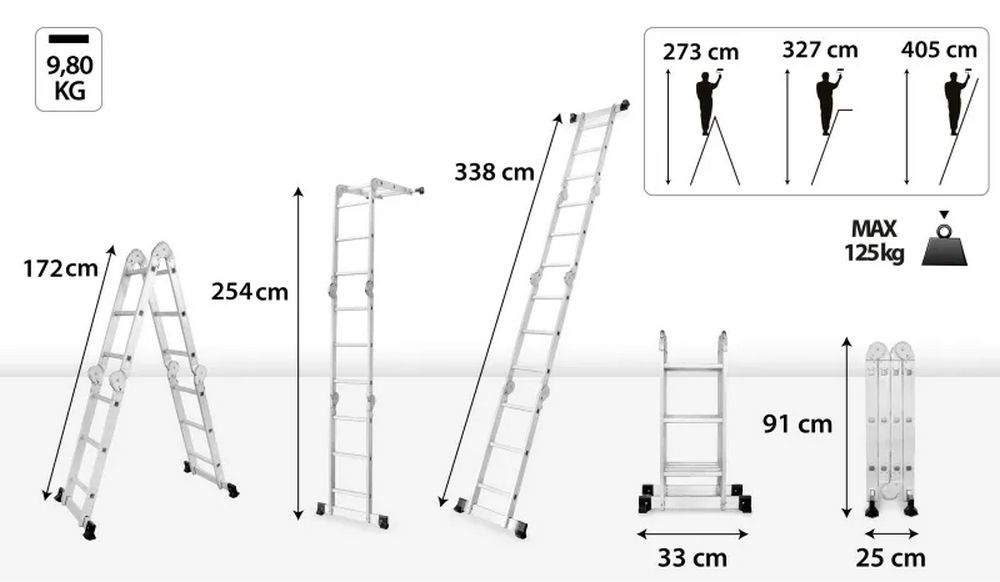 Nezáleží na tom, či ste profesionál alebo domáci majster, tento rebrík bude určite nepostrádateľným pomocníkom pri akejkoľvek práci. Vďaka pohyblivým kĺbom ho môžete zostaviť v 7 rôznych kombináciách.
