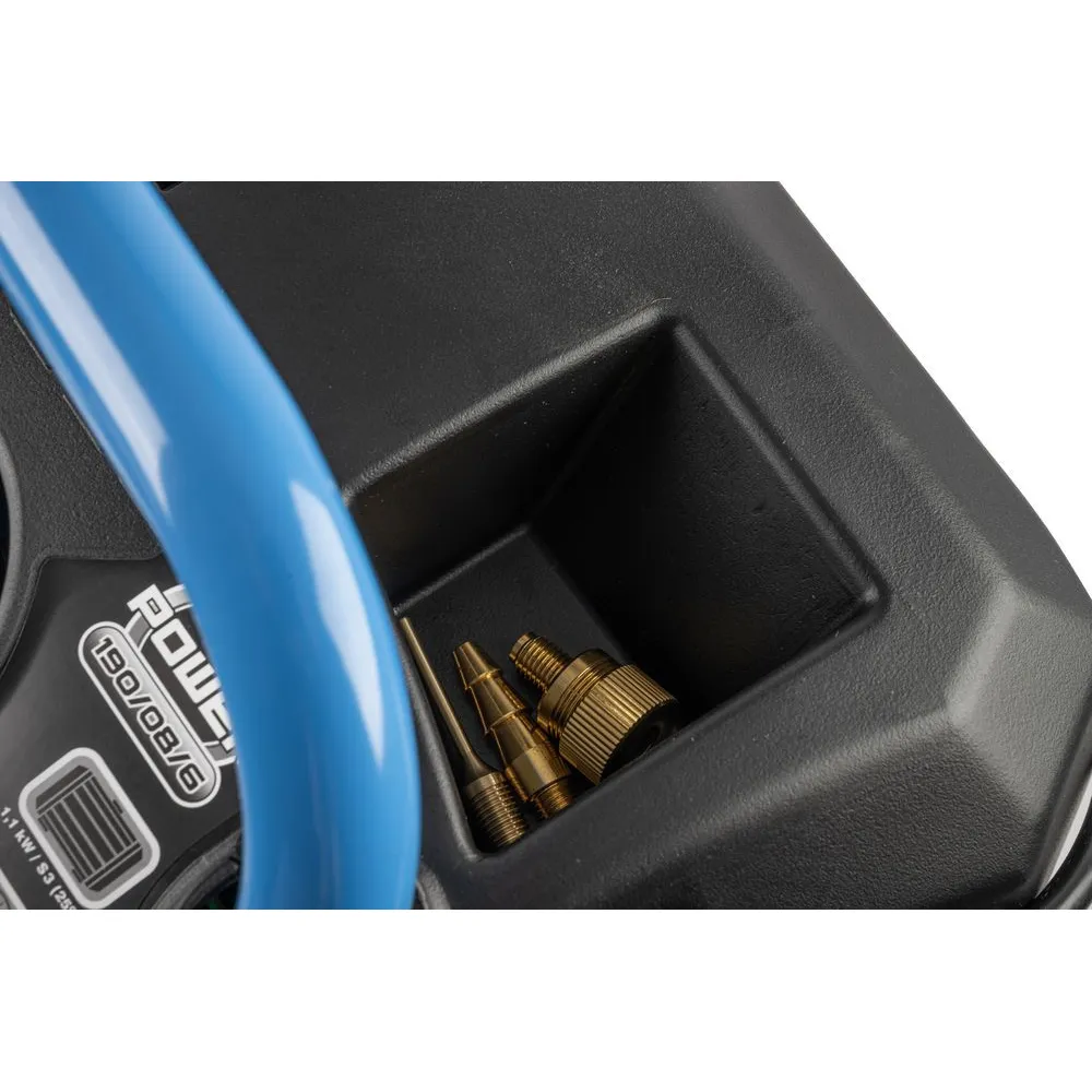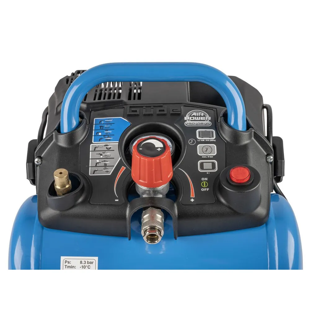 Jednovalcový kompresor s olejovým mazaním, s priamym pohonom. Tlakový spínač, manometer tlaku v nádobe a manometer pracovného tlaku, 1 spojka...
