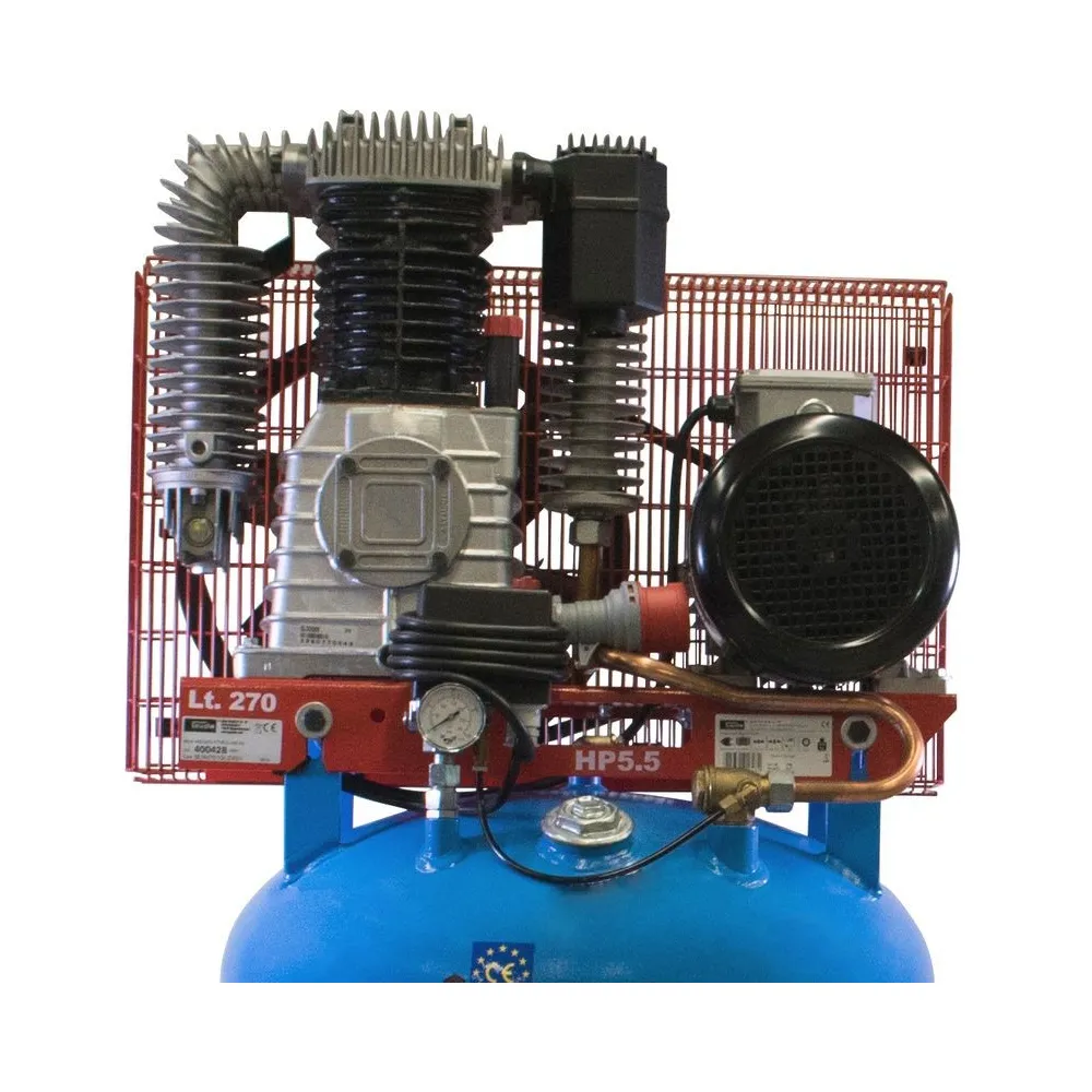 Vertikálny priemyselný kompresor vhodný na pripojenie k existujúcemu potrubnému napájaciemu systému. Dvojstupňový dvojvalcový agregát s olejovým mazaním, s remeňovým pohonom cez veľké remenice. Tlakový spínač Condor s ochranou motora, manometer tlaku v nádobe.