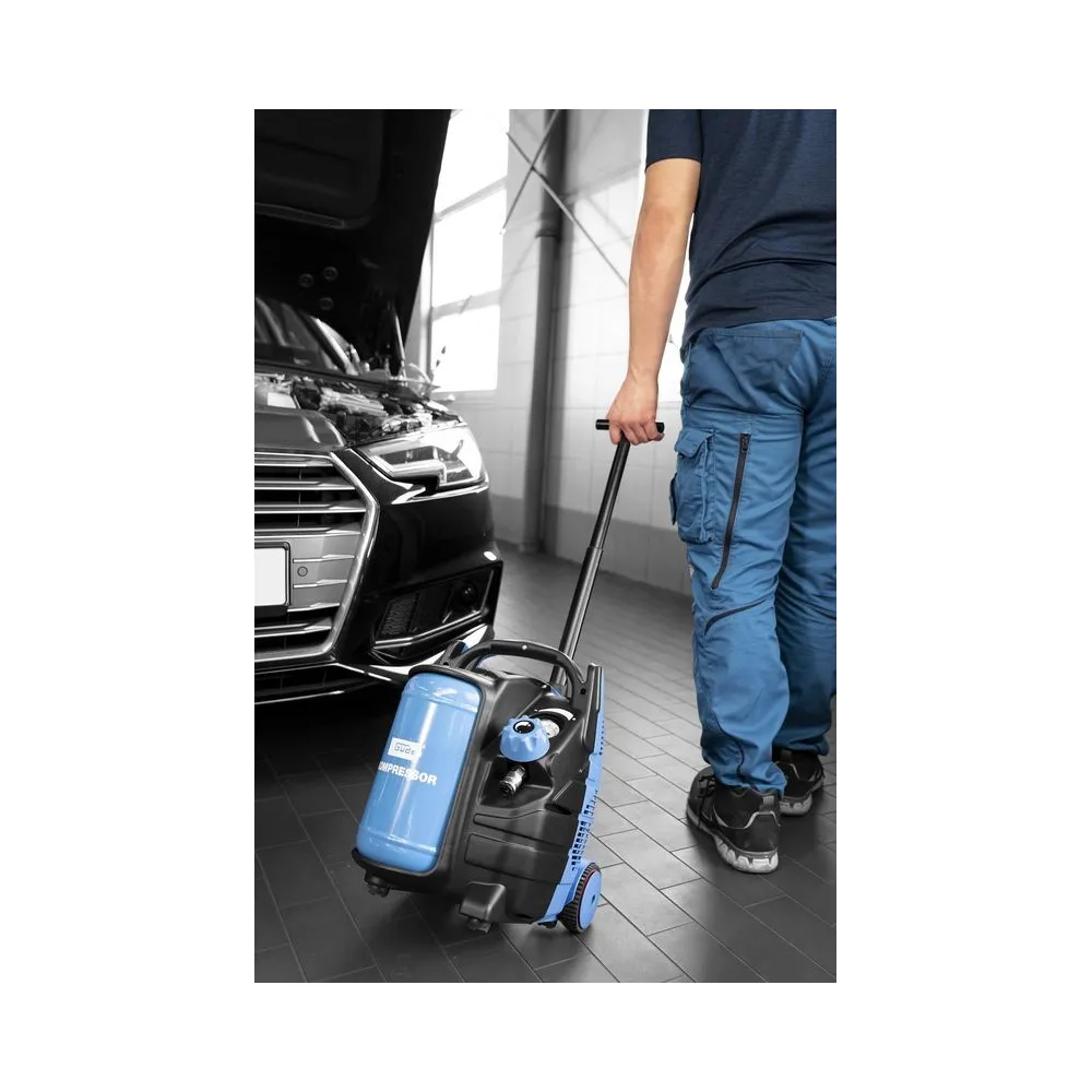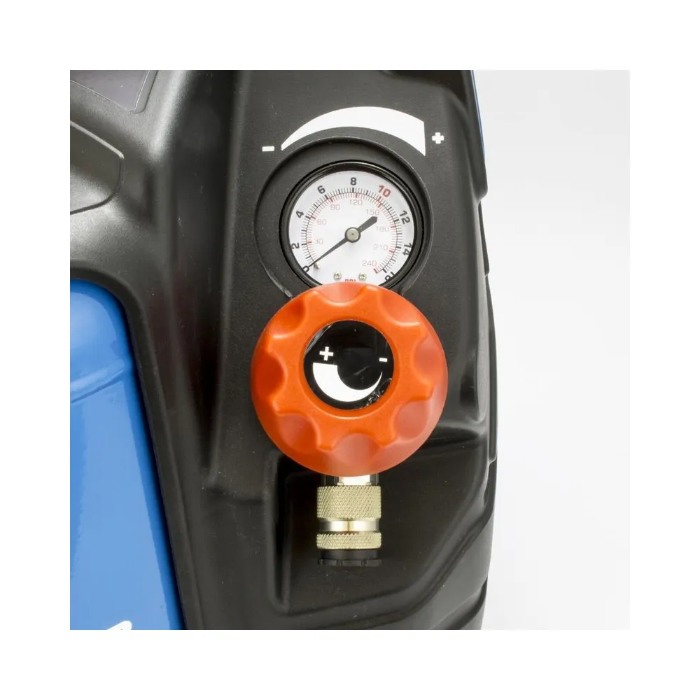 Dvojstupňový dvojvalcový kompresor s olejovým mazaním, s remeňovým pohonom. Tlakový spínač Condor, manometer tlaku v nádobe a manometer...
