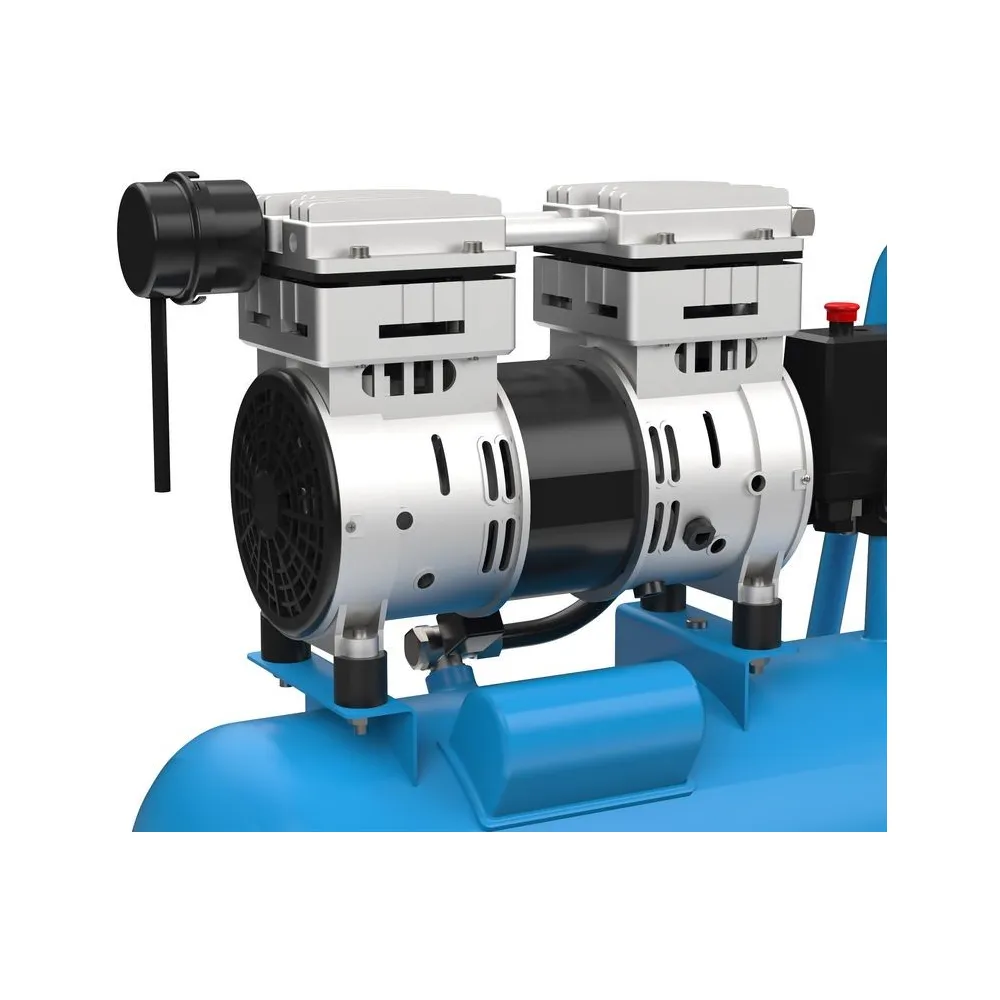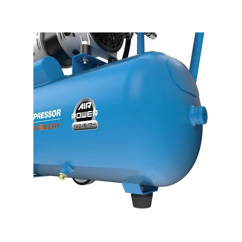 Bezolejový dvojvalcový piestový kompresor, dvojpiestový agregát s priamym pohonom. Mechanický tlakový spínač, manometer na meranie tlaku v nádobe a pracovného tlaku, 24-litrová nádrž s gumovými tlmičmi, rukoväť na prenášanie. Tichý chod.