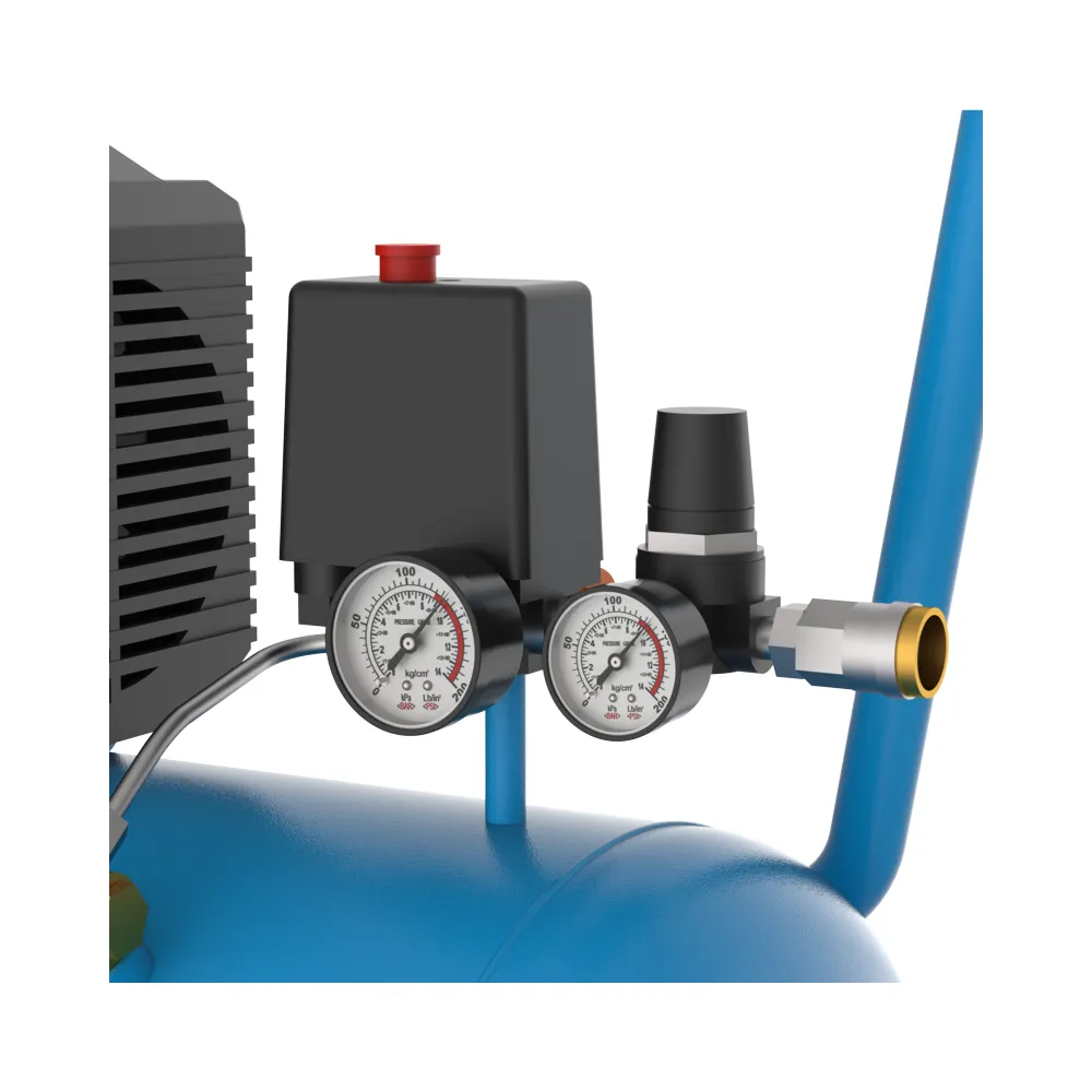 Jednovalcový piestový kompresor s olejovým mazaním, priamy pohon, dva manometre (manometer na meranie tlaku v nádobe a manometer na meranie...