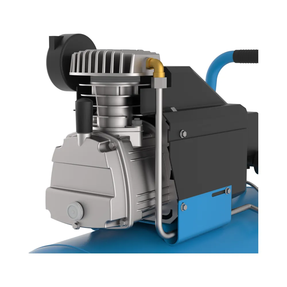Jednovalcový piestový kompresor s olejovým mazaním, priamy pohon, dva manometre (manometer na meranie tlaku v nádobe a manometer na meranie pracovného tlaku), jedna spojka na stlačený vzduch, redukčný, bezpečnostný a spätný ventil, vzduchový filter, transportná rukoväť.