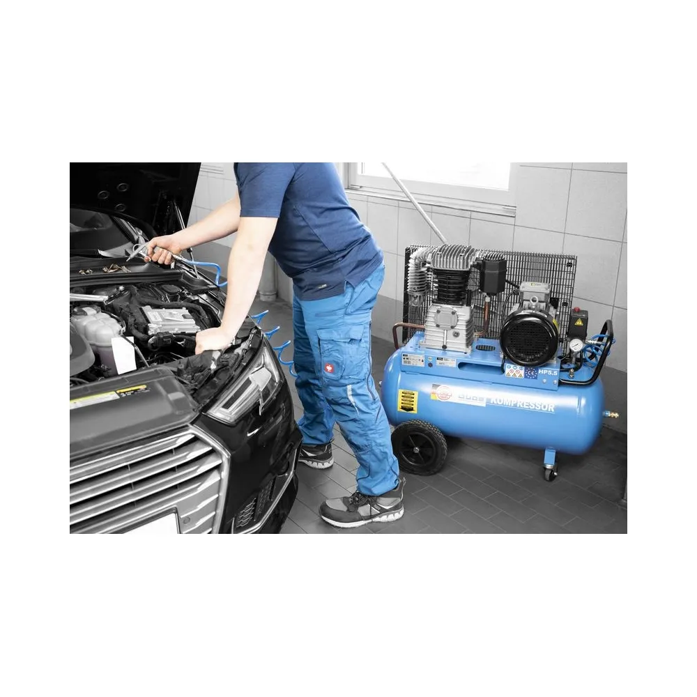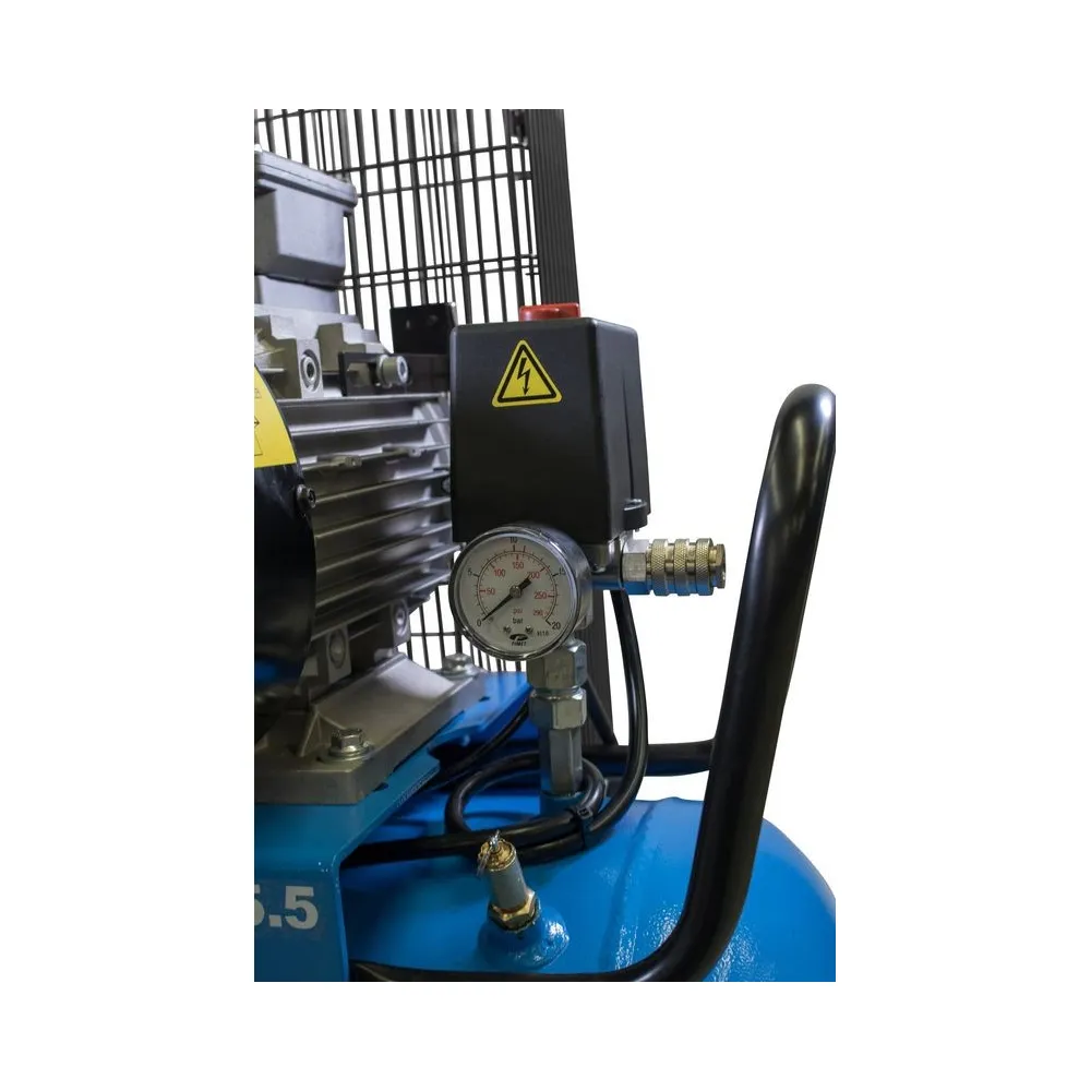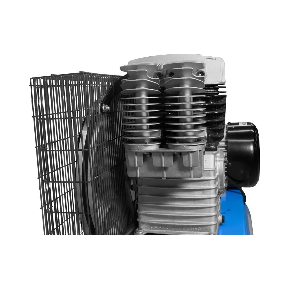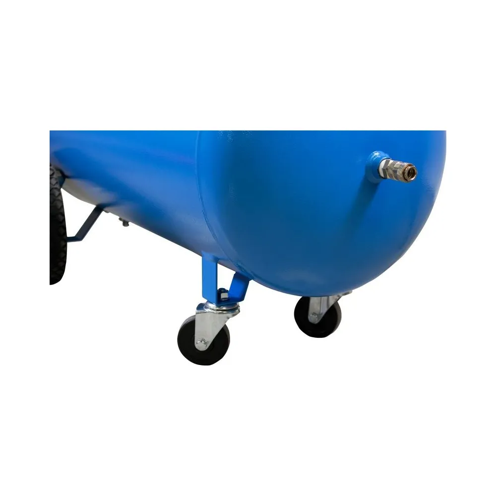Dvojstupňový dvojvalcový kompresor s olejovým mazaním, s remeňovým pohonom. Tlakový spínač Condor, manometer tlaku v nádobe a manometer pracovného tlaku, redukčný ventil a odlučovač vody, 3 spojky na stlačený vzduch, spätný ventil, vypúšťací ventil na kondenzát. kolesá, prepravná rukoväť.