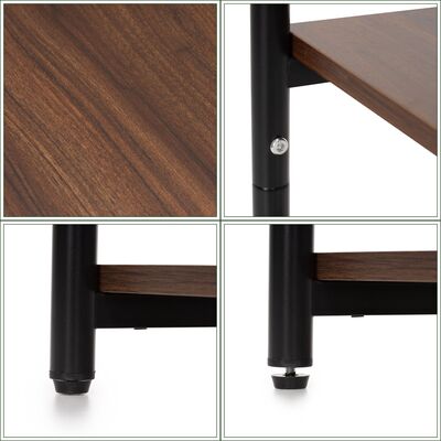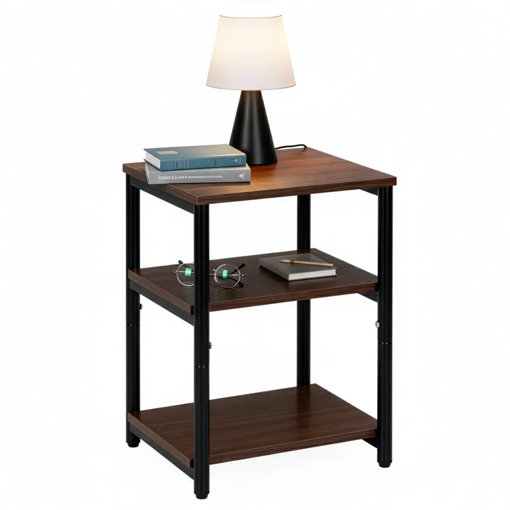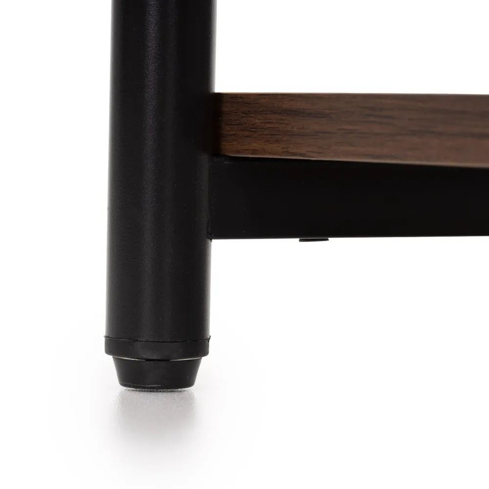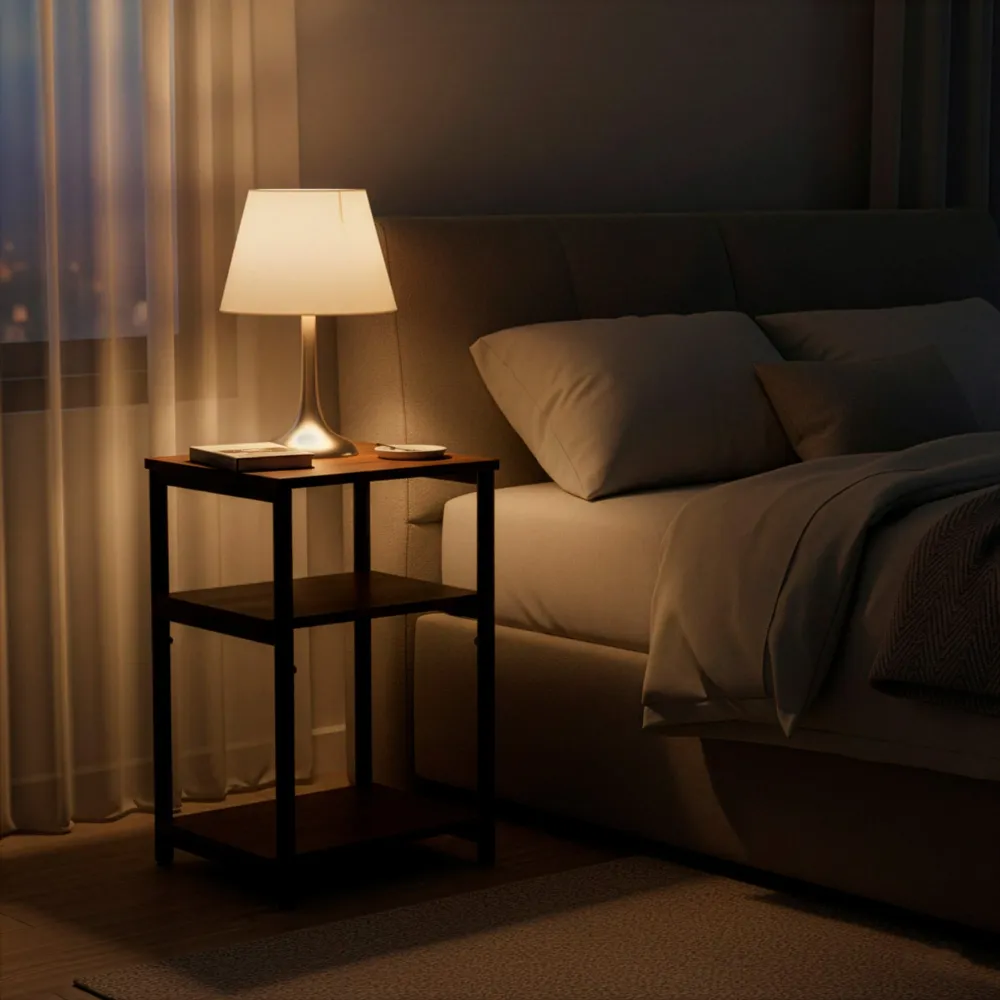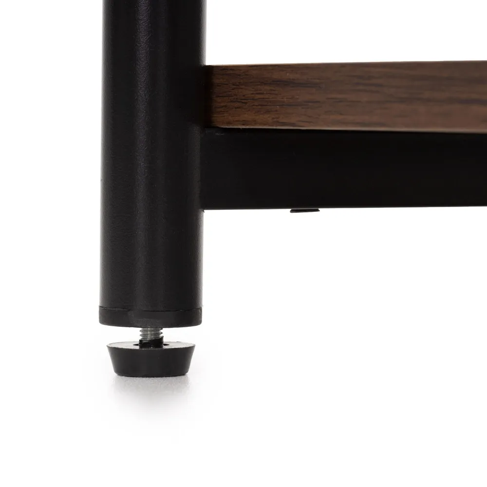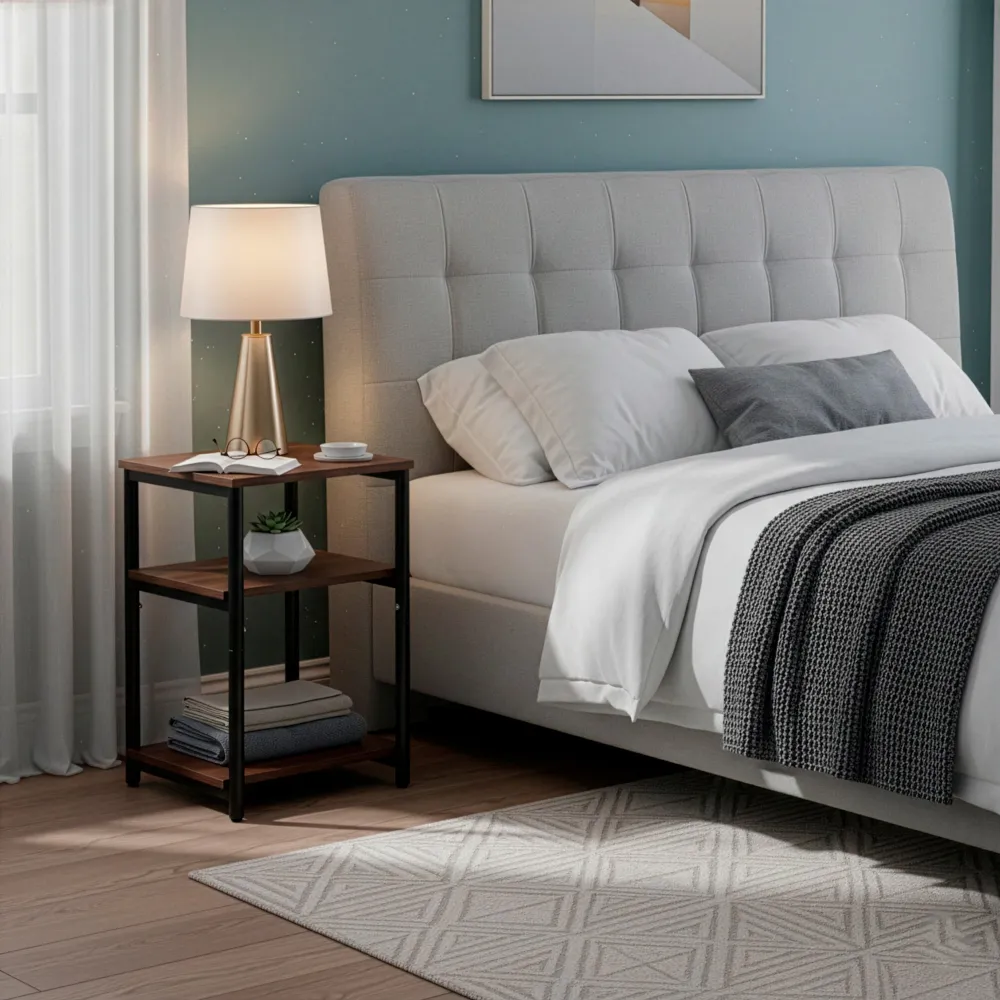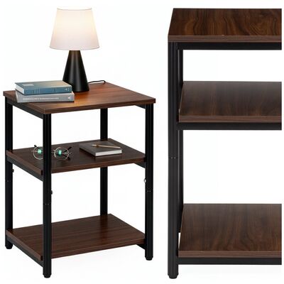 Štýlový doplnok do spálne v tmavo hnedom prevedení s kontrastnou kovovou konštrukciou vytvára pevné a prehľadné miesto na každodenné odkladanie. Tri otvorené úrovne poskytujú priestor pre knihu, telefón, lampičku aj dekorácie. Vďaka kompaktným rozmerom sa hodí aj k menším posteliam a prirodzene zapadne do moderného interiéru.