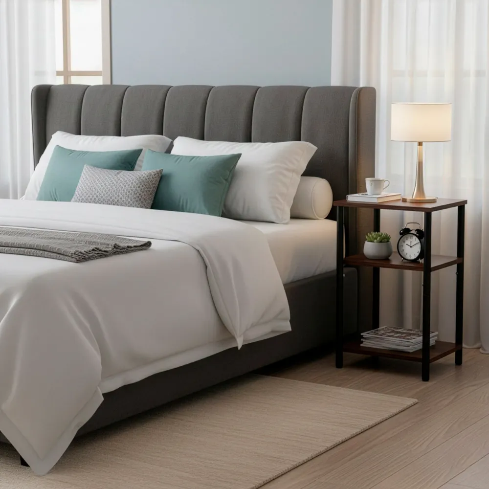 Tri otvorené police poskytujú prehľadný úložný priestor pre knihy, lampičku, telefón, budík alebo dekorácie, ktoré chcete mať vždy po ruke. Vysoká nosnosť políc a pevná konštrukcia zaisťujú stabilitu a spoľahlivé používanie v každodennej prevádzke.