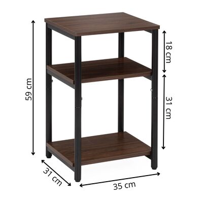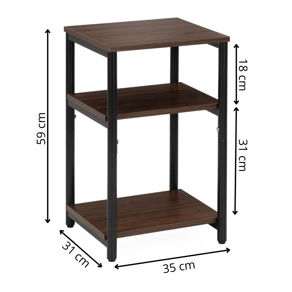 Štýlový doplnok do spálne v tmavo hnedom prevedení s kontrastnou kovovou konštrukciou vytvára pevné a prehľadné miesto na každodenné odkladanie. Tri otvorené úrovne poskytujú priestor pre knihu, telefón, lampičku aj dekorácie. Vďaka kompaktným rozmerom sa hodí aj k menším posteliam a prirodzene zapadne do moderného interiéru. Rozmery: 59x35x31 cm.