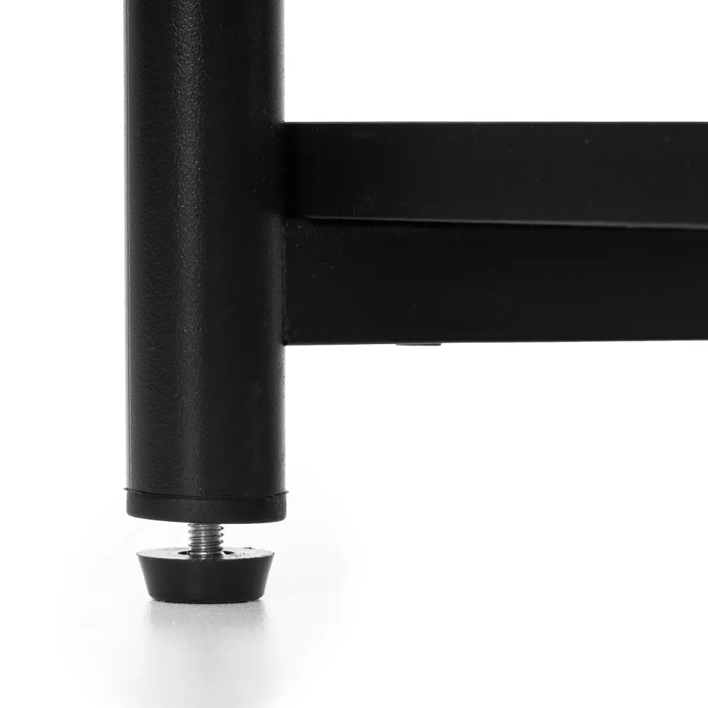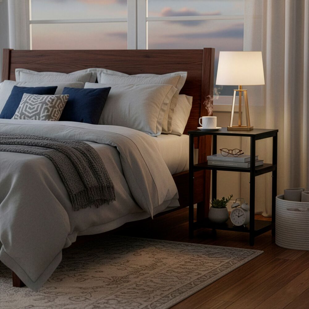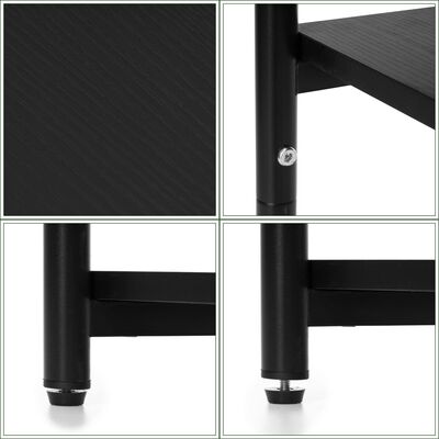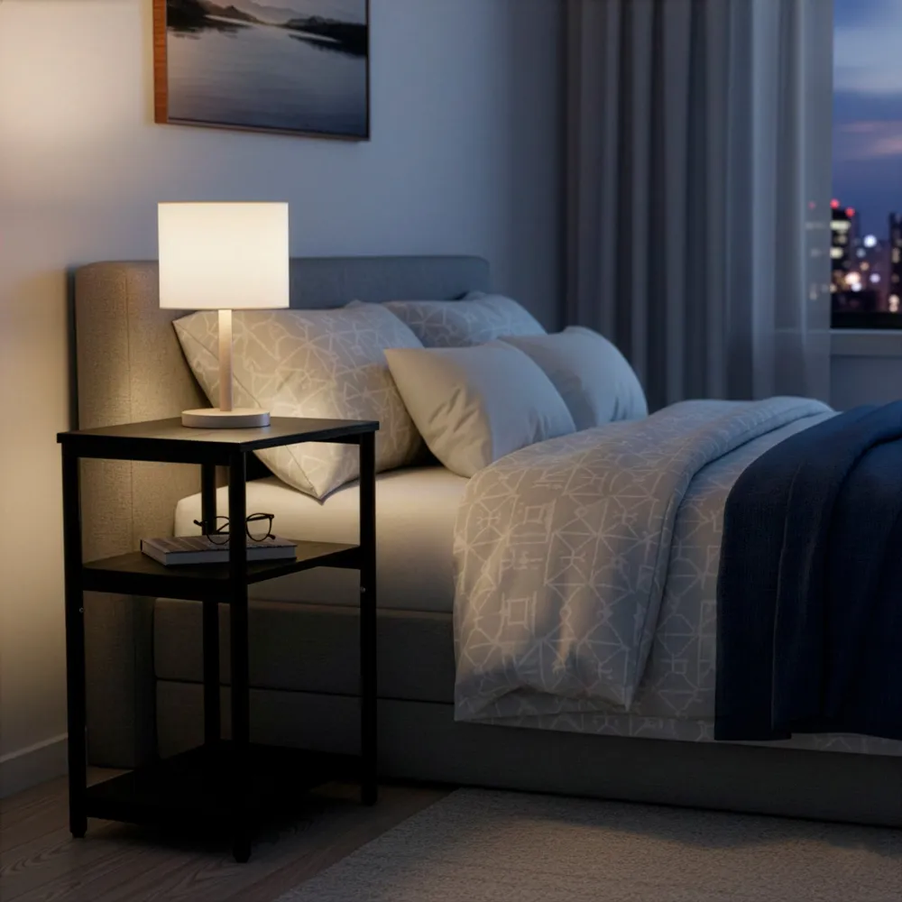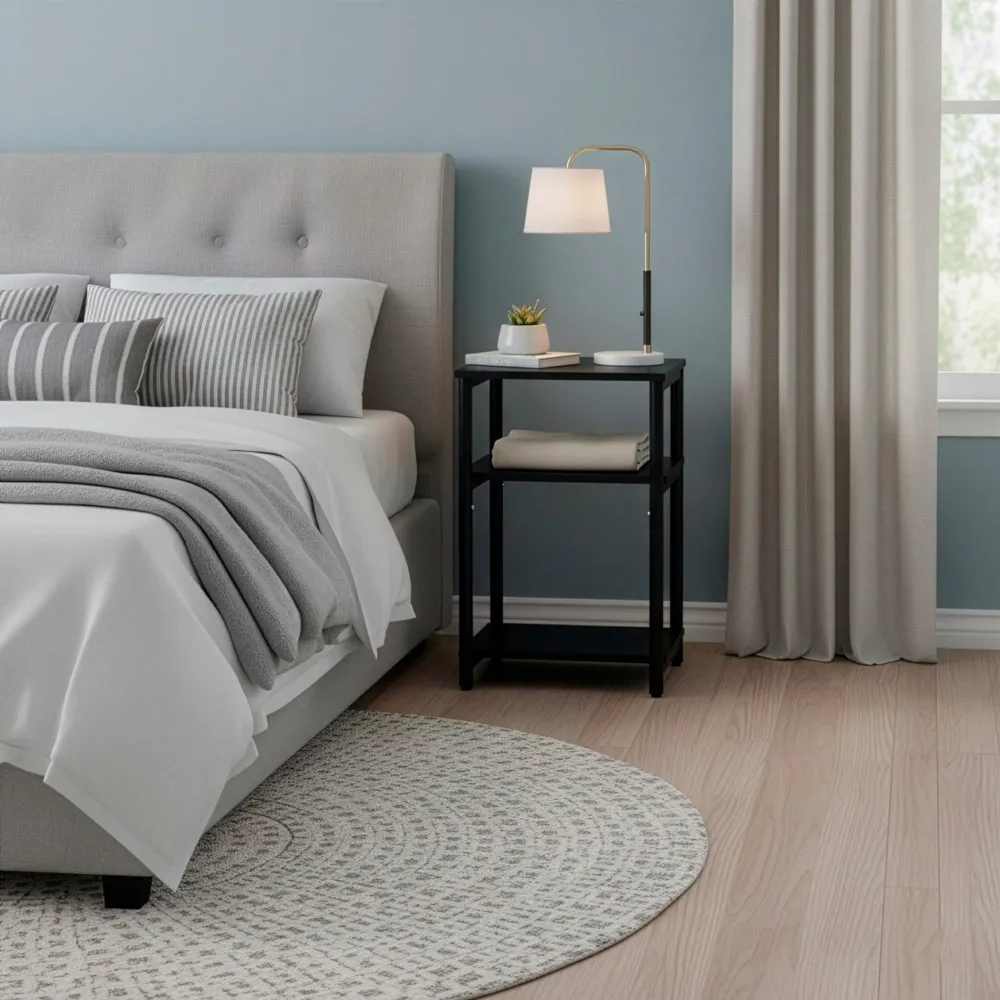 Štýlový doplnok do spálne v čiernom prevedení s kontrastnou kovovou konštrukciou vytvára pevné a prehľadné miesto na každodenné odkladanie. Tri otvorené úrovne poskytujú priestor pre knihu, telefón, lampičku aj dekorácie. Vďaka kompaktným rozmerom sa hodí aj k menším posteliam a prirodzene zapadne do moderného interiéru.