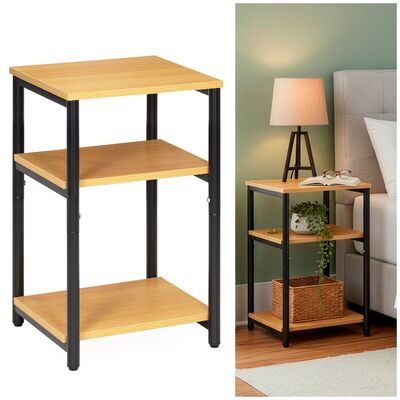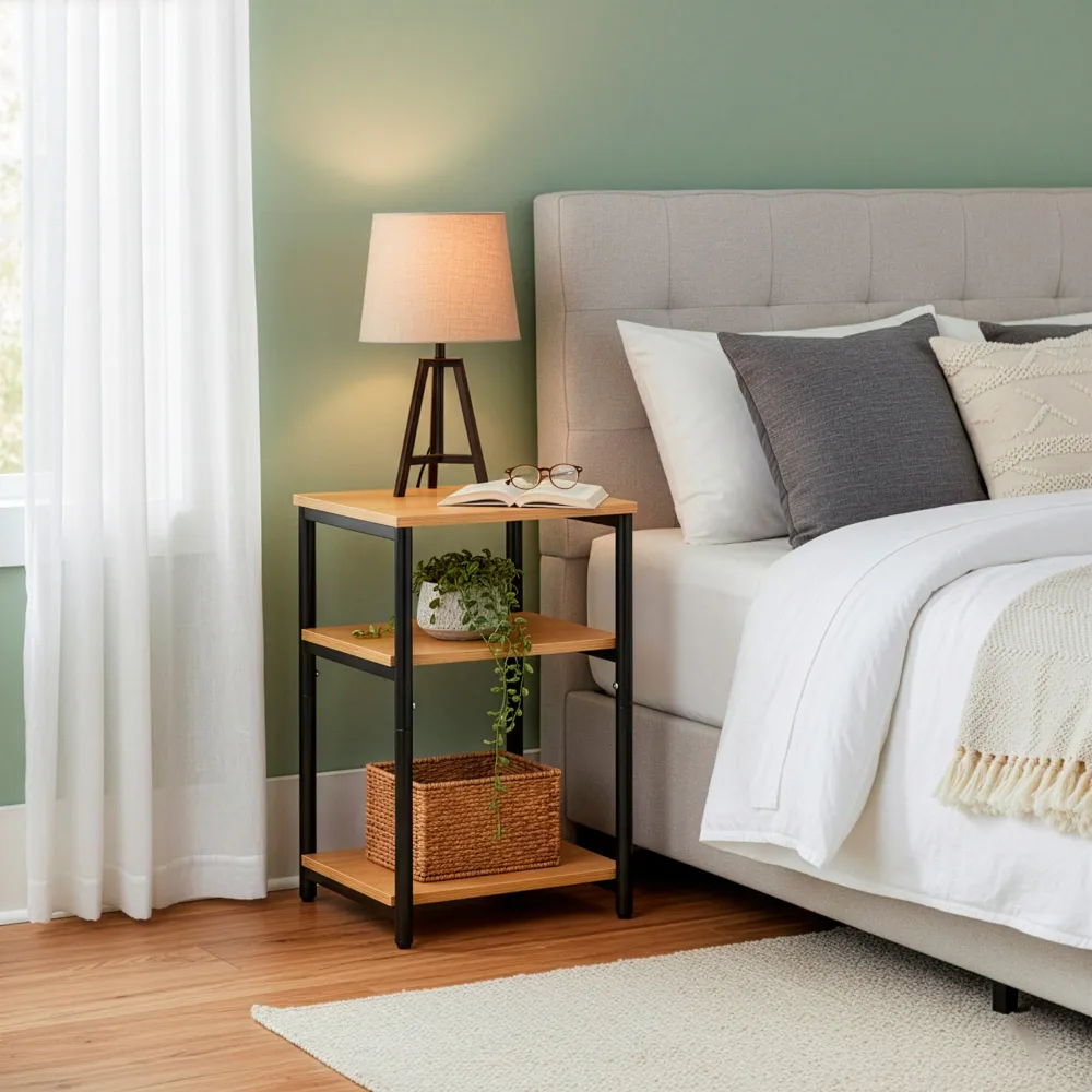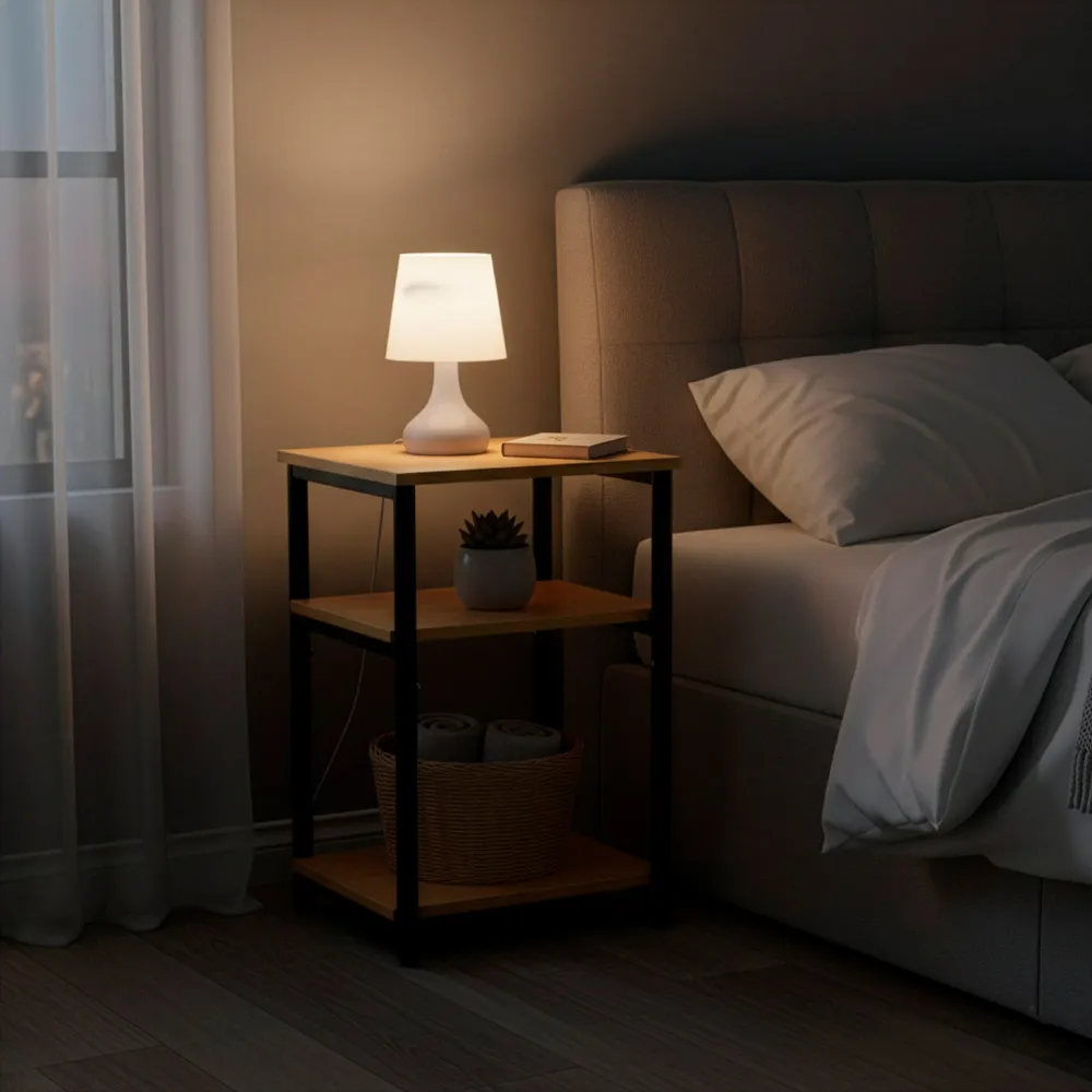 Štýlový doplnok do spálne vo svetlo hnedom prevedení s kontrastnou kovovou konštrukciou vytvára pevné a prehľadné miesto na každodenné odkladanie. Tri otvorené úrovne poskytujú priestor pre knihu, telefón, lampičku aj dekorácie. Vďaka kompaktným rozmerom sa hodí aj k menším posteliam a prirodzene zapadne do moderného interiéru.