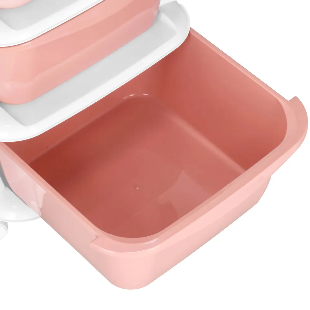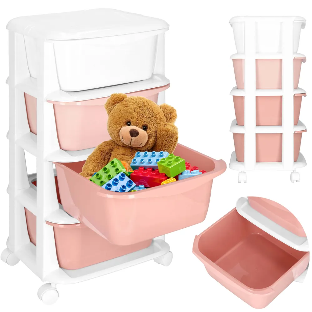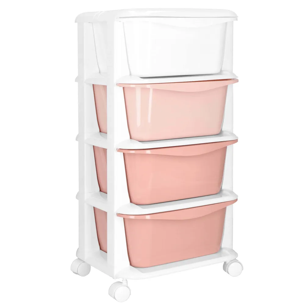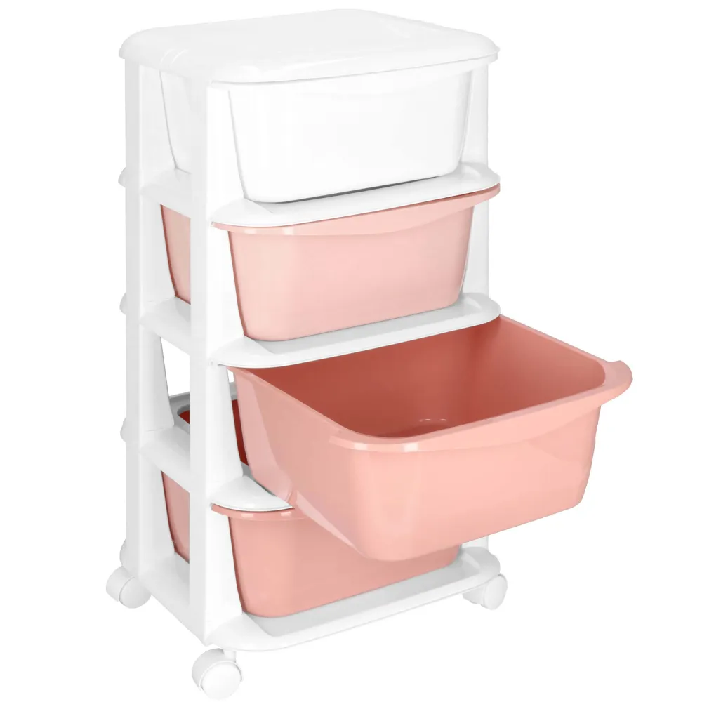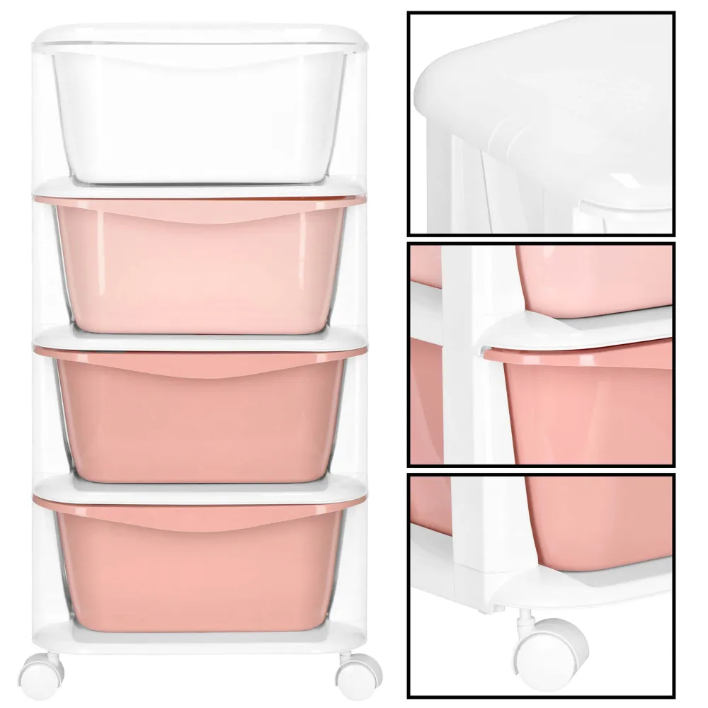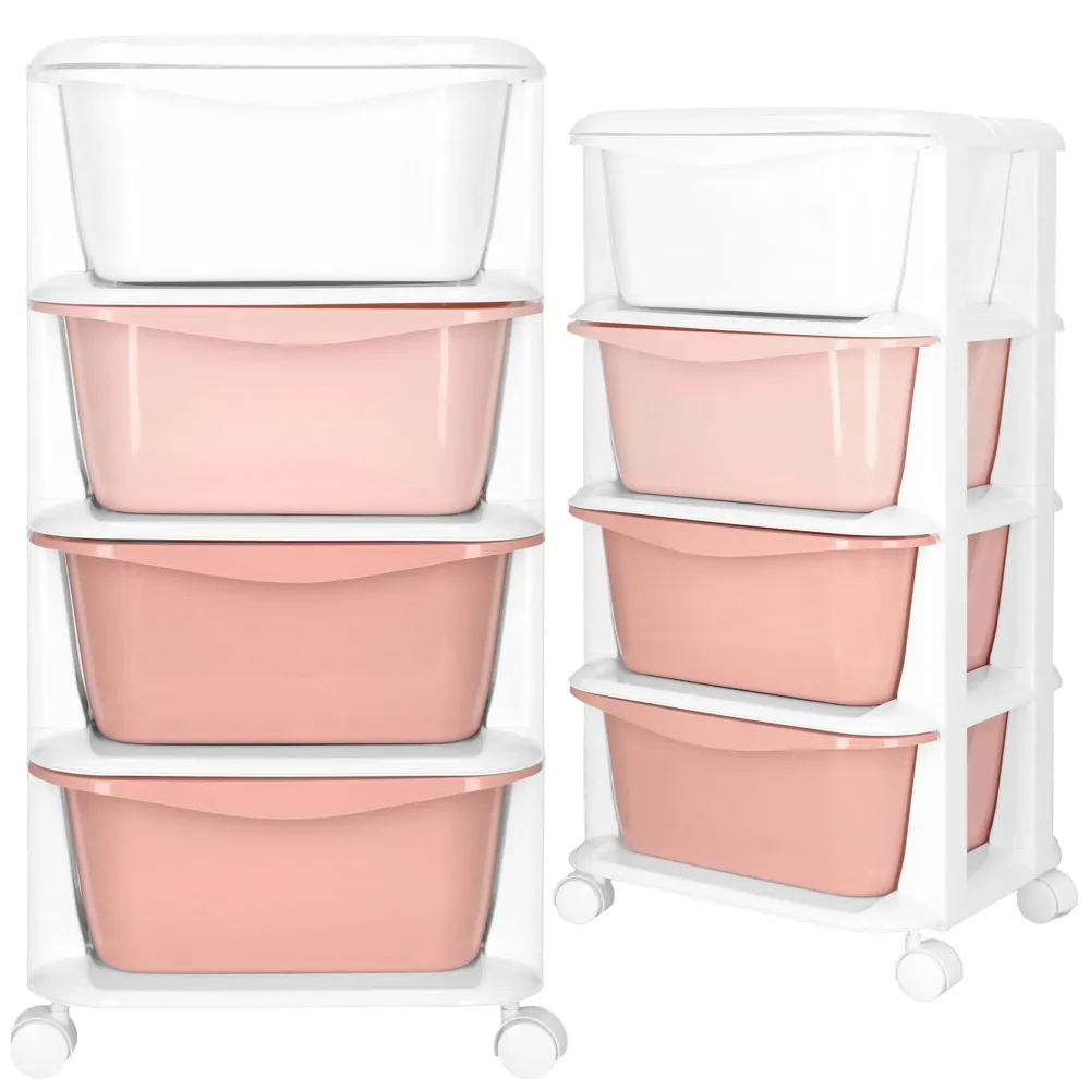 Skrinka na kolieskach 4 zásuvky SPRINGOS HA0212 je praktický pomocník pre domácnosť, kanceláriu alebo detskú izbu. Štyri priestranné zásuvky poskytujú dostatok miesta na organizáciu vecí a jej plastová konštrukcia je ľahká a ľahko udržiavateľná. Bezpečnosť pri používaní zaisťujú zaoblené hrany a celková nosnosť až 20 kg , ktorá umožňuje ukladať rôzne predmety bez obáv.
