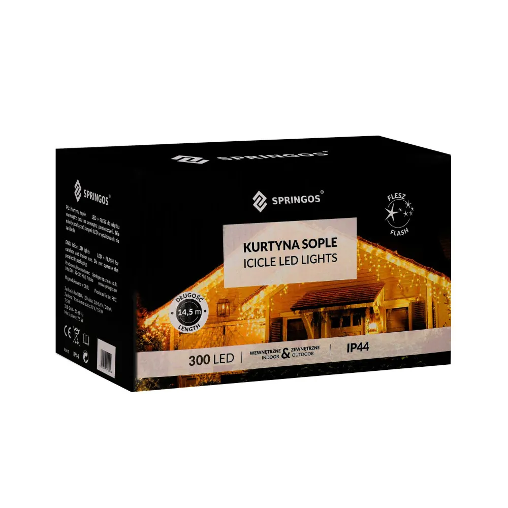 Svetelná reťaz so zábleskami a rôznou výškou voľne visiacich kvapľov. Úsporné ľad diódy, vnútorné aj vonkajšie použitie, vodeodolné prevedenie, krytie IP44. Dĺžka svetelnej časti 12 m, napájací kábel 2,5 m. Farba teplá biela + záblesky studená biela, 300 ľad.