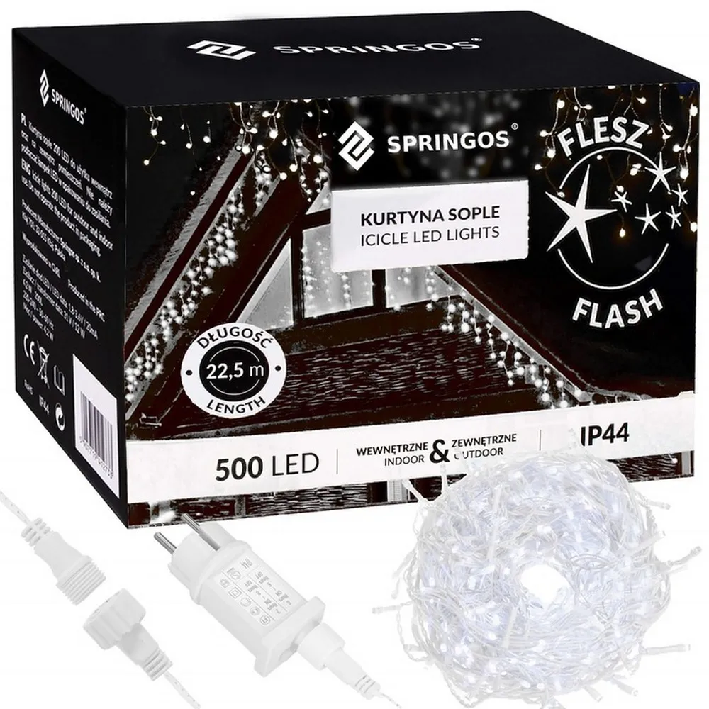 Svetelná reťaz so zábleskami a rôznou výškou voľne visiacich kvapľov. Časovač, adaptér na bezpečné napätie, ultra úsporné ľad diódy. Vnútorné aj vonkajšie použitie, vodeodolné prevedenie, krytie IP44. Dĺžka svetelnej časti 20 m, napájací kábel 2,5 m. Farba studená biela + záblesky, 500 ľad.