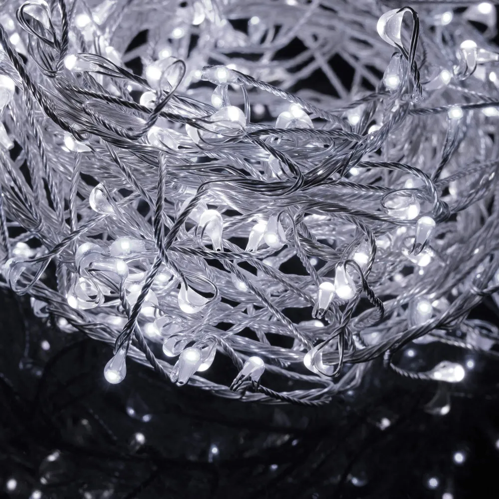 Ultratenká strapatá reťaz s programátorom a 8 svetelnými funkciami. Veľmi husté a jasné osvetlenie. Adaptér na bezpečné napätie, ultra úsporné nano led diódy, neviditeľný kábel. Vnútorné aj vonkajšie použitie, vodeodolné prevedenie, krytie IP44. Dĺžka svetelnej časti 3 m, napájací kábel 3 m. Farba studená biela, 300 ľad.