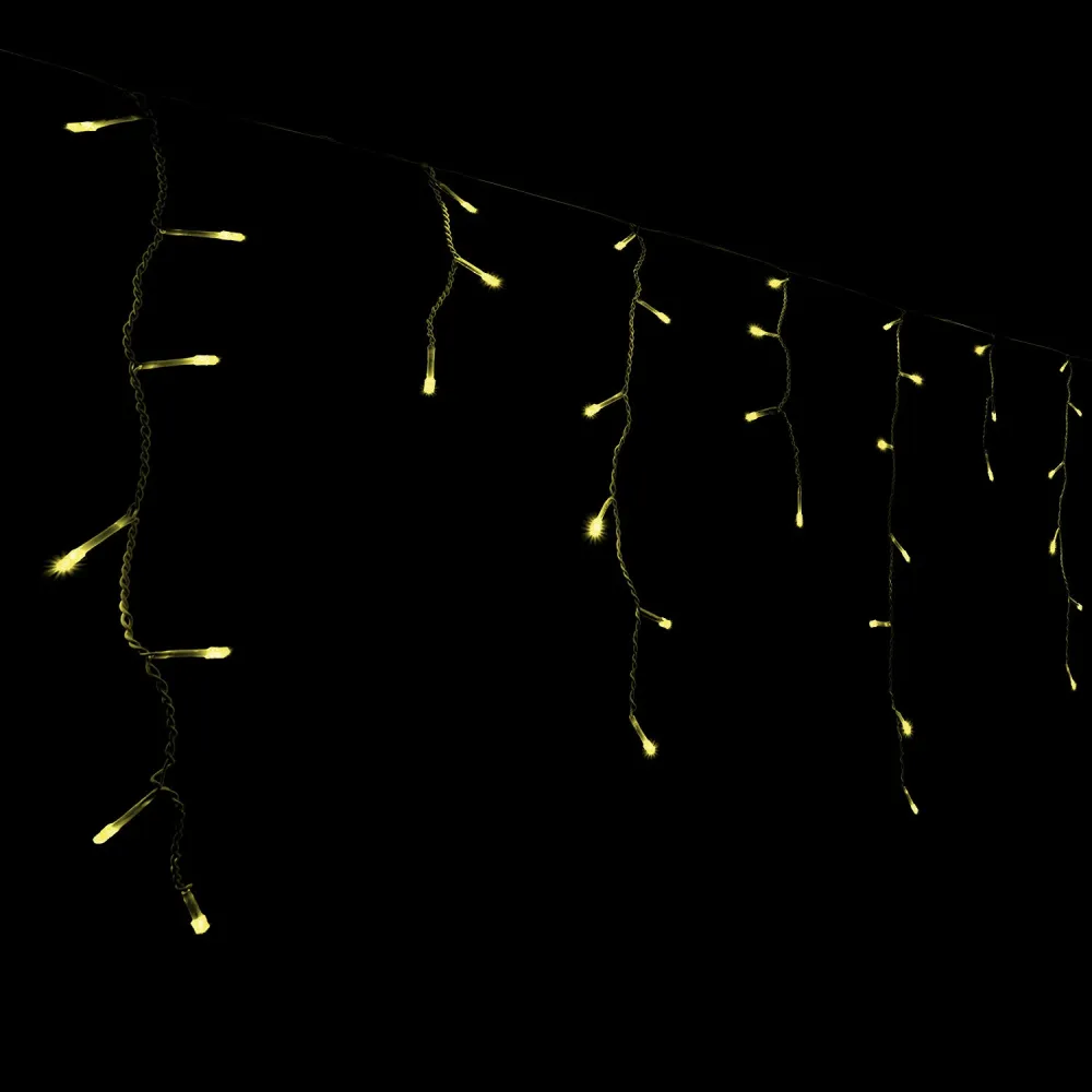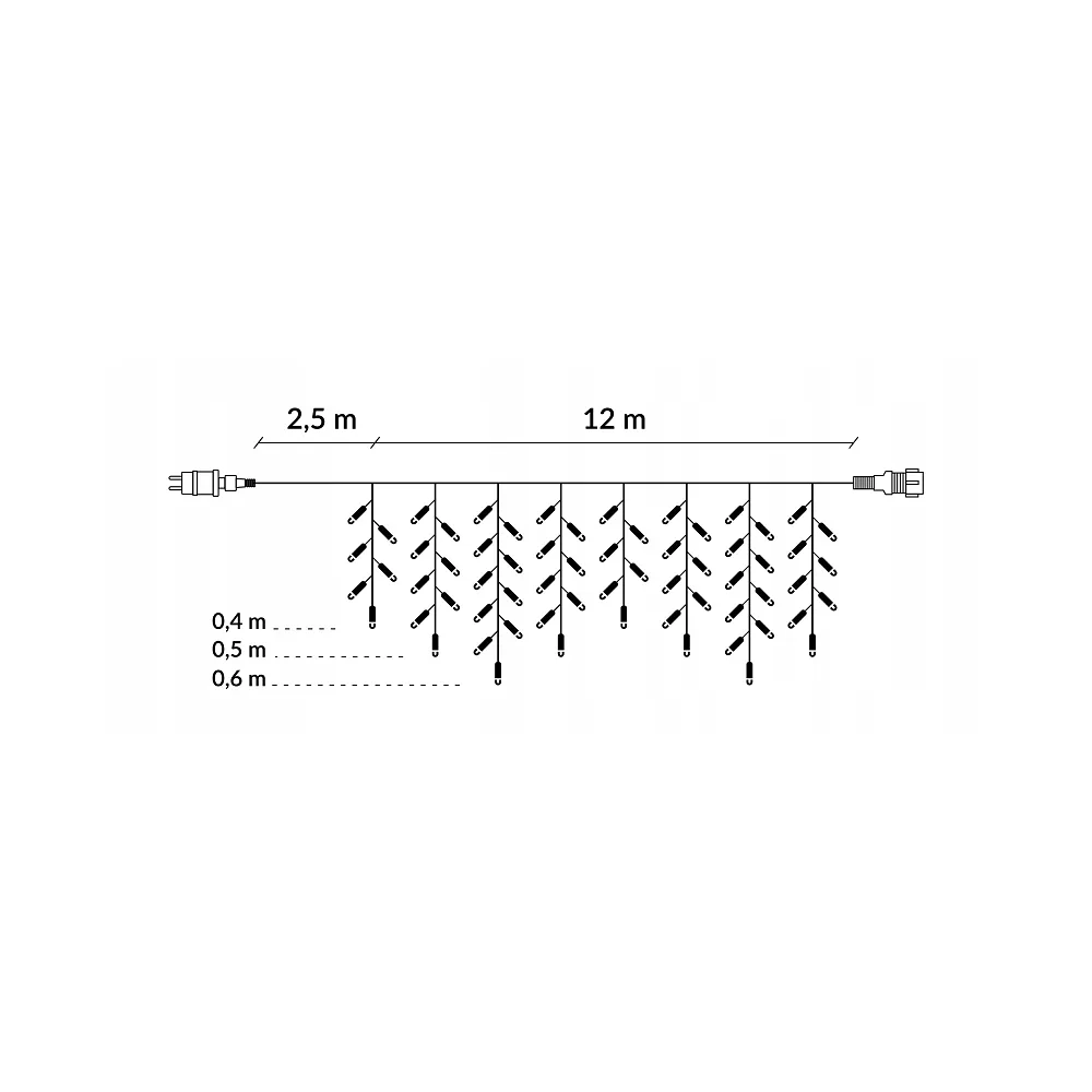 Svetelná reťaz s rôznou výškou voľne visiacich kvapľov. Programátor, 8 svetelných funkcií, adaptér na bezpečné napätie. Ultra úsporné ľad diódy, vnútorné aj vonkajšie použitie, vodeodolné prevedenie, krytie IP44. Dĺžka svetelnej časti 12 m, napájací kábel 2,5 m. Farba teplá biela, 300 ľad.