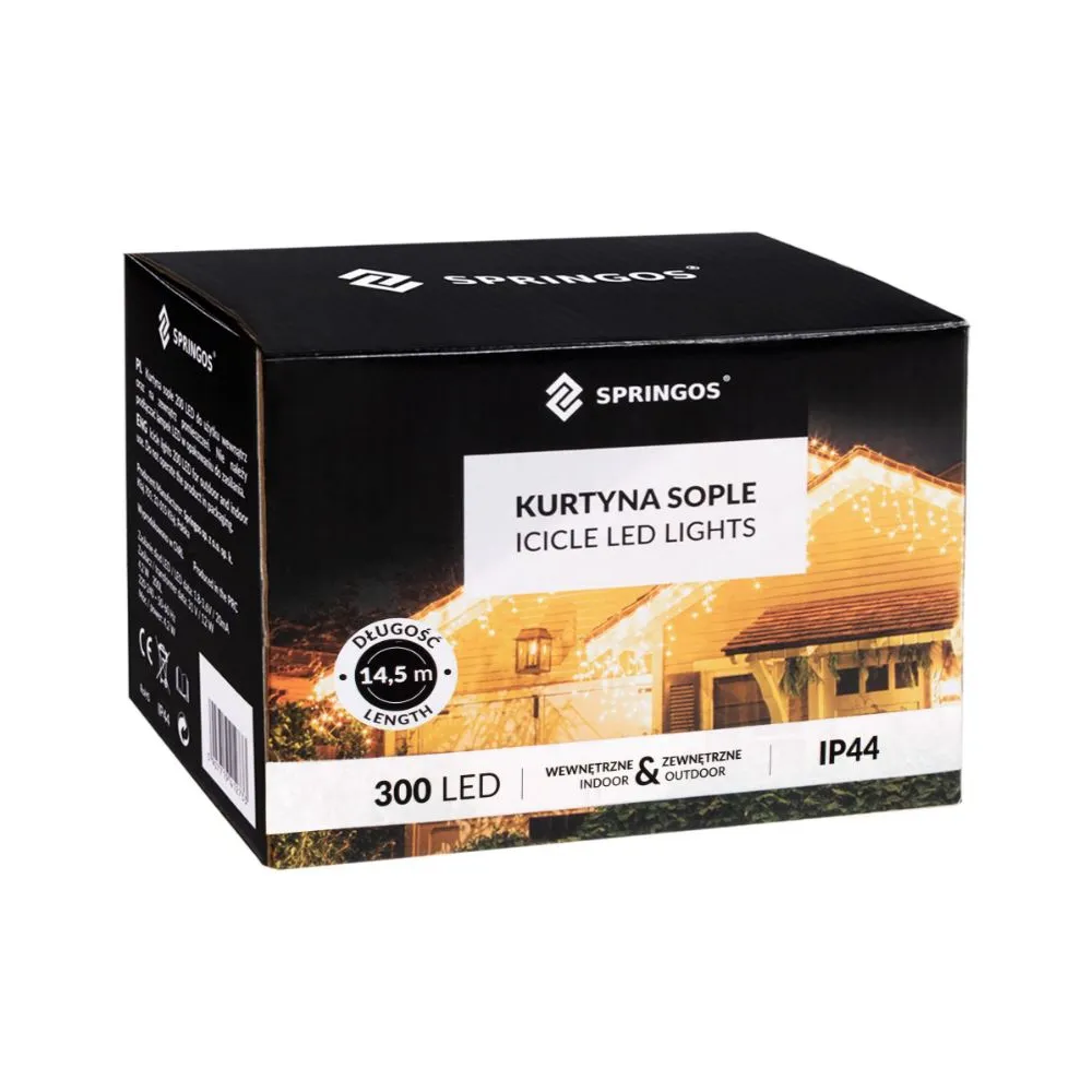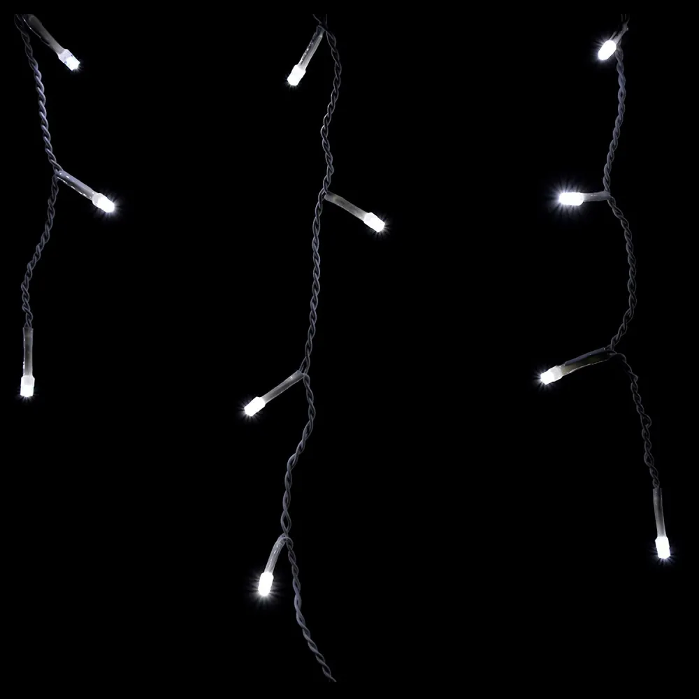 Svetelná reťaz s rôznou výškou voľne visiacich kvapľov. Programátor, 8 svetelných funkcií, diaľkový ovládač, adaptér na bezpečné napätie. Ultra úsporné ľad diódy, vnútorné aj vonkajšie použitie, vodeodolné prevedenie, krytie IP44. Dĺžka svetelnej časti 12 m, napájací kábel 2,5 m. Farba studená biela, 300 ľad.