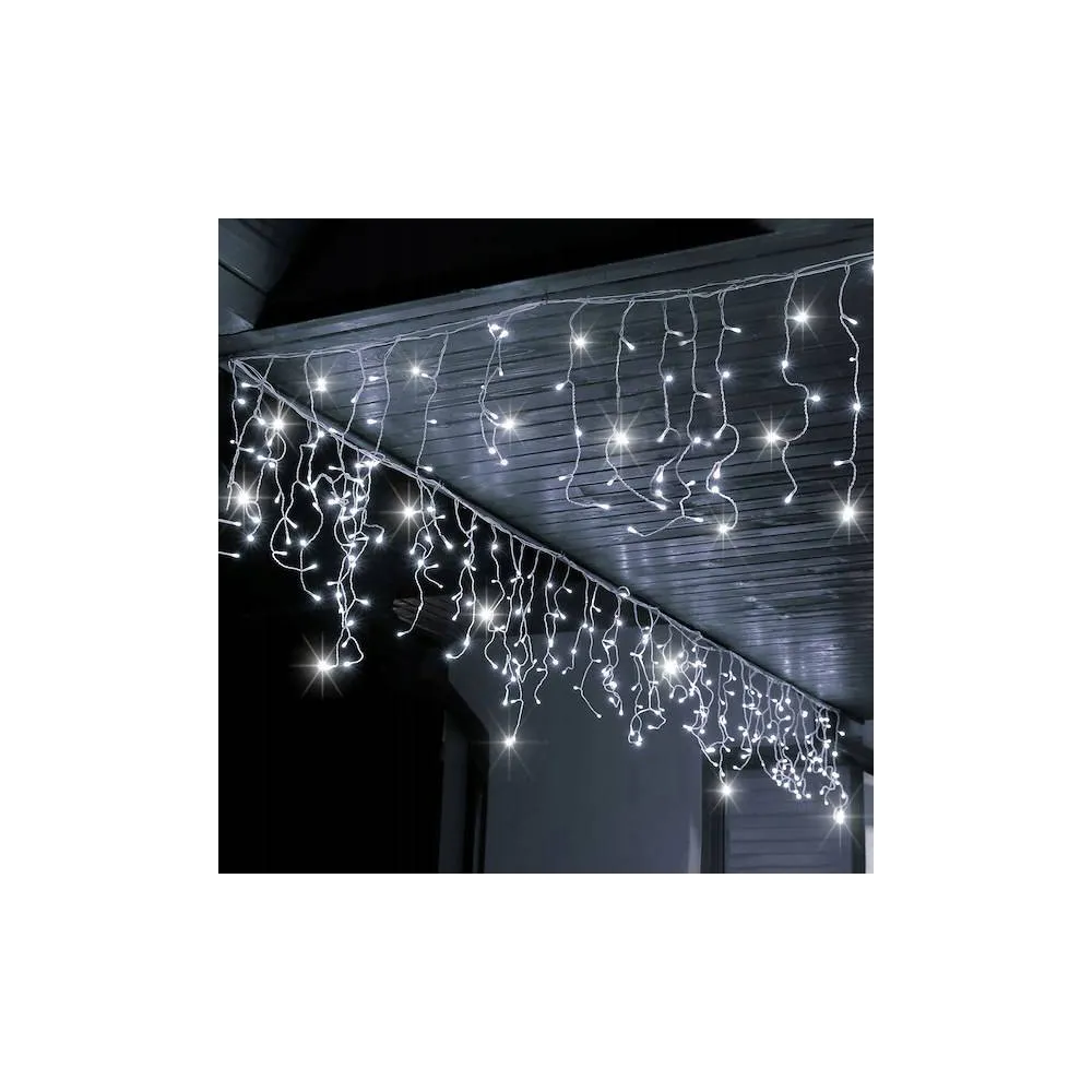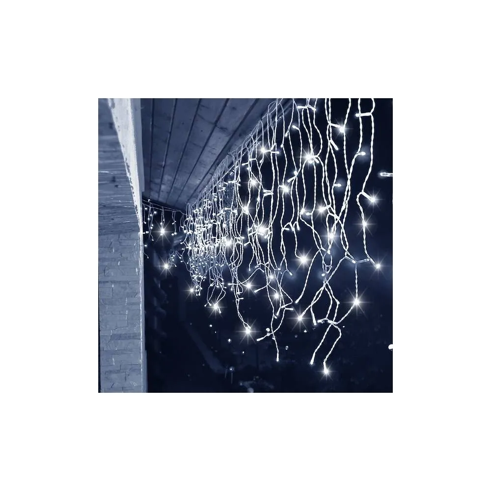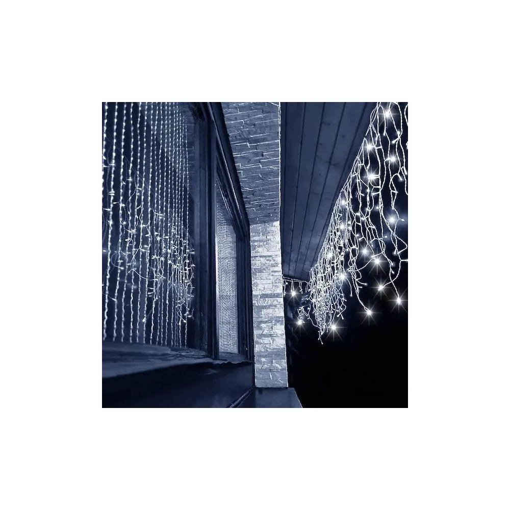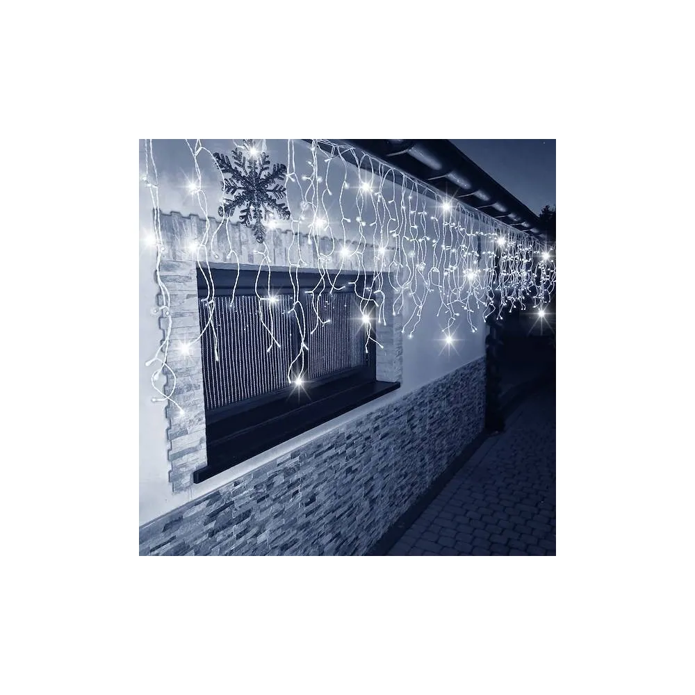 Svetelná reťaz so zábleskami a rôznou výškou voľne visiacich kvapľov. Adaptér na bezpečné napätie, ultra úsporné ľad diódy. Vnútorné aj vonkajšie použitie, vodeodolné prevedenie, krytie IP44. Dĺžka svetelnej časti 12 m, napájací kábel 2,5 m. Farba studená biela + záblesky studená biela, 300 ľad.