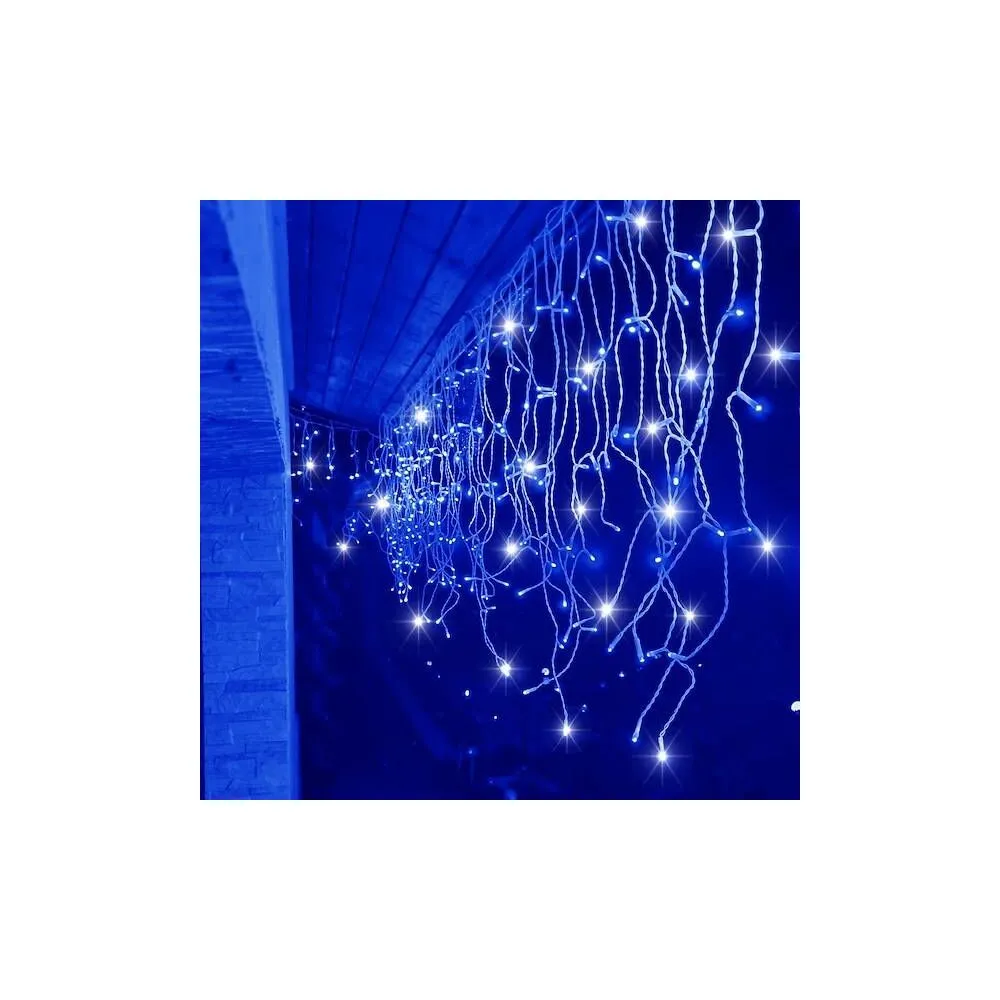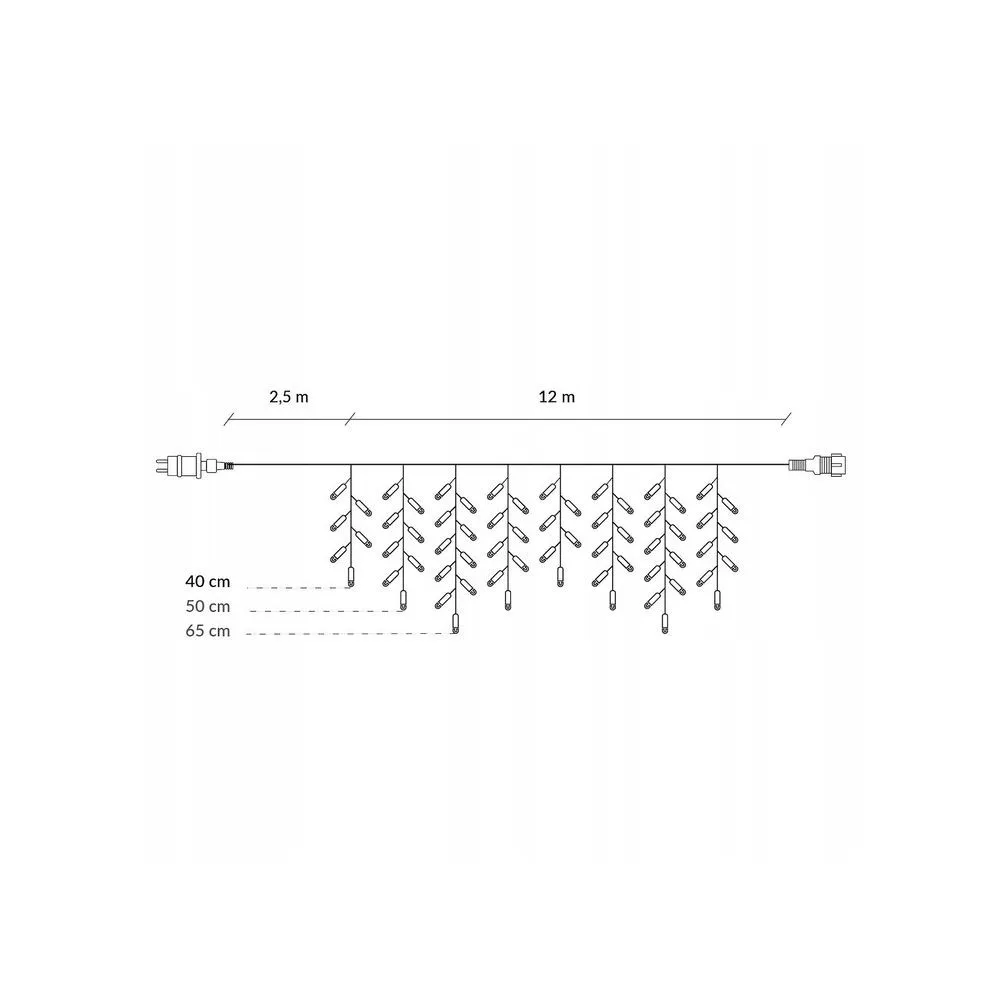 Svetelná reťaz so zábleskami a rôznou výškou voľne visiacich kvapľov. Adaptér na bezpečné napätie, ultra úsporné ľad diódy. Vnútorné aj vonkajšie použitie, vodeodolné prevedenie, krytie IP44. Dĺžka svetelnej časti 12 m, napájací kábel 2,5 m. Farba modrá + záblesky studená biela, 300 ľad.