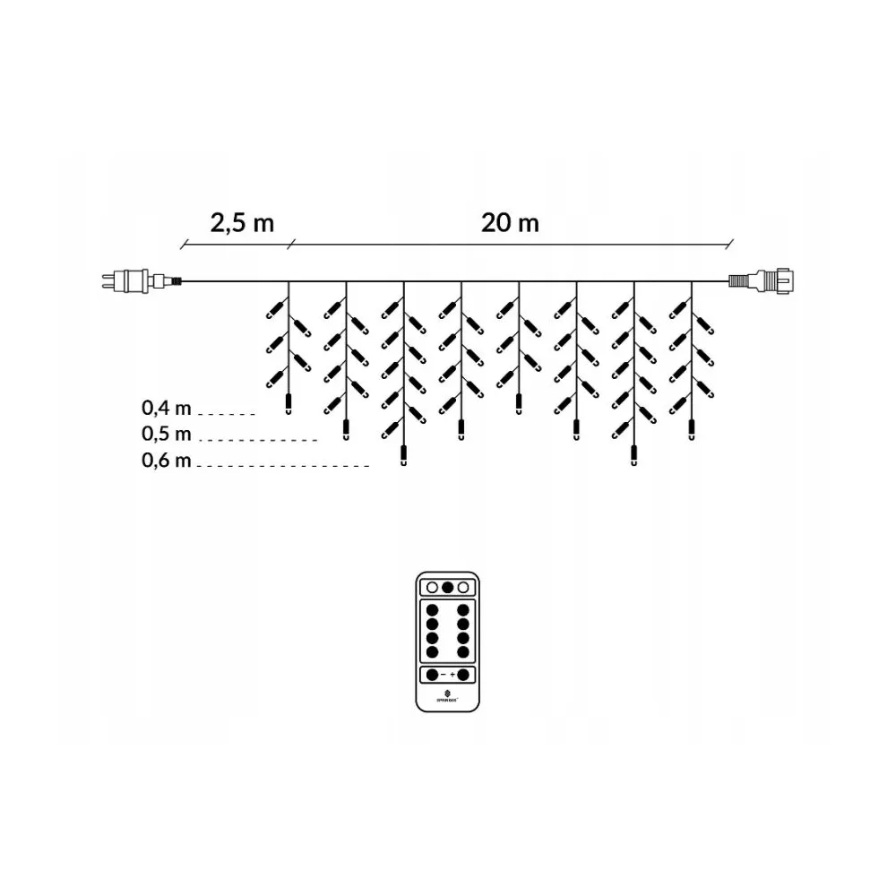 Svetelná reťaz s rôznou výškou voľne visiacich kvapľov. Programátor, 8 svetelných funkcií, diaľkový ovládač, adaptér na bezpečné napätie. Ultra úsporné ľad diódy, vnútorné aj vonkajšie použitie, vodeodolné prevedenie, krytie IP44. Dĺžka svetelnej časti 20 m, napájací kábel 2,5 m. Farba studená biela, 500 ľad.