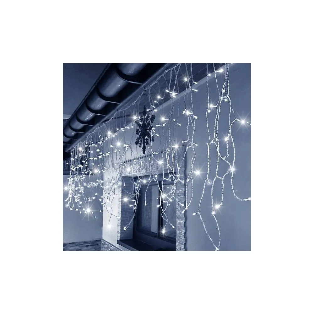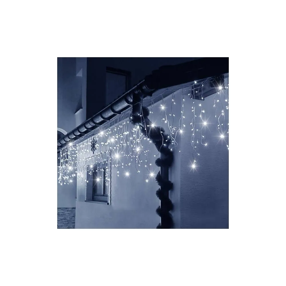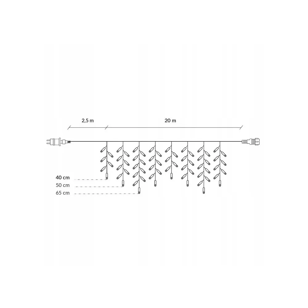 Svetelná reťaz so zábleskami a rôznou výškou voľne visiacich kvapľov. Adaptér na bezpečné napätie, ultra úsporné ľad diódy. Vnútorné aj vonkajšie použitie, vodeodolné prevedenie, krytie IP44. Dĺžka svetelnej časti 20 m, napájací kábel 2,5 m. Farba studená biela + záblesky studená biela, 500 ľad.
