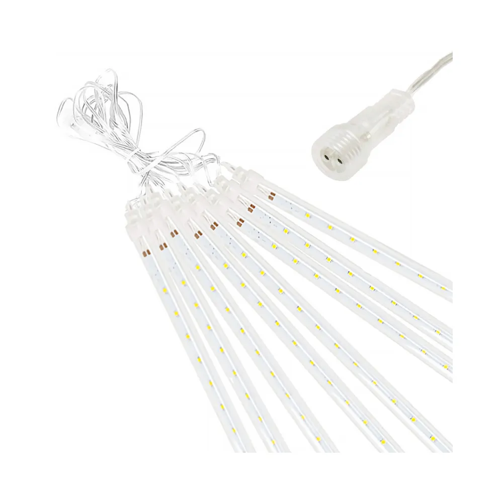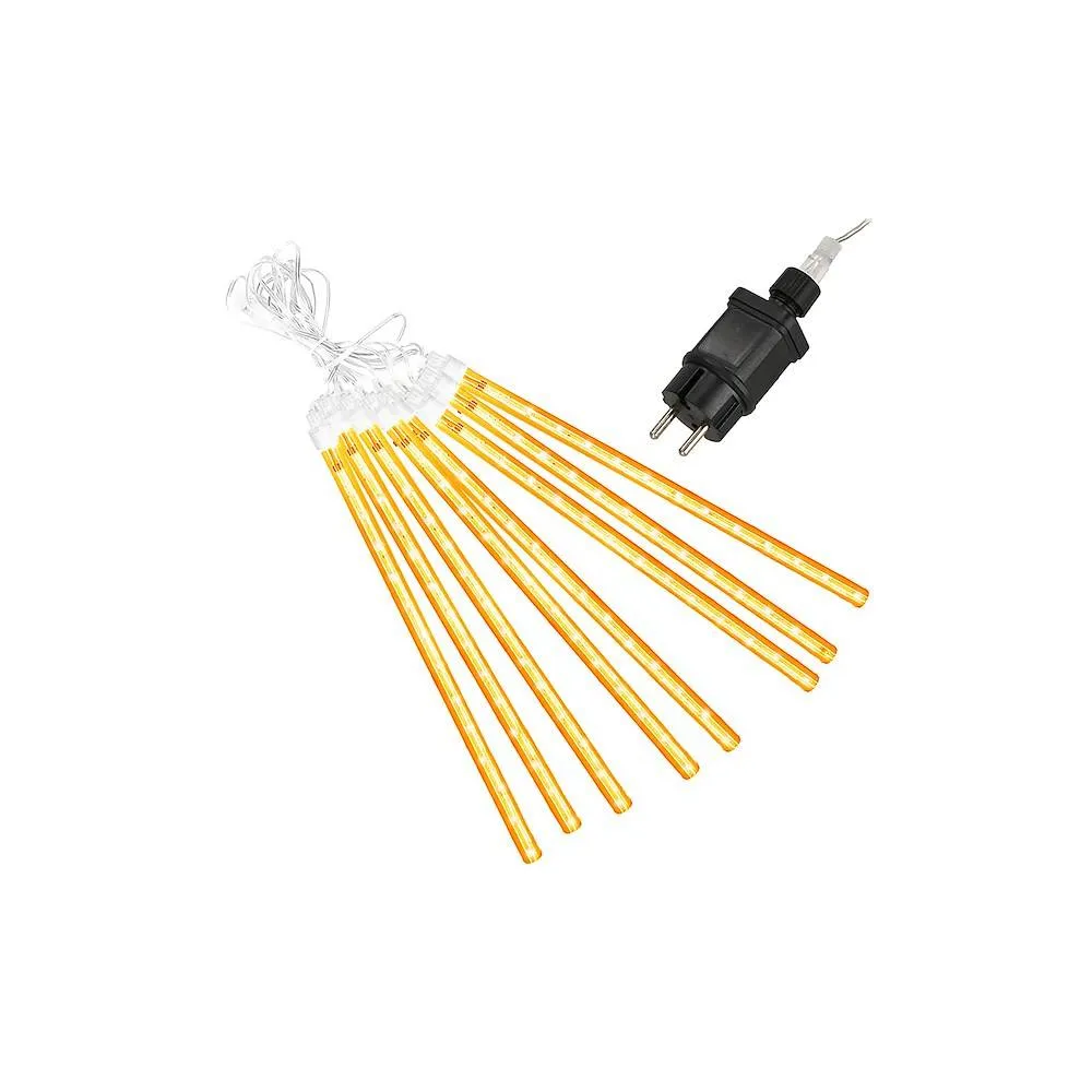 Svetelná reťaz s 8 cencúľmi a pôsobivým efektom padajúceho snehu. Adaptér na bezpečné napätie, ultra úsporné led diódy, transparentný kábel. Vnútorné aj vonkajšie použitie, vodeodolné prevedenie, krytie IP44. Dĺžka svetelnej časti 3 m, napájací kábel 2 m. Farba teplá biela, 144 ľad, výška rampuchov 30 cm.