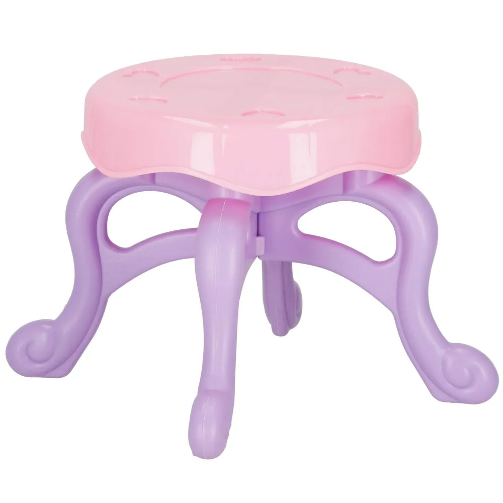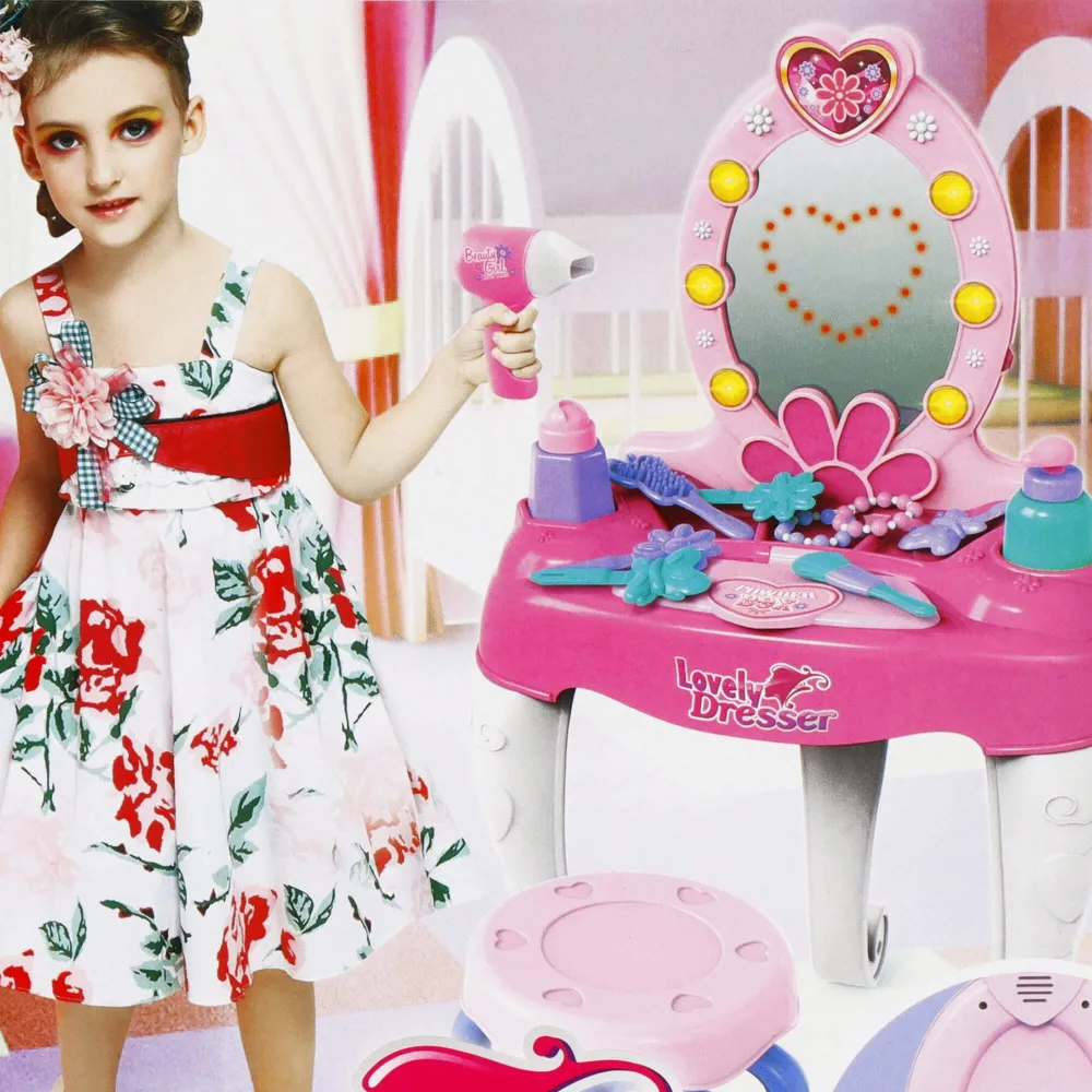 Kúzelná sada pre malé princezné, ktorá ponúka všetko potrebné pre hru na kozmetický salón . Obsahuje toaletný stolík so zrkadlom, stoličku, fén na vlasy, náramky, sponky, kefu, štetce aj nádobky.
