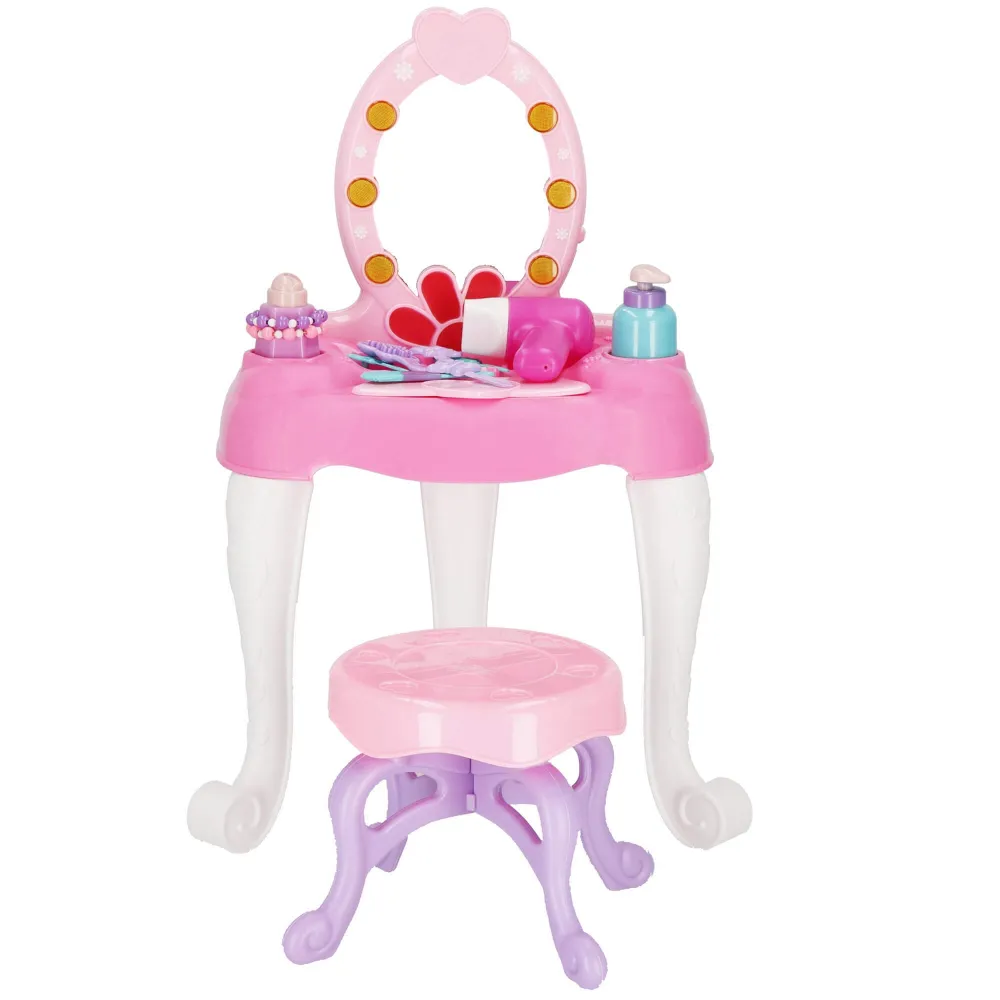 Kúzelná sada pre malé princezné, ktorá ponúka všetko potrebné na hru na kozmetický salón. Obsahuje toaletný stolík so zrkadlom, stoličku, fén na vlasy, náramky, sponky, kefu, štetce aj nádobky. Pre ešte väčšiu zábavu je doplnená o svetelné efekty a pesničky. Napájanie na 3× AA batérie.