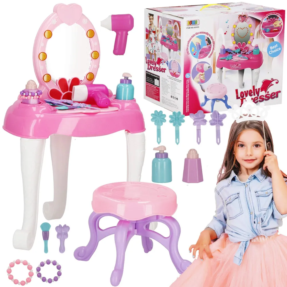 Detský toaletný stolík so zrkadlom 19v1 SPRINGOS je dokonalým kráľovstvom pre malé princezné, ktoré milujú hru na kozmetický salón. Sada obsahuje toaletný stolík so zrkadlom, stoličku, fén na vlasy, náramky, sponky, kefu na vlasy, štetce a nádobky , takže ponúka všetko potrebné pre komplet