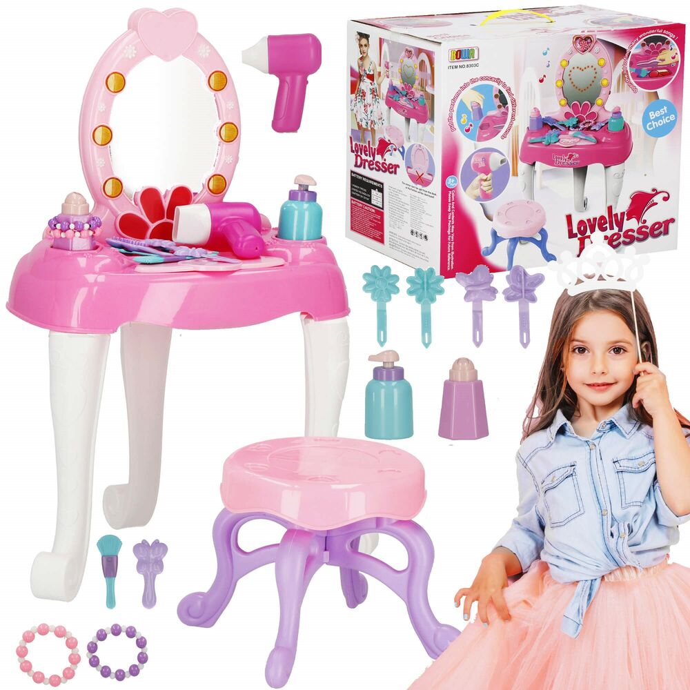 Detský toaletný stolík so zrkadlom 19v1 SPRINGOS je dokonalým kráľovstvom pre malé princezné, ktoré milujú hru na kozmetický salón. Sada obsahuje toaletný stolík so zrkadlom, stoličku, fén na vlasy, náramky, sponky, kefu na vlasy, štetce a nádobky , takže ponúka všetko potrebné pre komplet