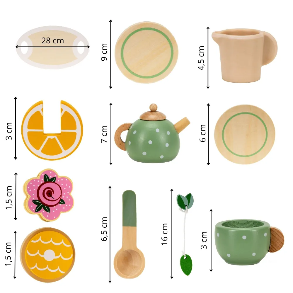 Raňajková/čajová sada pre deti obsahuje 14 drevených dielov pre malých kuchárov a milovníkov hry na domček. Obsahuje realistické miniatúry riadu a potravín v detailnom prevedení a príjemných farbách. Sada je vyrobená z hladko brúseného dreva s nezávadnými farbami, spĺňa normy CE. Hra rozvíja koordináciu, kreativitu a predstavivosť a učí deti formou zábavy.