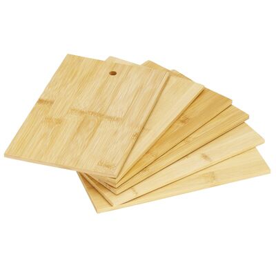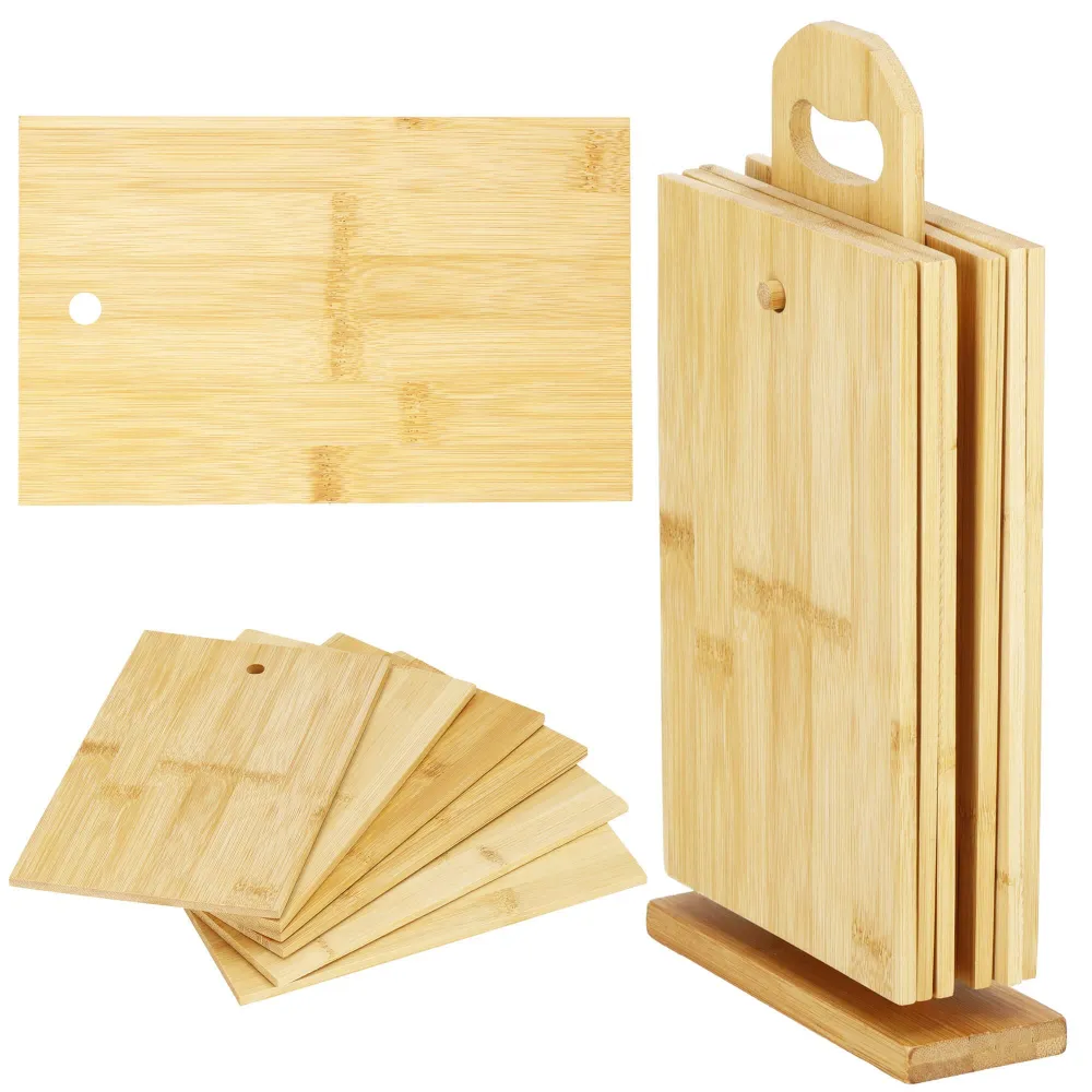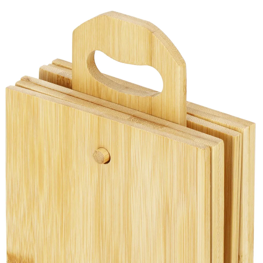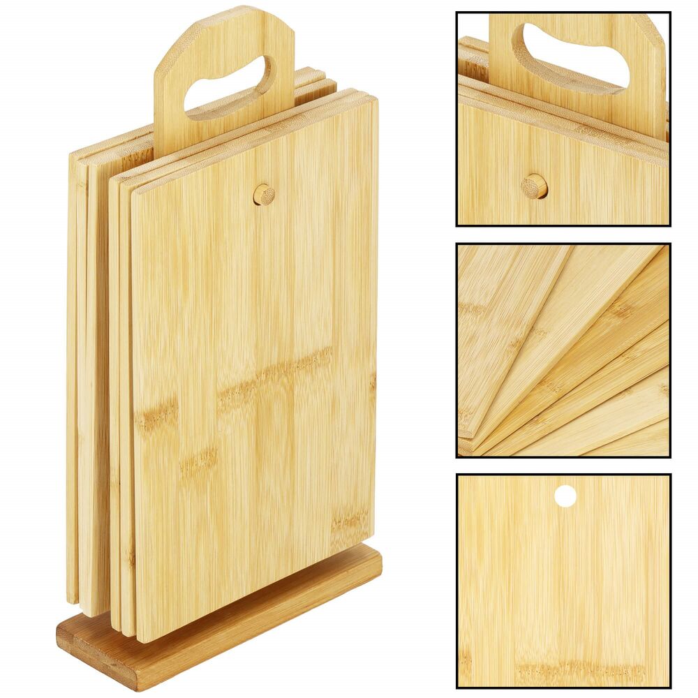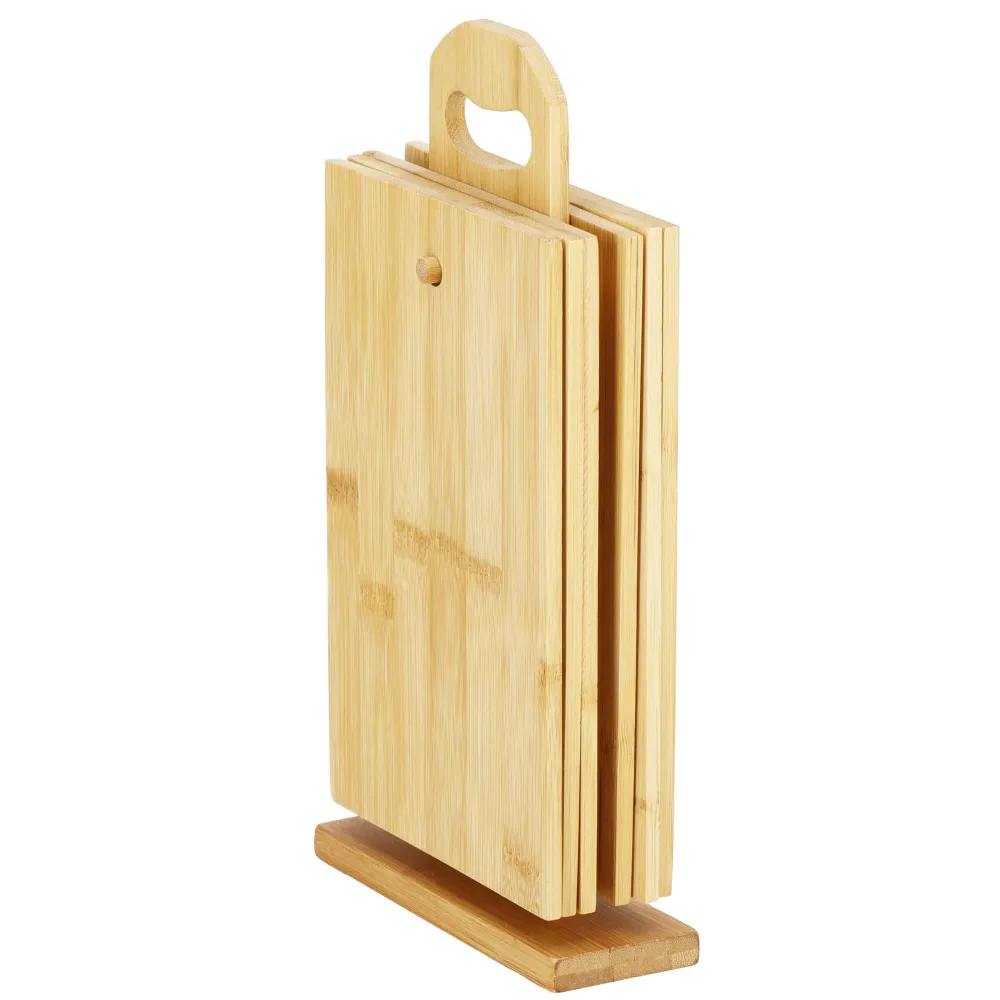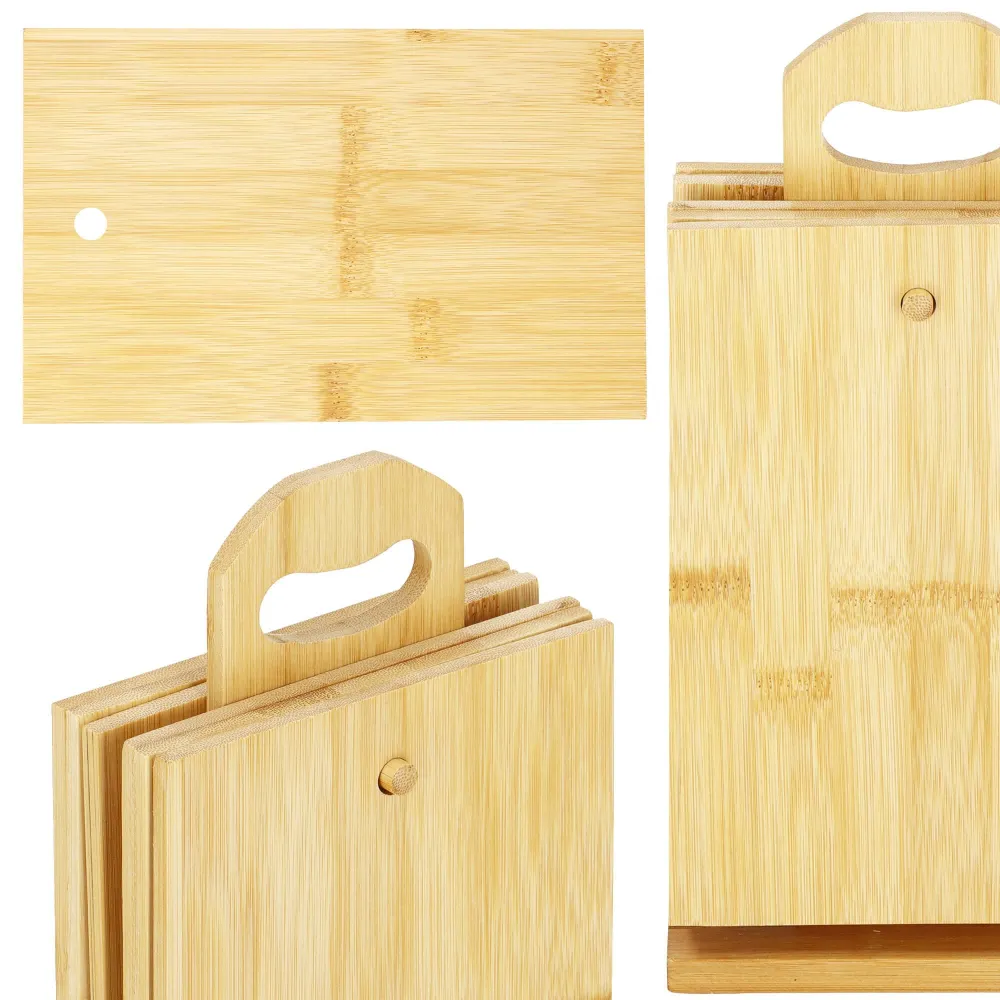 Bambusová doska bude skvelým doplnkom do kuchyne. Či už budete pripravovať občerstvenie a bude vám chýbať priestor na krájanie , alebo pri stolovaní či obsluhovaní , doska má multifunkčné využitie . Ide o certifikovaný výrobok, schválený pre styk s potravinami. Sada obsahuje 6 dosiek a praktický stojan s rukoväťou, ktorý vám pomôže mať všetky na jednom mieste.