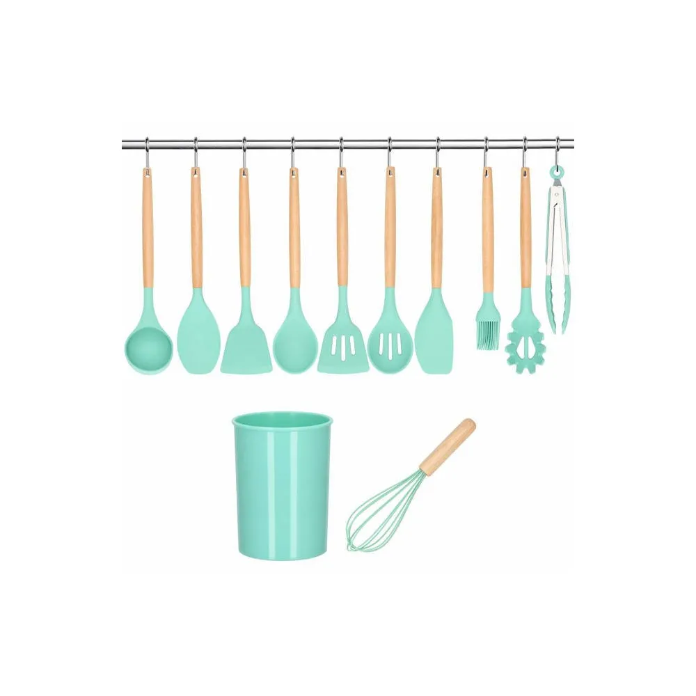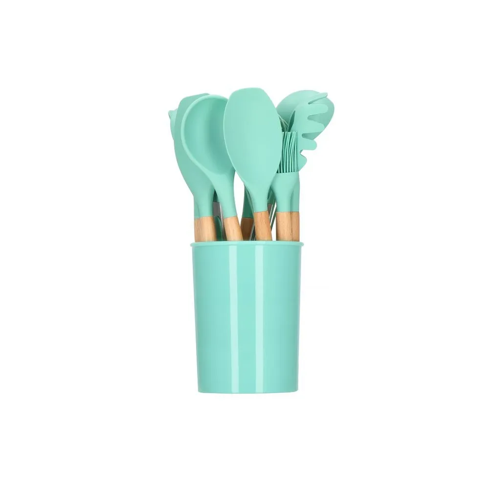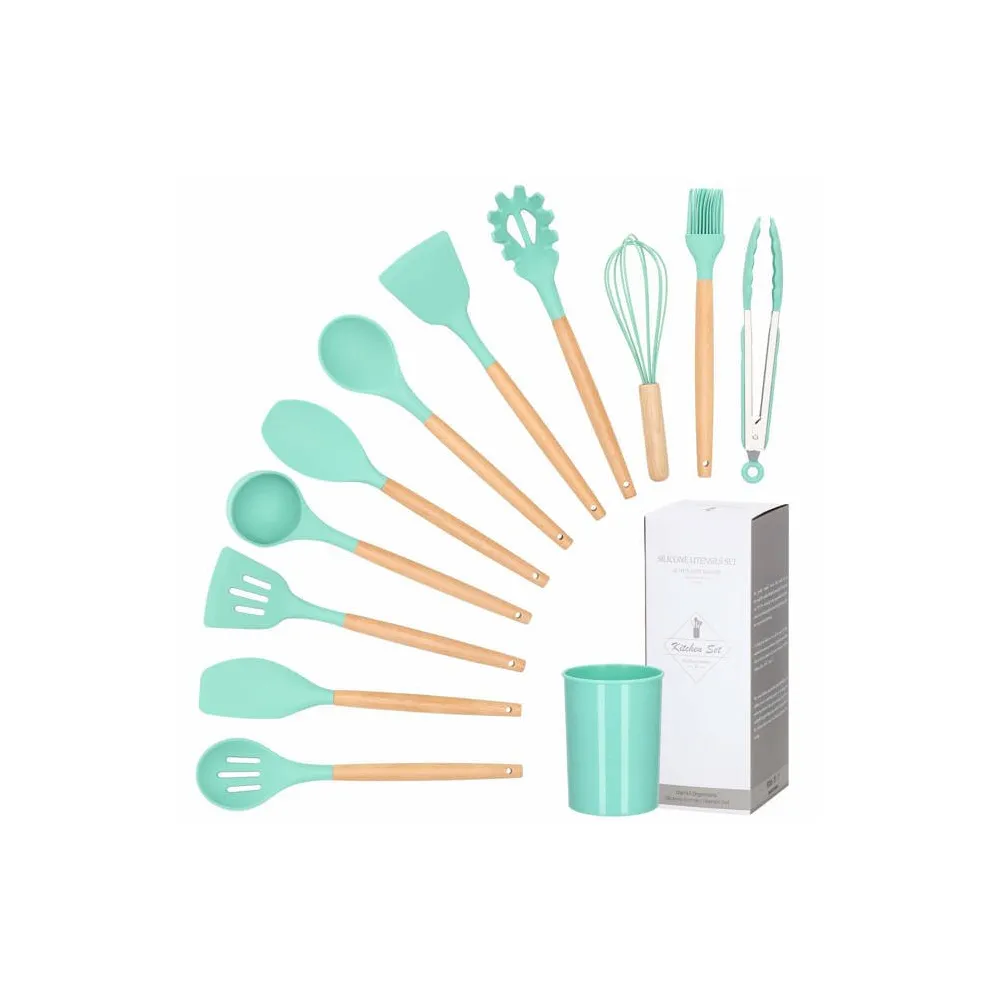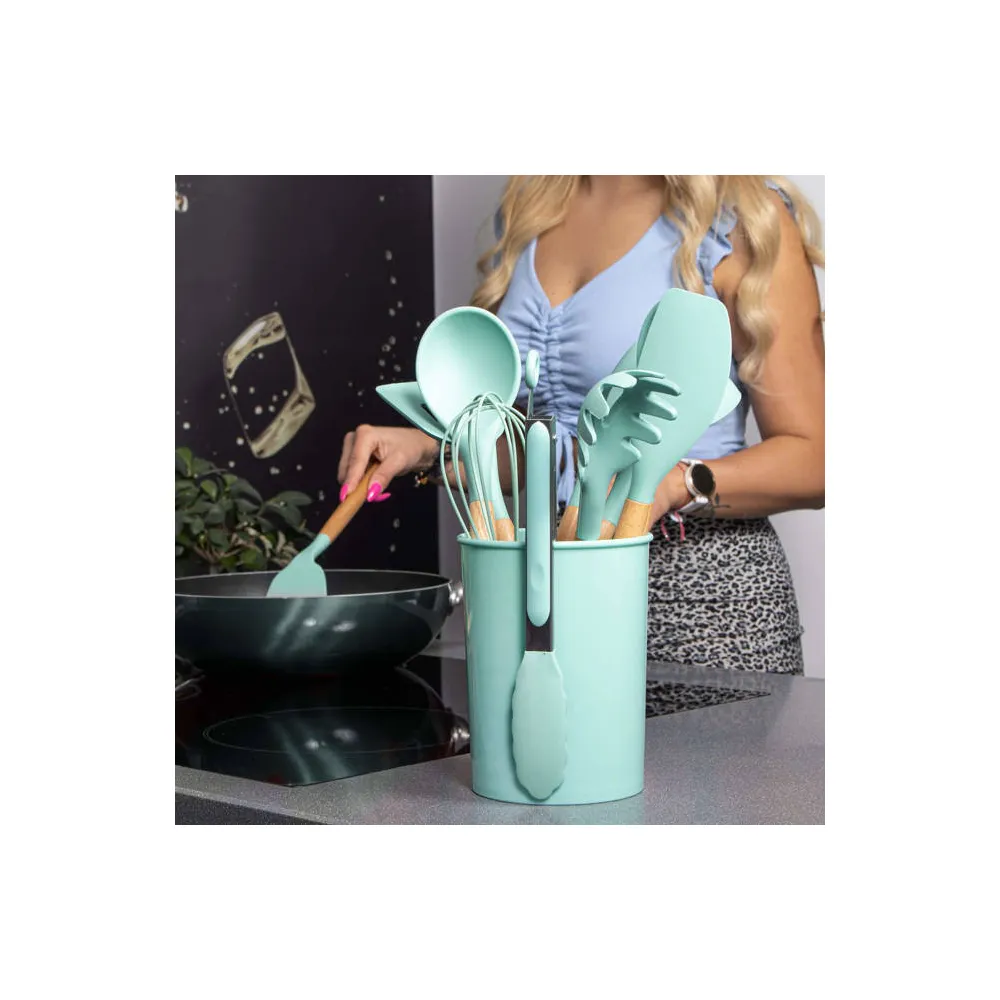 Kuchynská sada 12ks nástrojov v praktickom stojane. Veľmi odolný silikónový materiál, bambusové rukoväte. Nepoškriabe riad, má nepriľnavý povrch, ľahko sa udržuje. Možnosť uchytenia na závesnú lištu, vhodné aj do umývačky riadu. Všetky potrebné nástroje na varenie a pečenie.