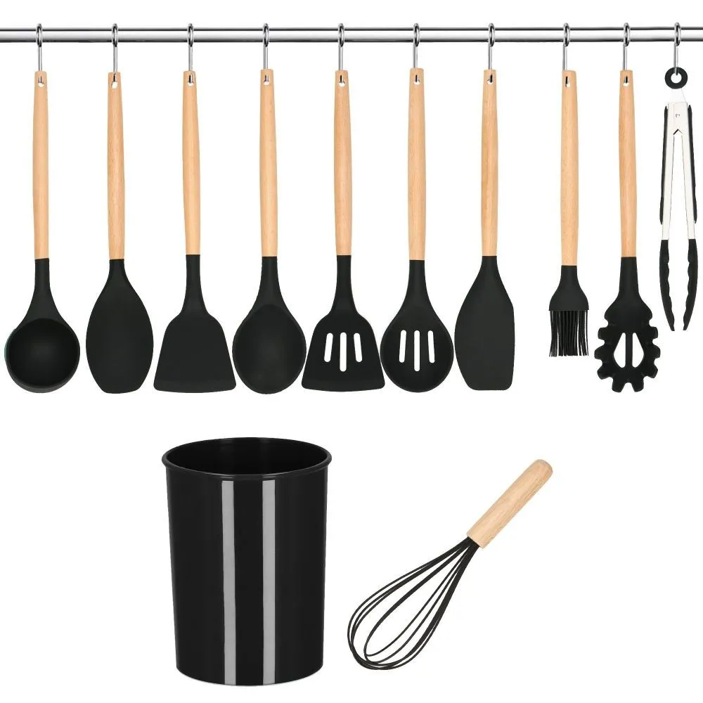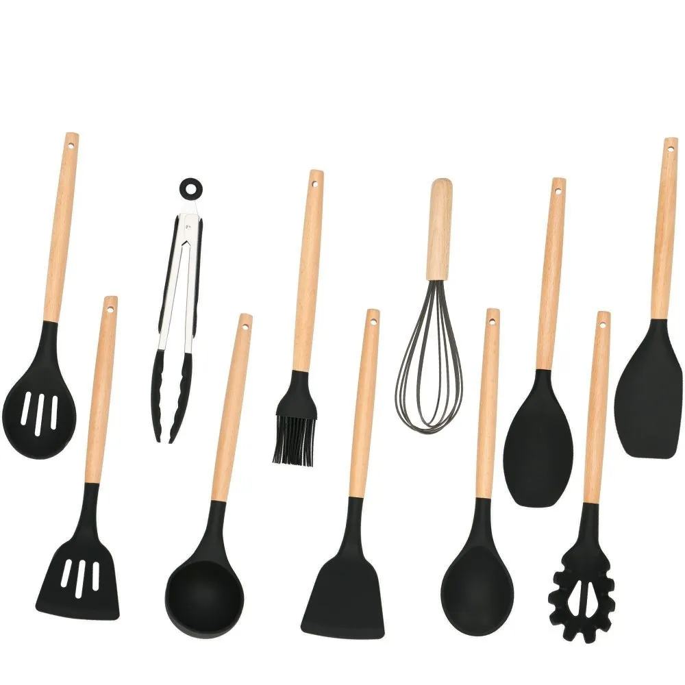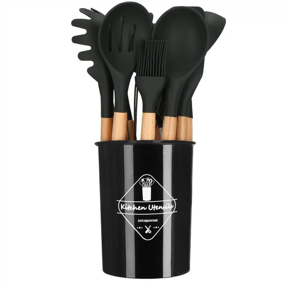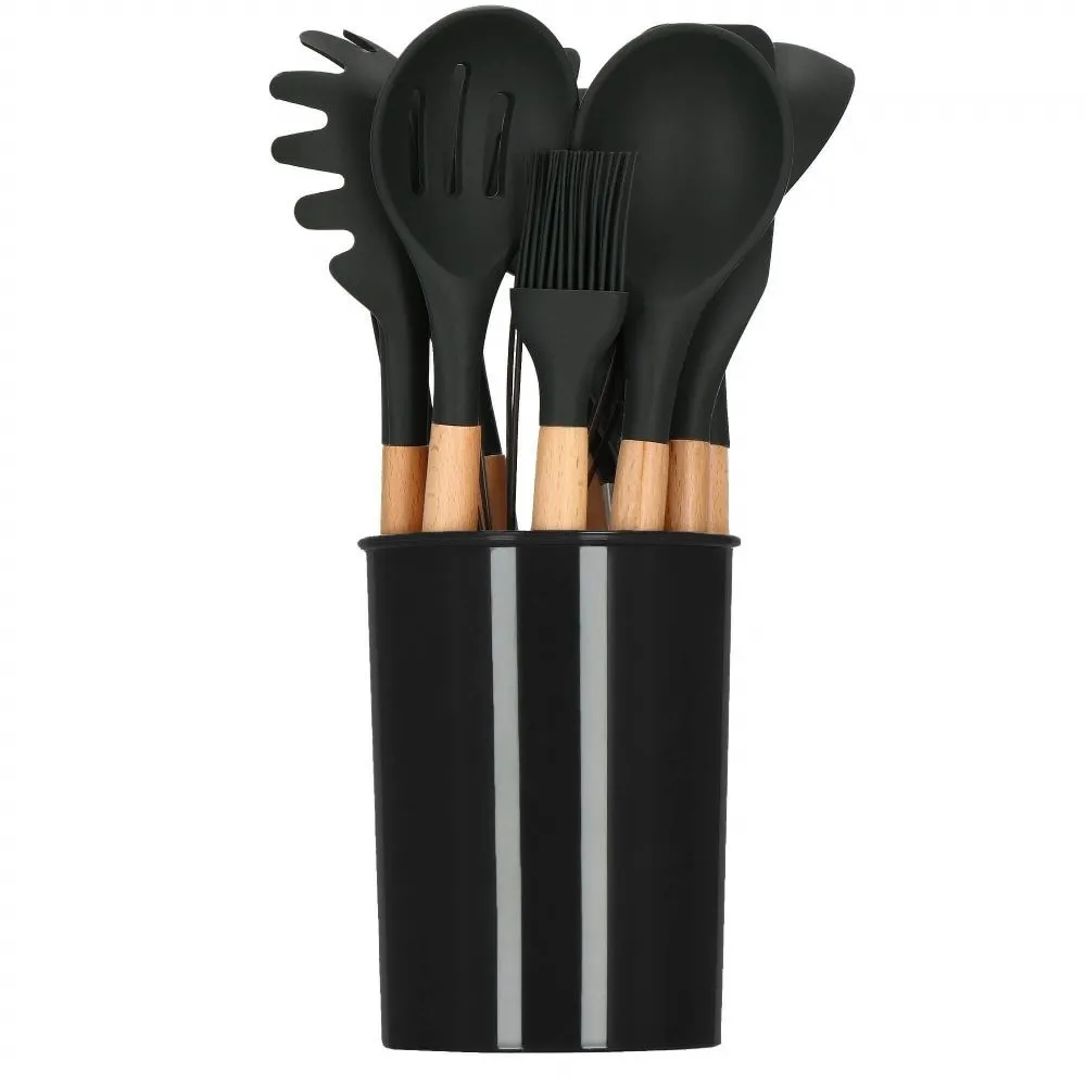 Kuchynská sada 12ks nástrojov v praktickom stojane. Veľmi odolný silikónový materiál, bambusové rukoväte. Nepoškriabe riad, má nepriľnavý povrch, ľahko sa udržuje. Možnosť uchytenia na závesnú lištu, vhodné aj do umývačky riadu. Všetky potrebné nástroje na varenie a pečenie.