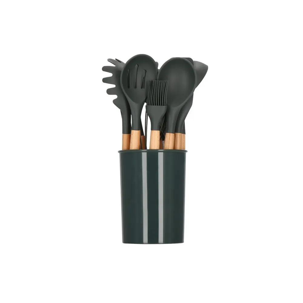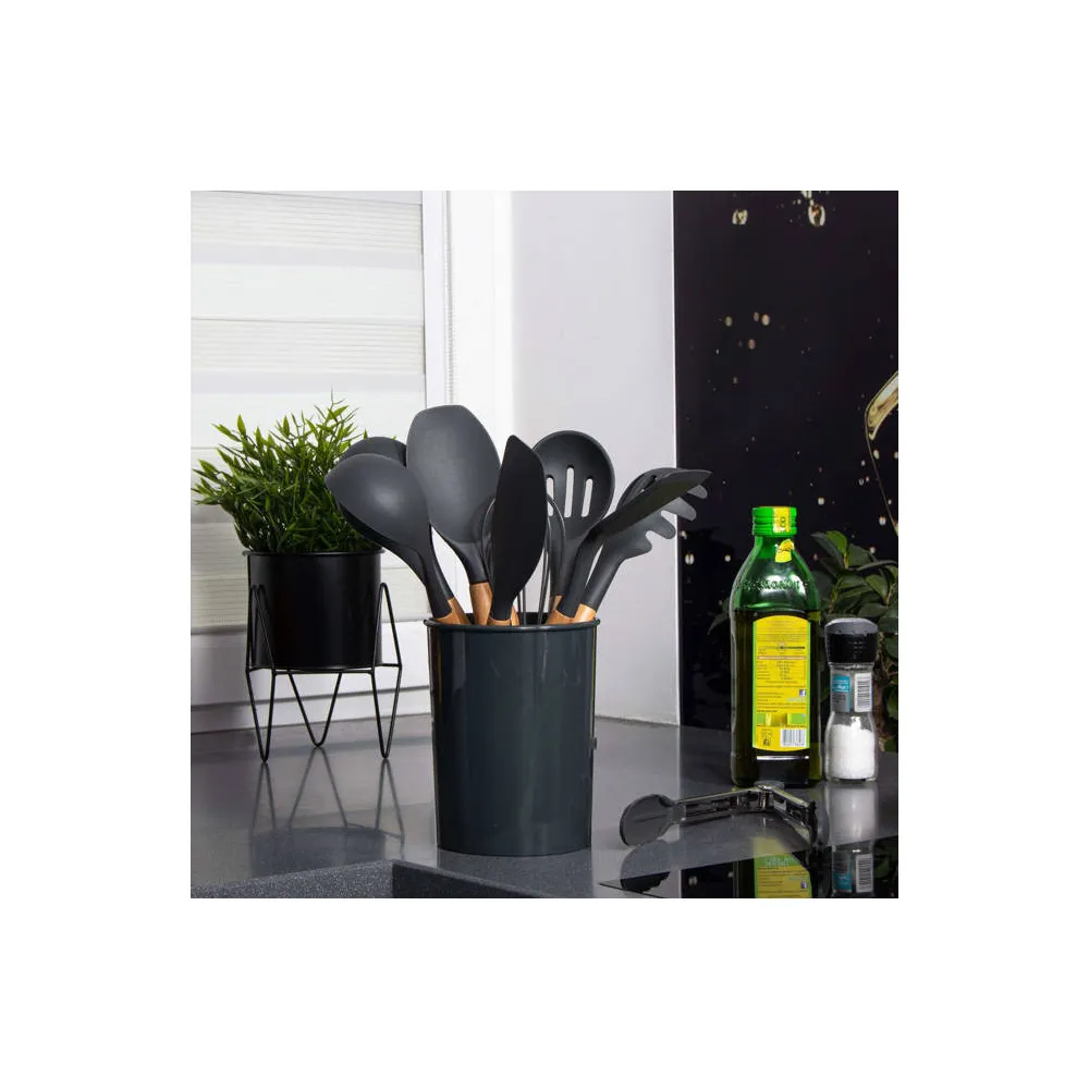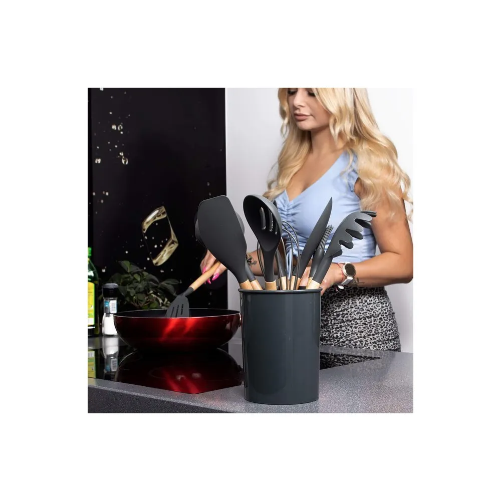 Kuchynská sada 12ks nástrojov v praktickom stojane. Veľmi odolný silikónový materiál, bambusové rukoväte. Nepoškriabe riad, má nepriľnavý povrch, ľahko sa udržuje. Možnosť uchytenia na závesnú lištu, vhodné aj do umývačky riadu. Všetky potrebné nástroje na varenie a pečenie.