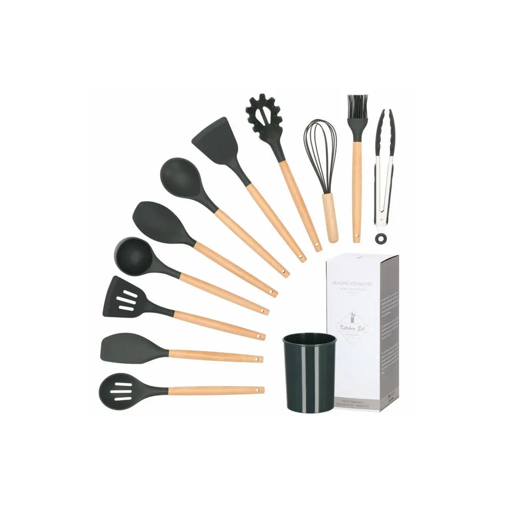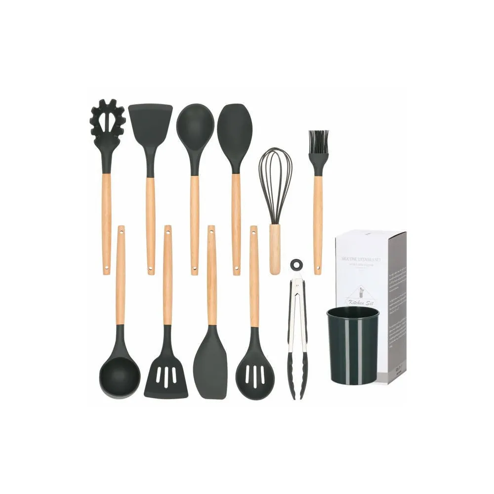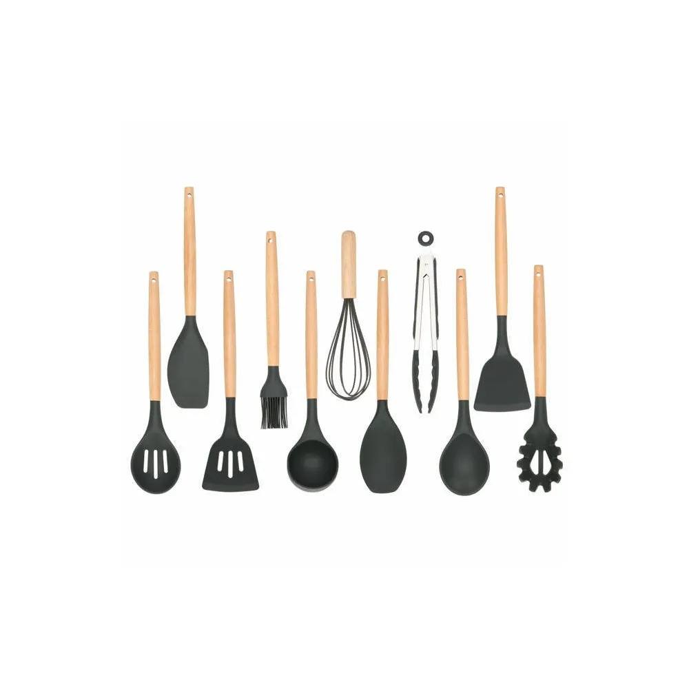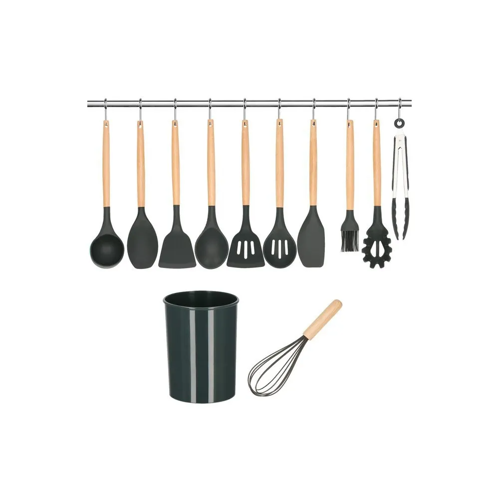 Kuchynská sada 12ks nástrojov v praktickom stojane. Veľmi odolný silikónový materiál, bambusové rukoväte. Nepoškriabe riad, má nepriľnavý povrch, ľahko sa udržuje. Možnosť uchytenia na závesnú lištu, vhodné aj do umývačky riadu. Všetky potrebné nástroje na varenie a pečenie.